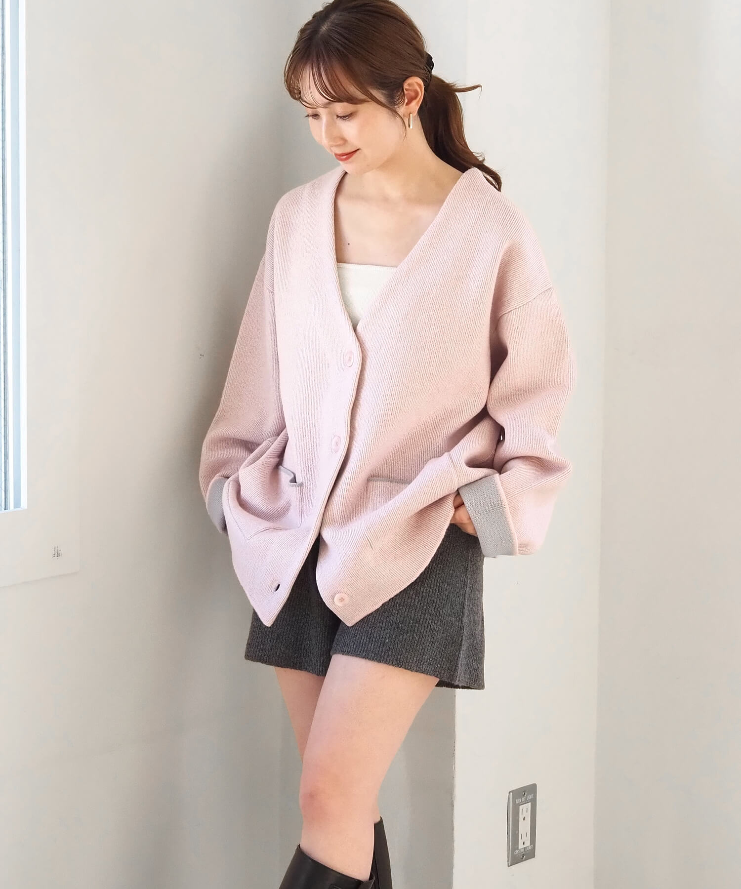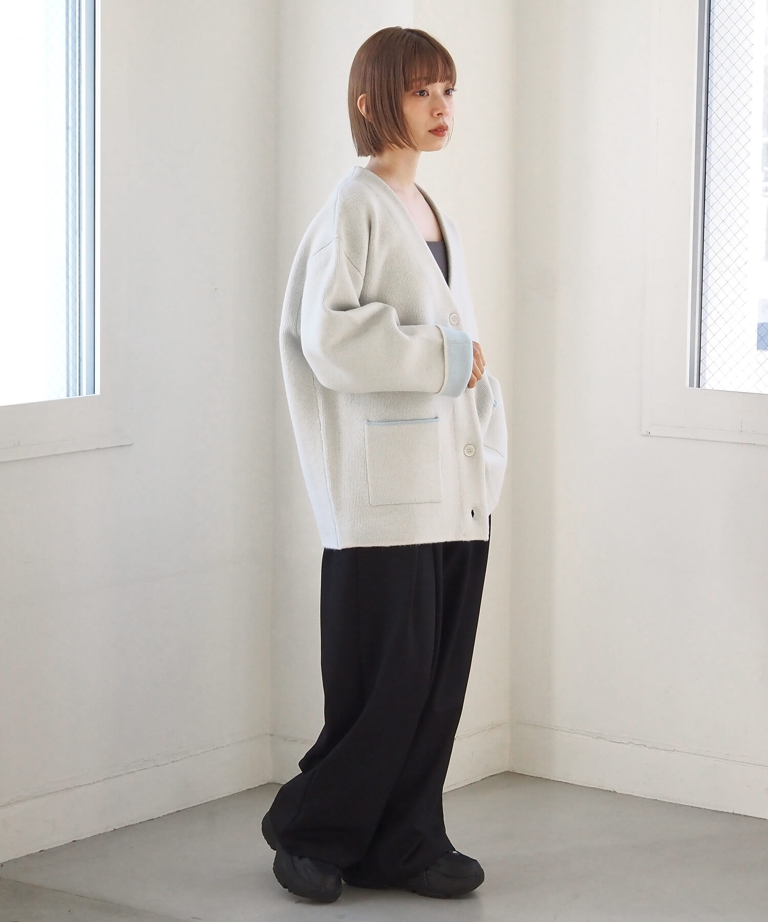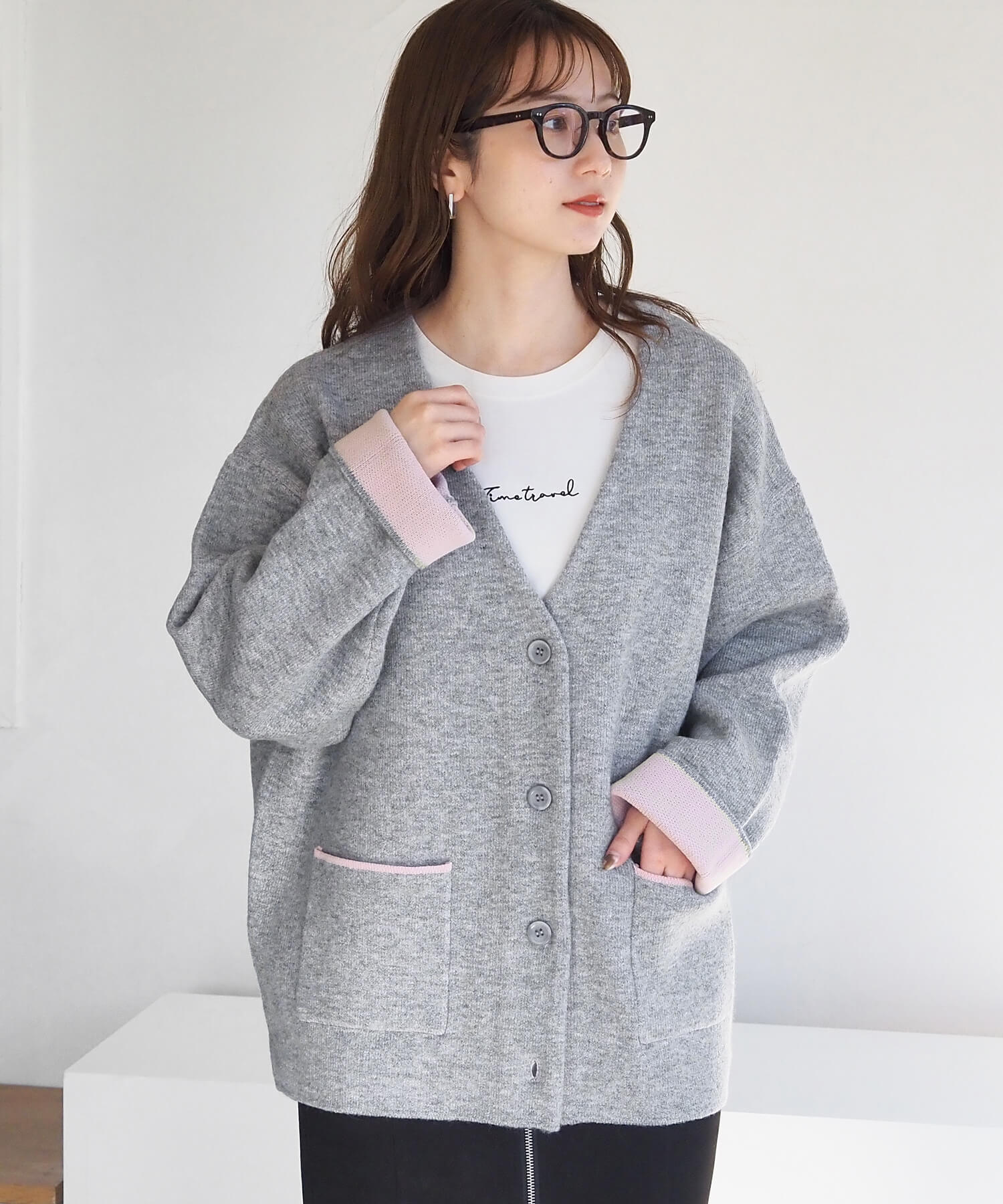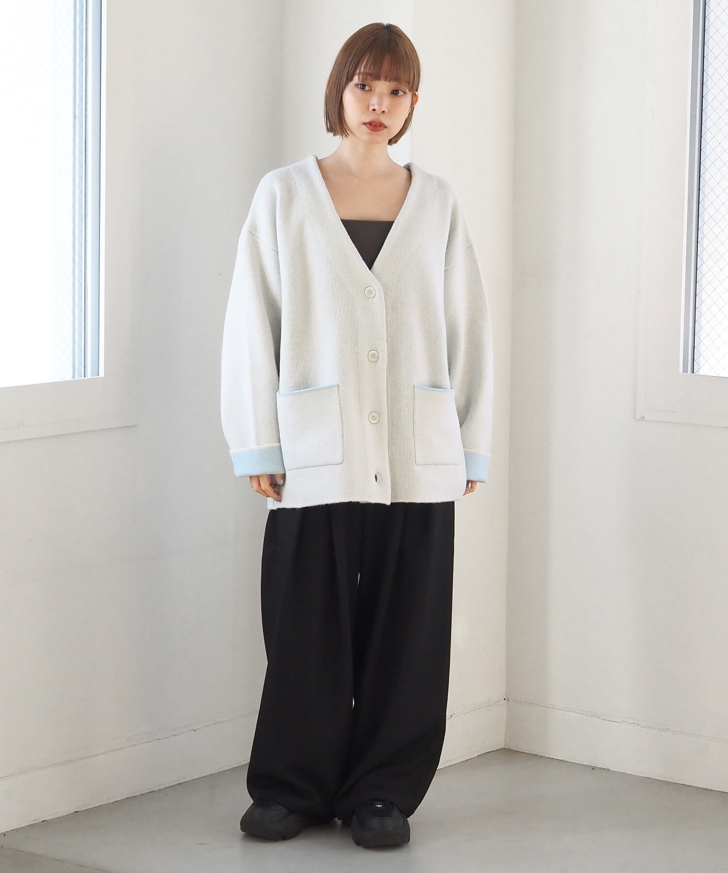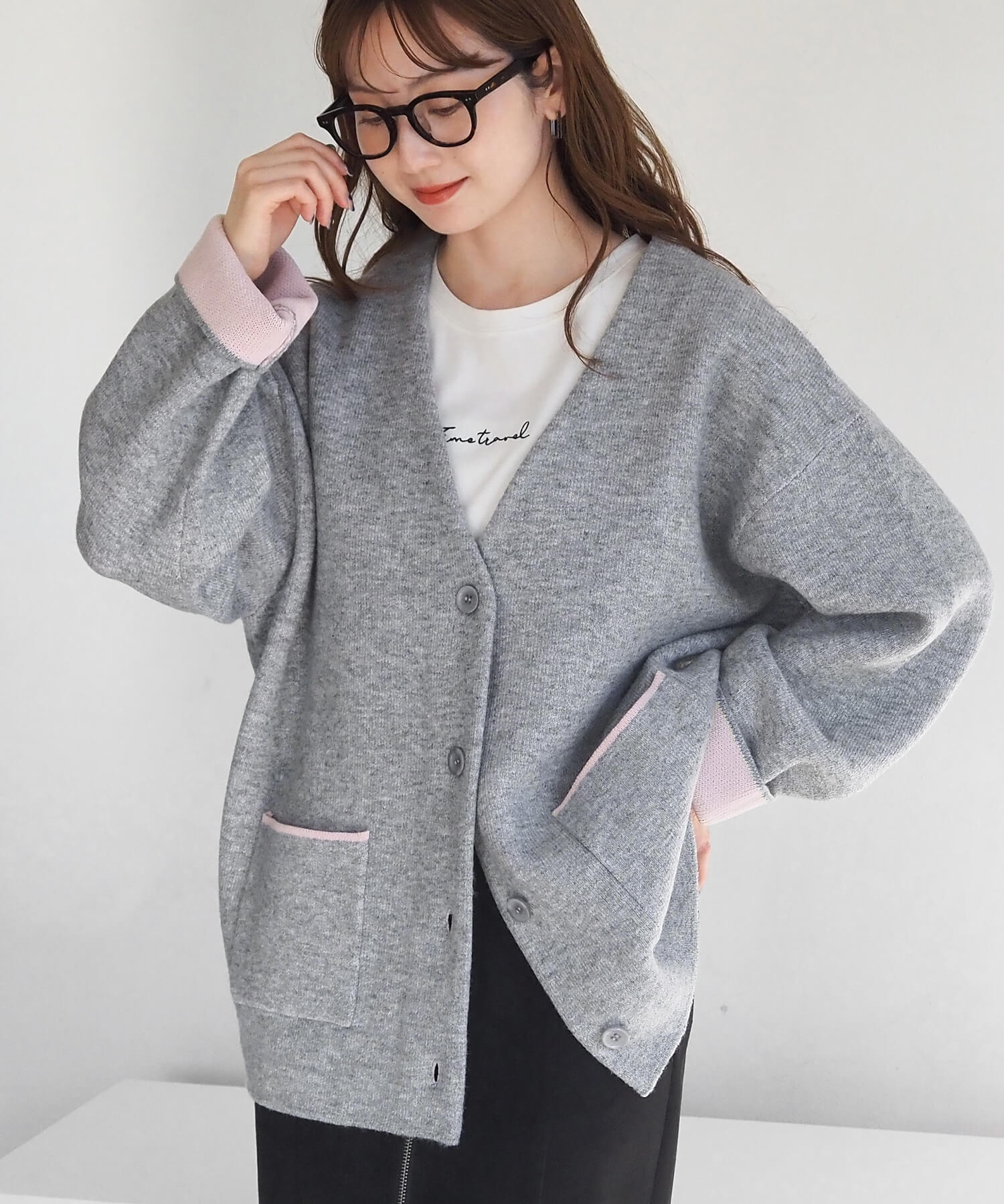 ・バイカラーデザインが着映えする、VネックのBIGカーディガンです。