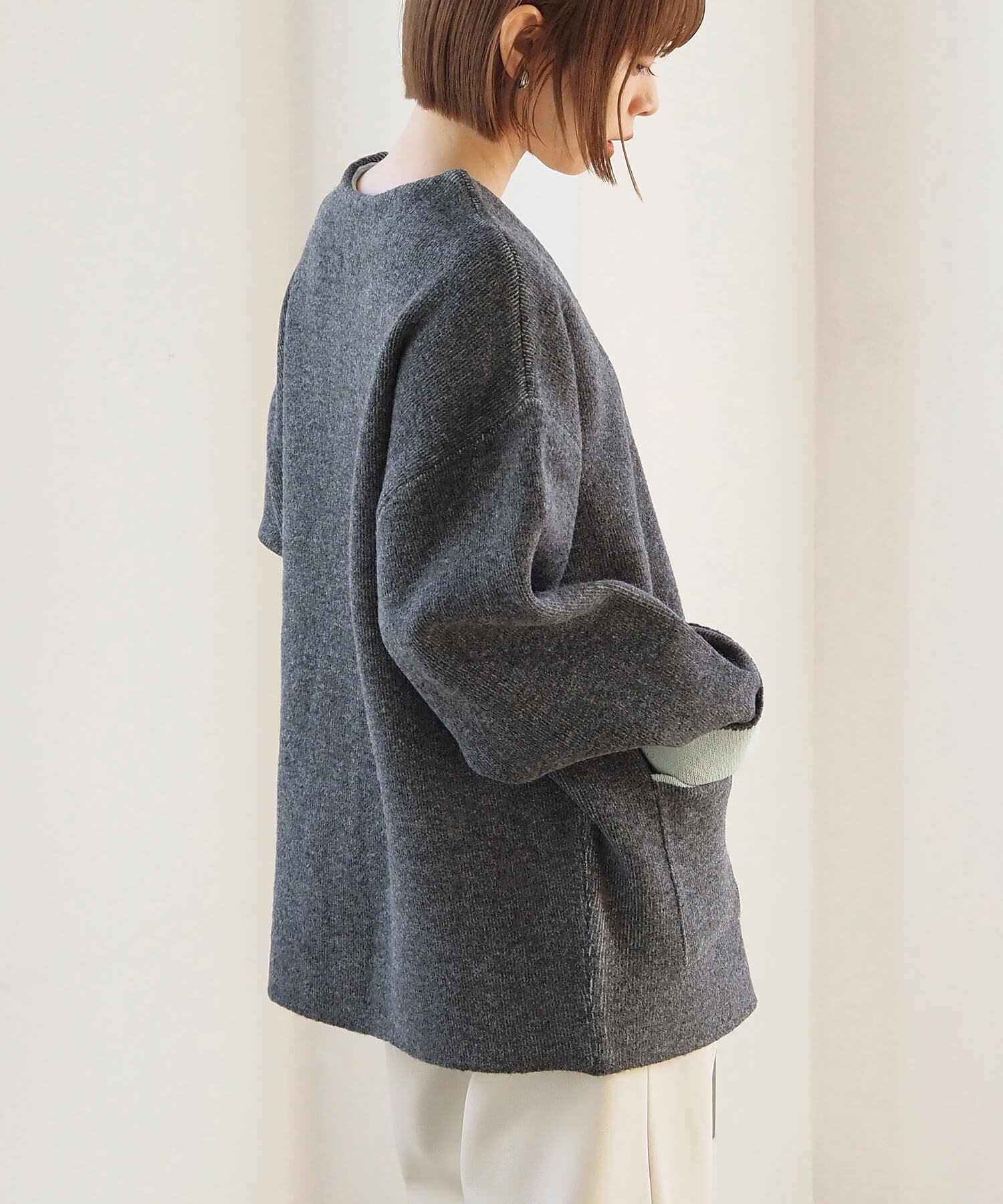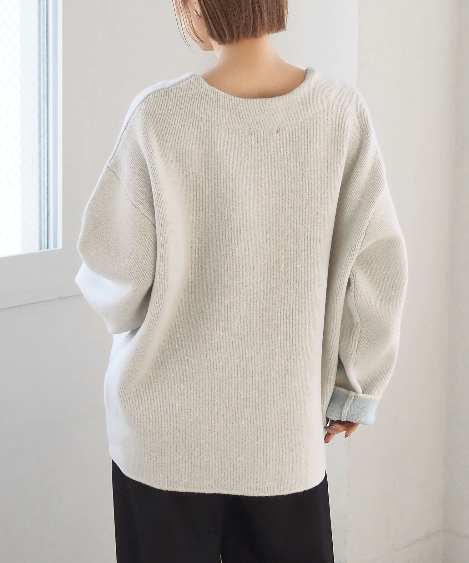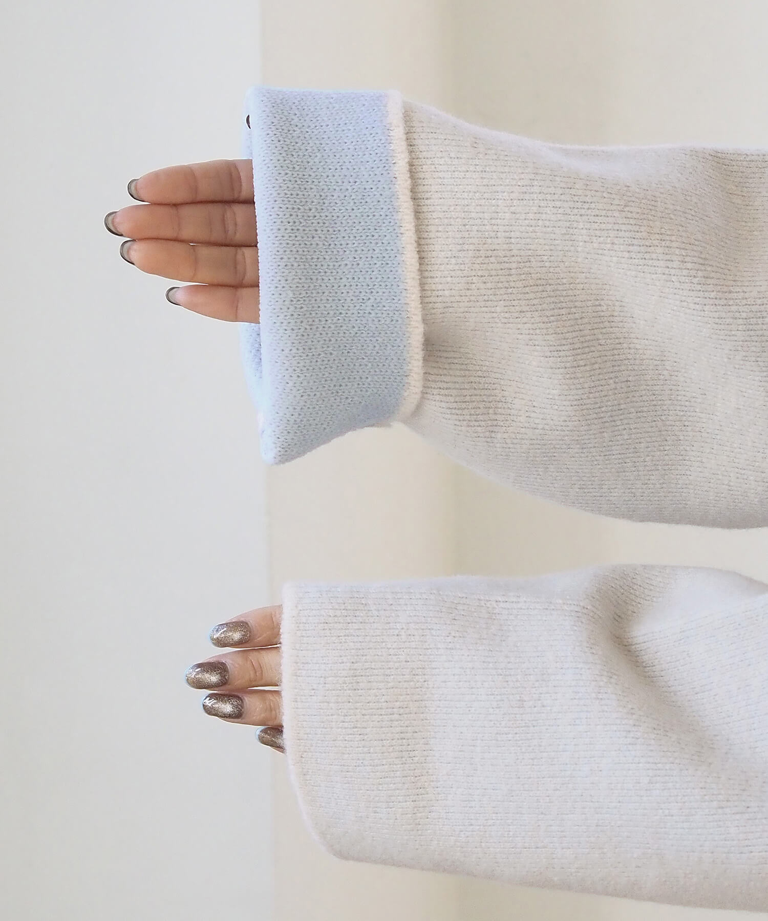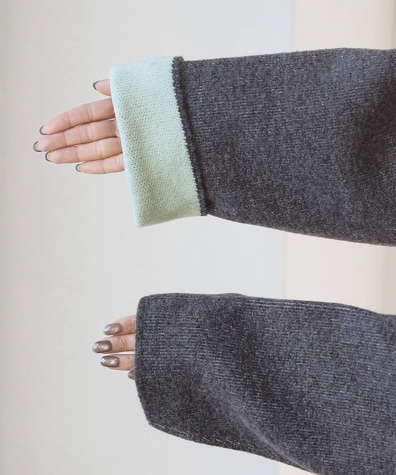 ・2色のニットを合わせたダブルフェイス仕様なので、袖の折り返し幅は気分でアレンジが可能。