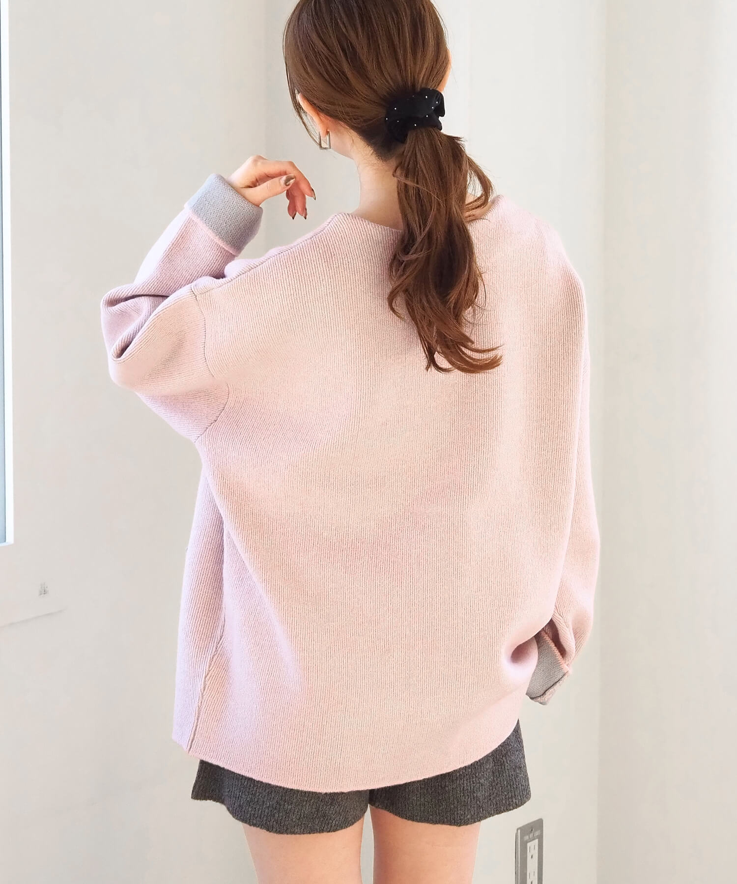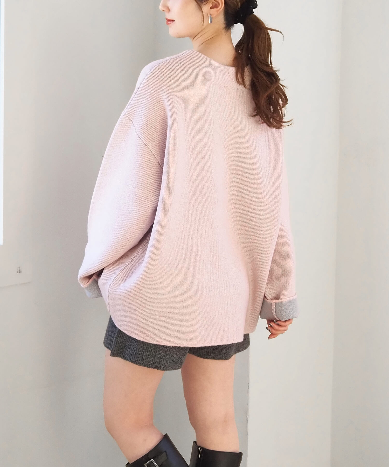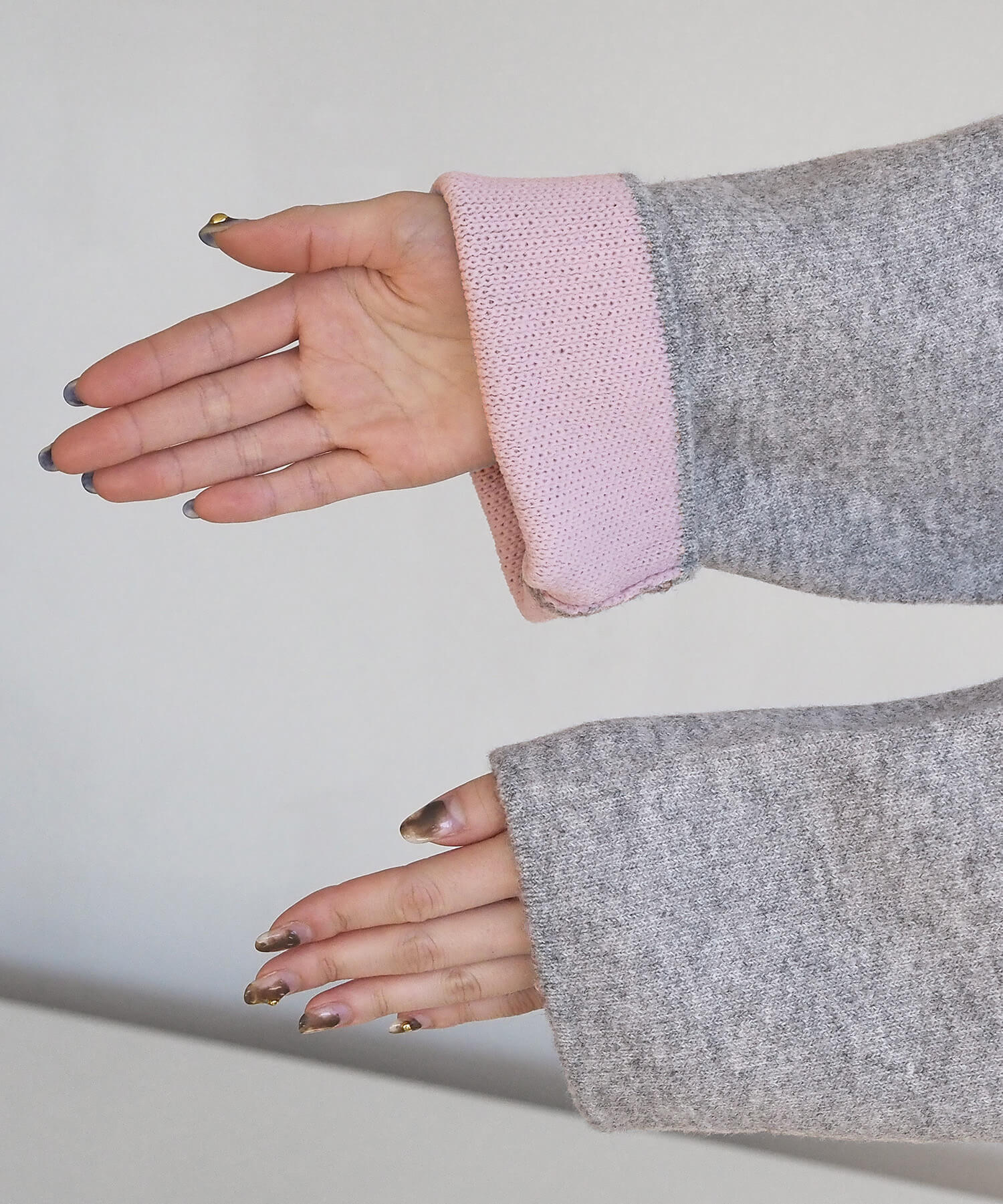 ・2色のニットを合わせたダブルフェイス仕様なので、袖の折り返し幅は気分でアレンジが可能。
