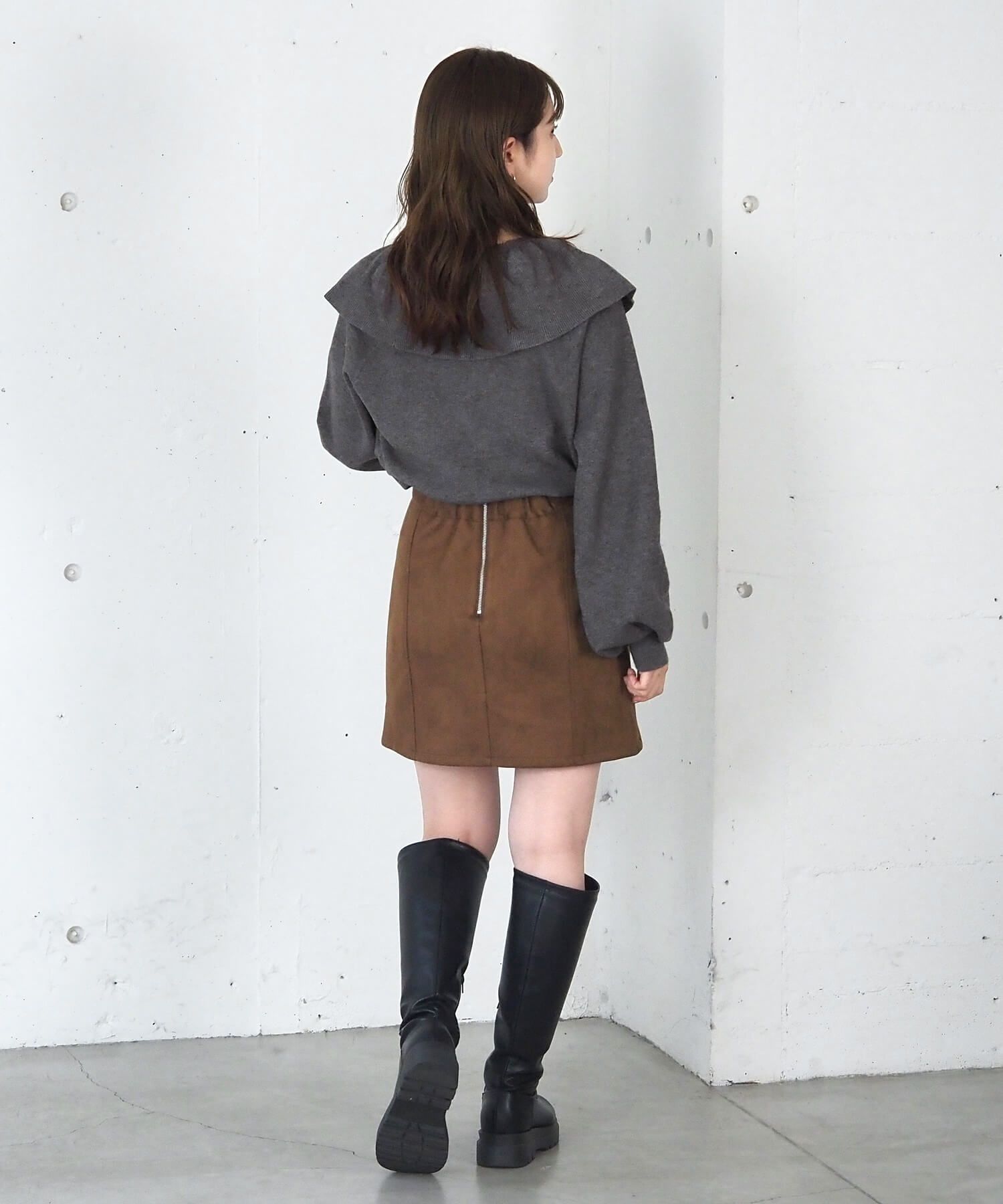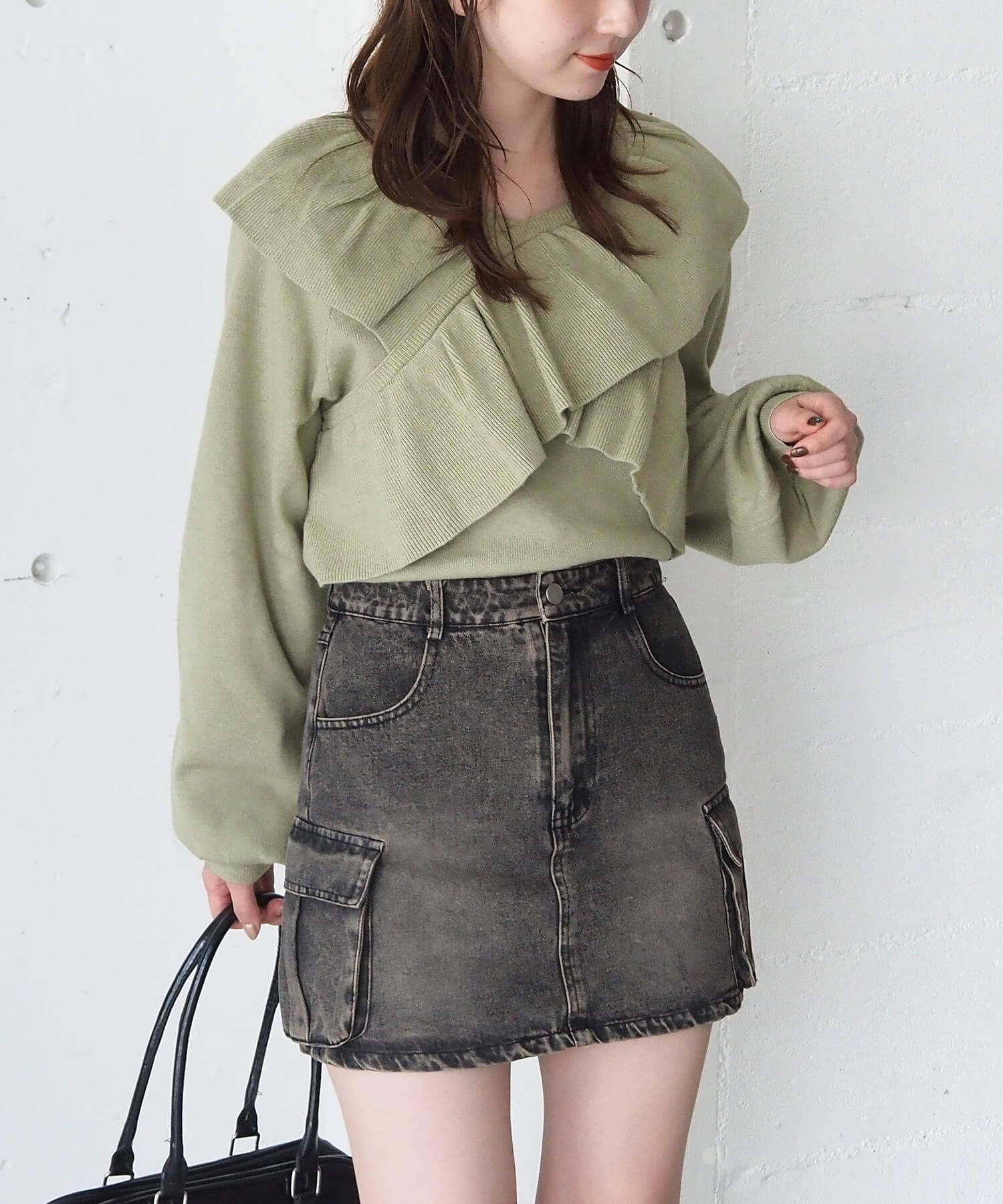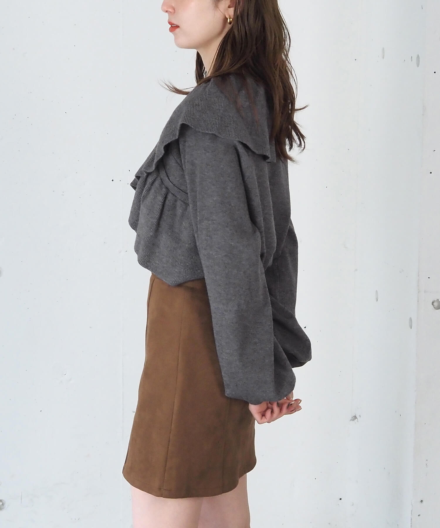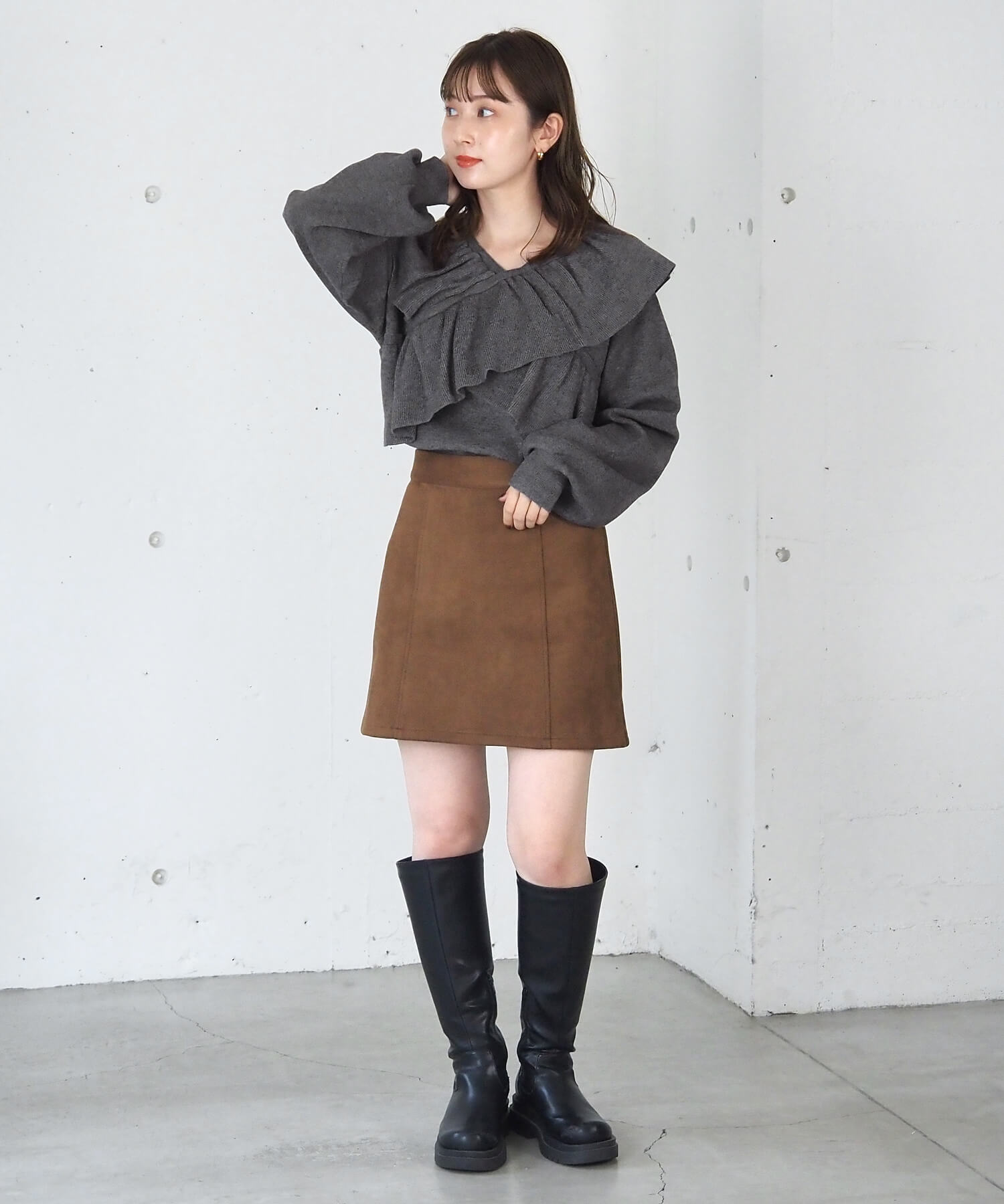 ・スウェード生地やレザーでトレンドコーデに。たっぷりのフリルデザインやリブ使いで華やかな高見えコーデが完成します。
