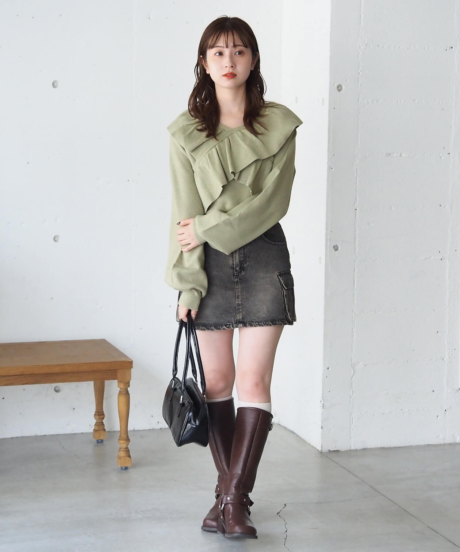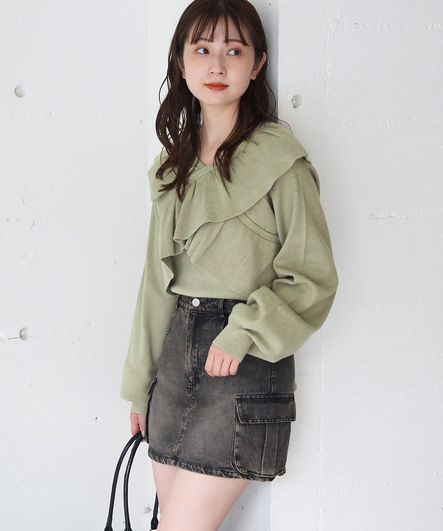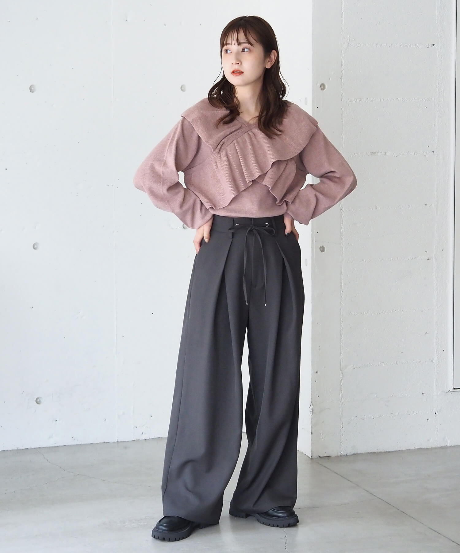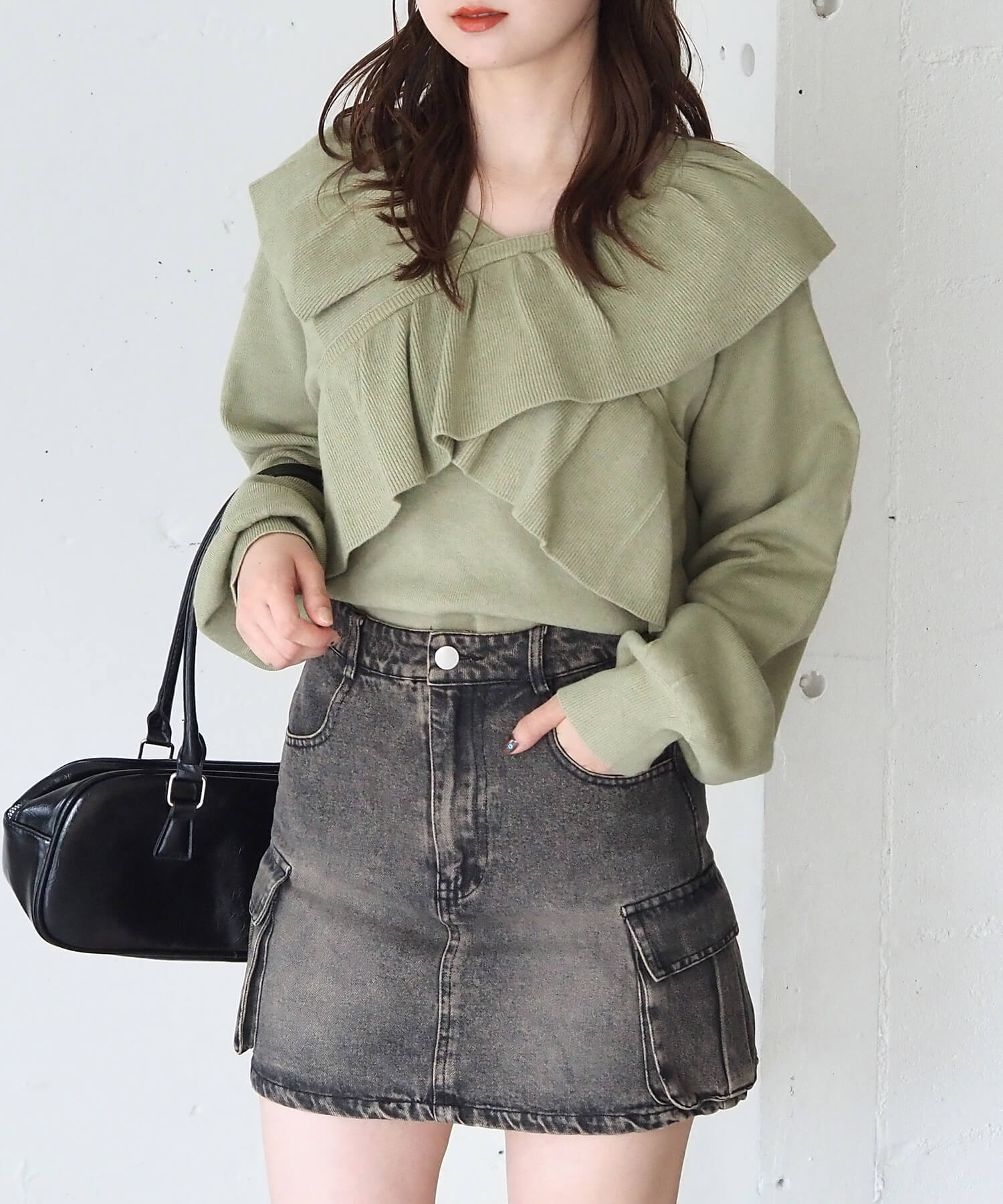 ・スウェード生地やレザーでトレンドコーデに。たっぷりのフリルデザインやリブ使いで華やかな高見えコーデが完成します。