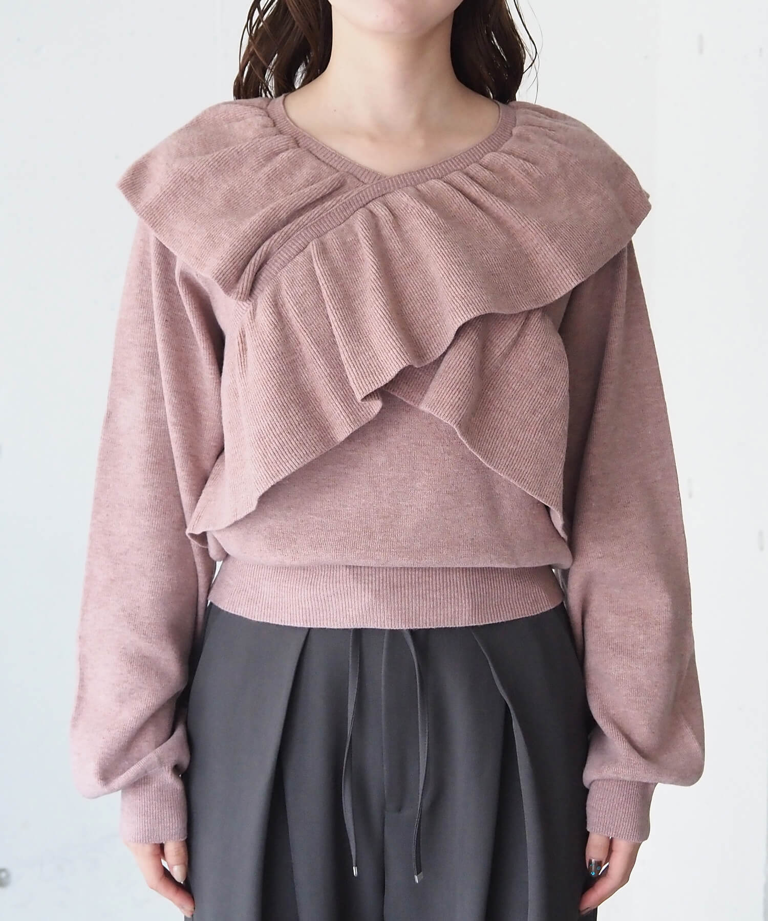 ・たっぷりとあしらったフリルが着るだけで華やかなニットプルオーバーです。