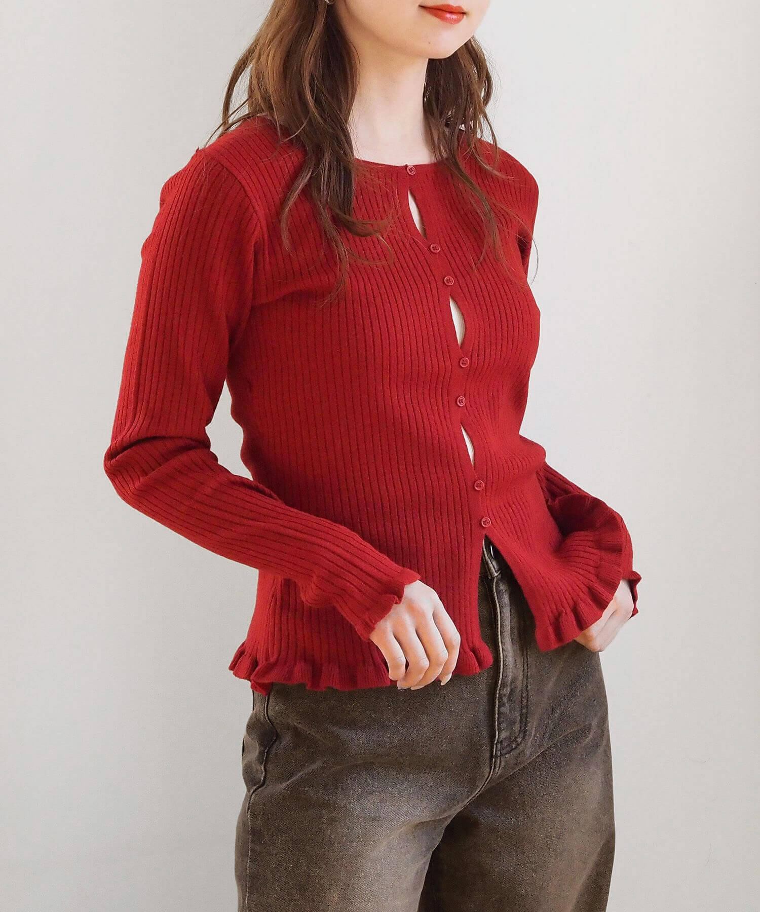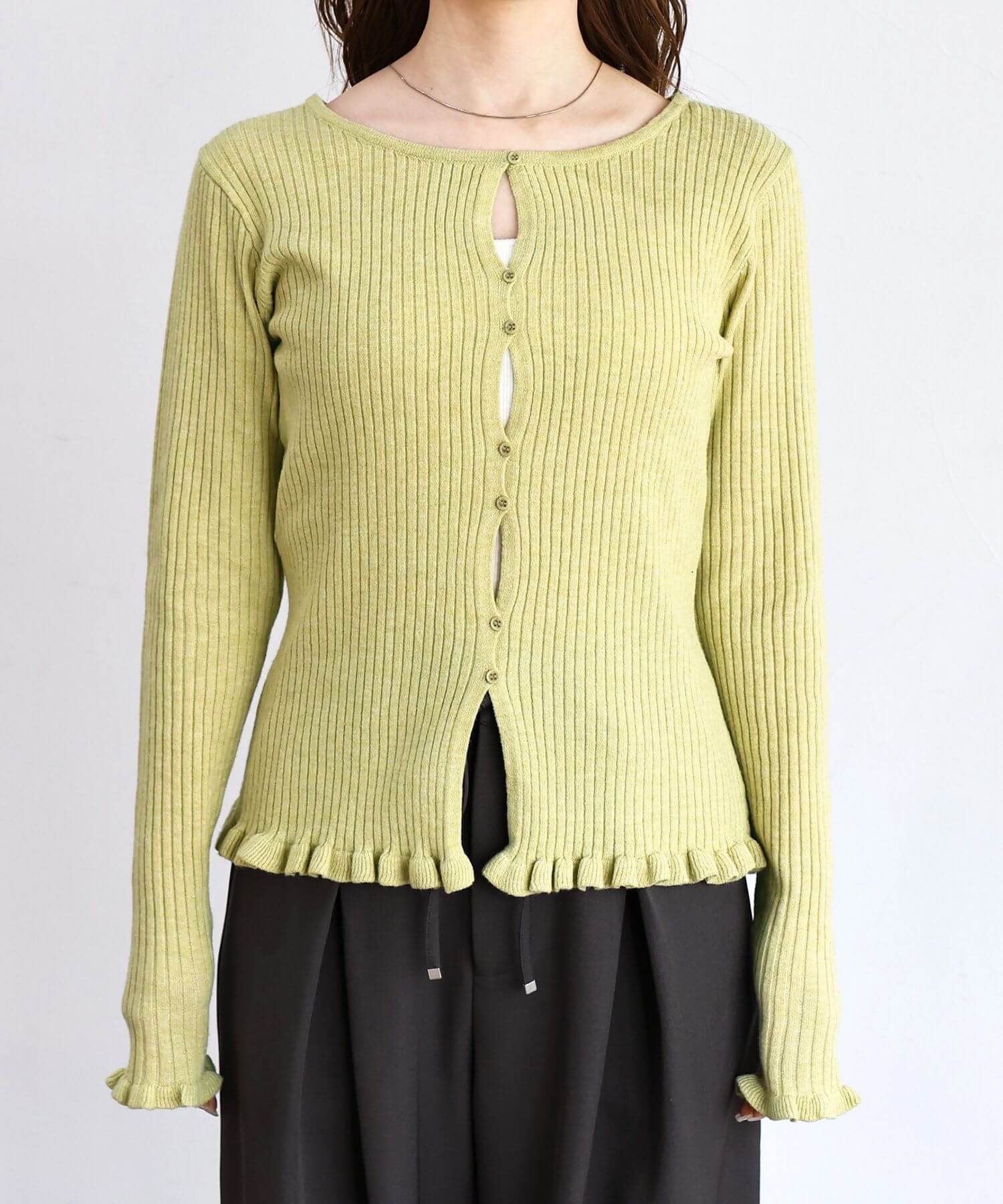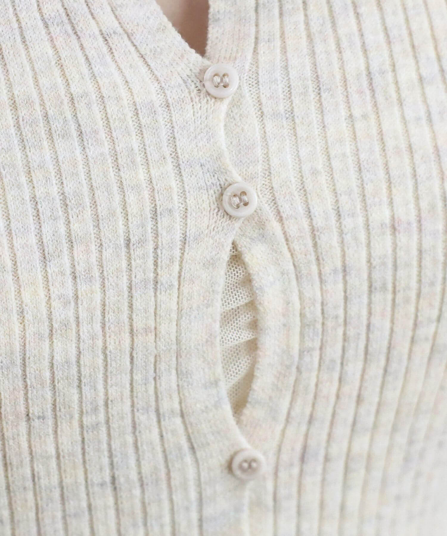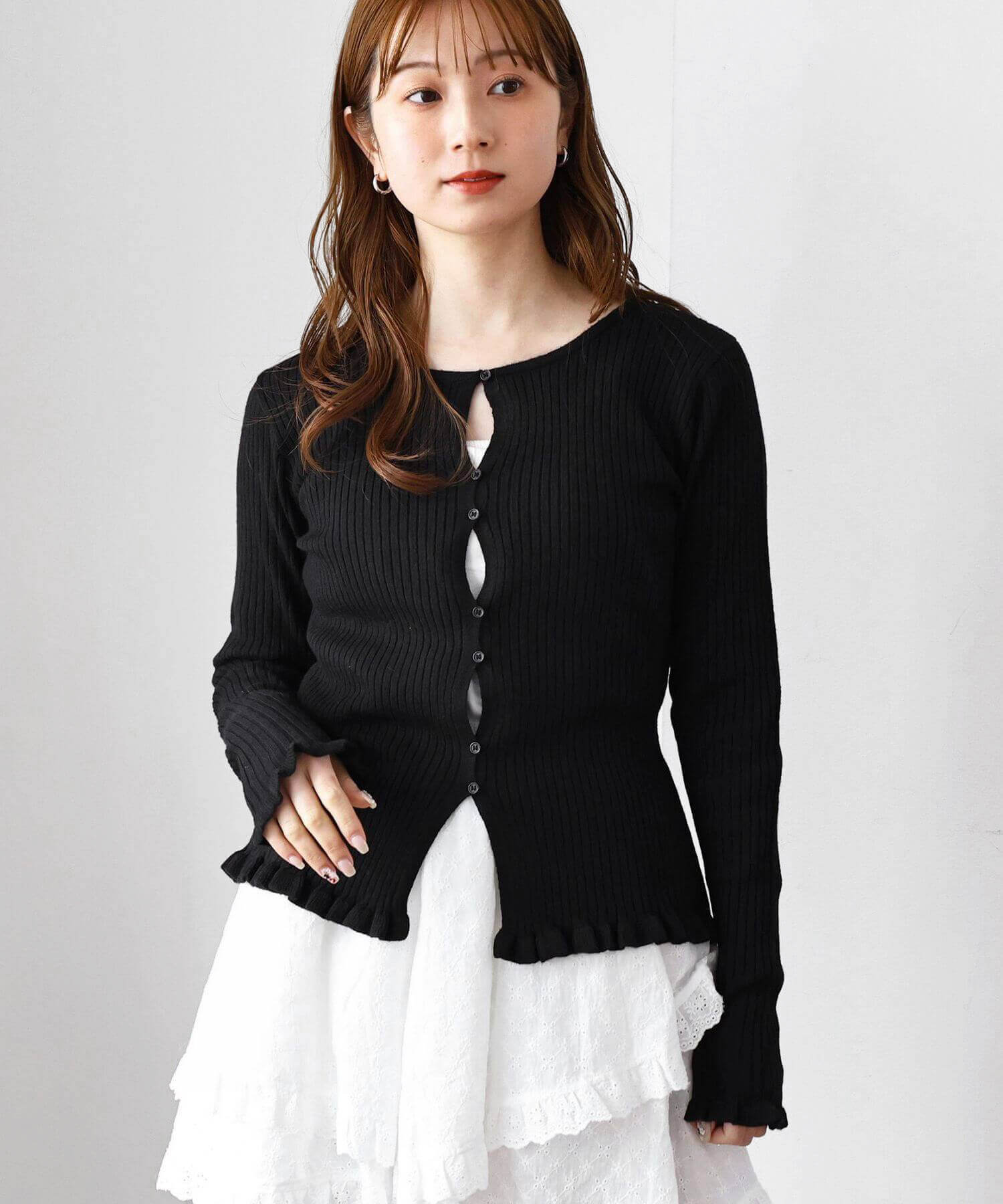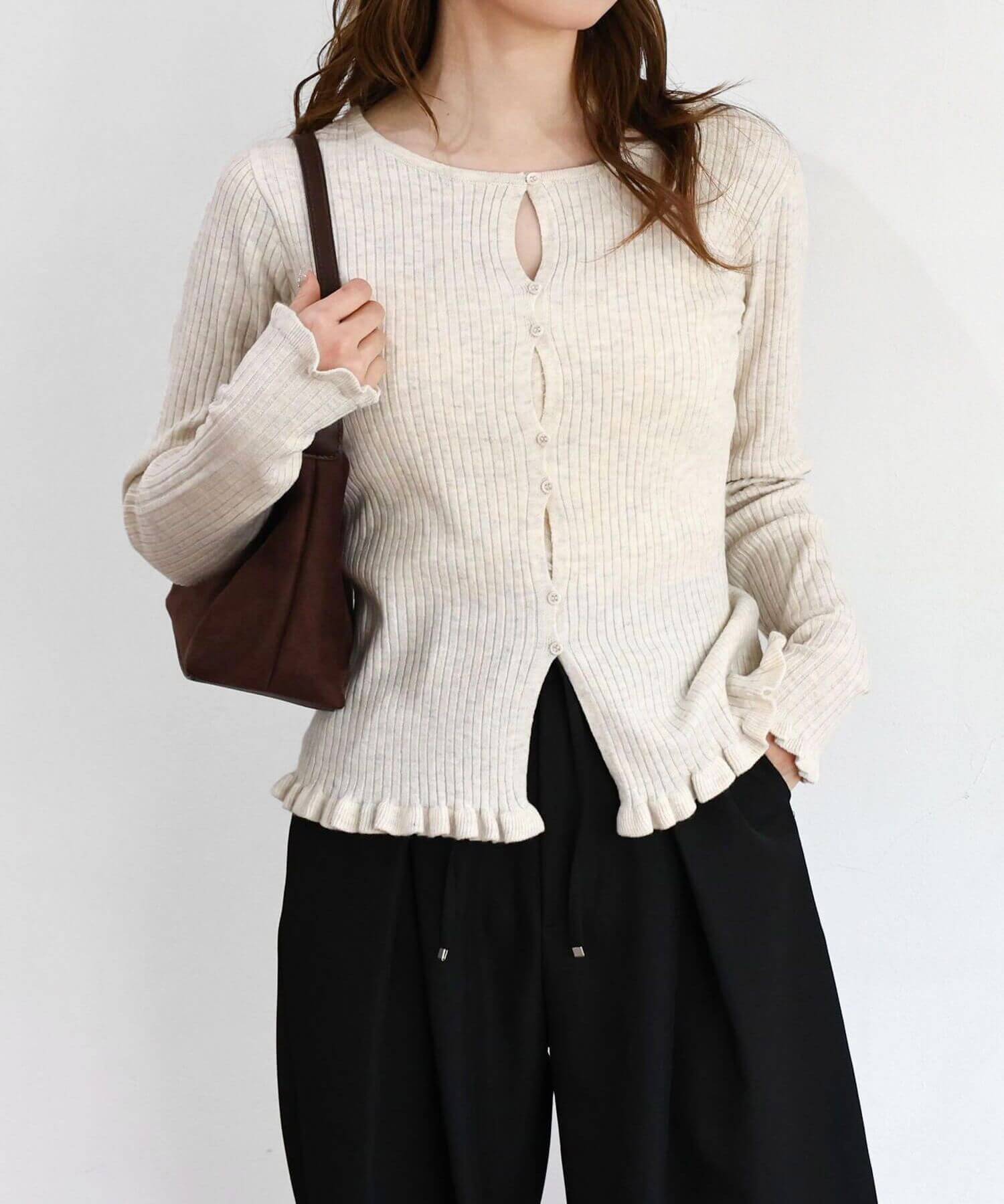 ・ランダムに配置されたボタンが女性らしい抜け感を演出するリブニットカーディガンです。