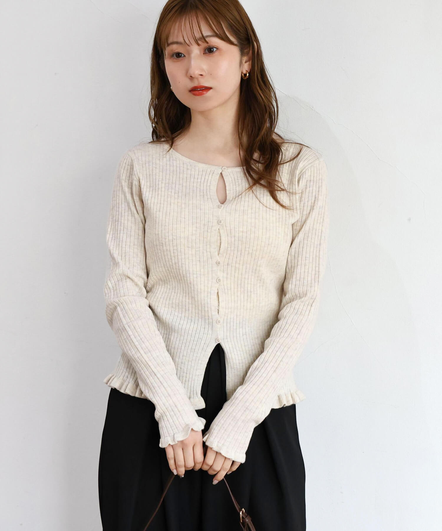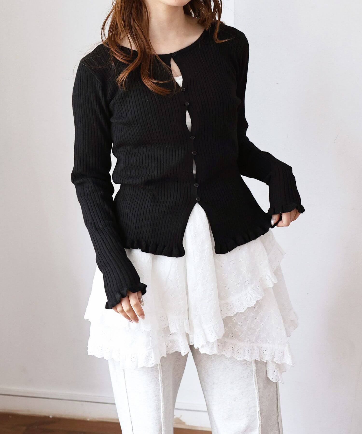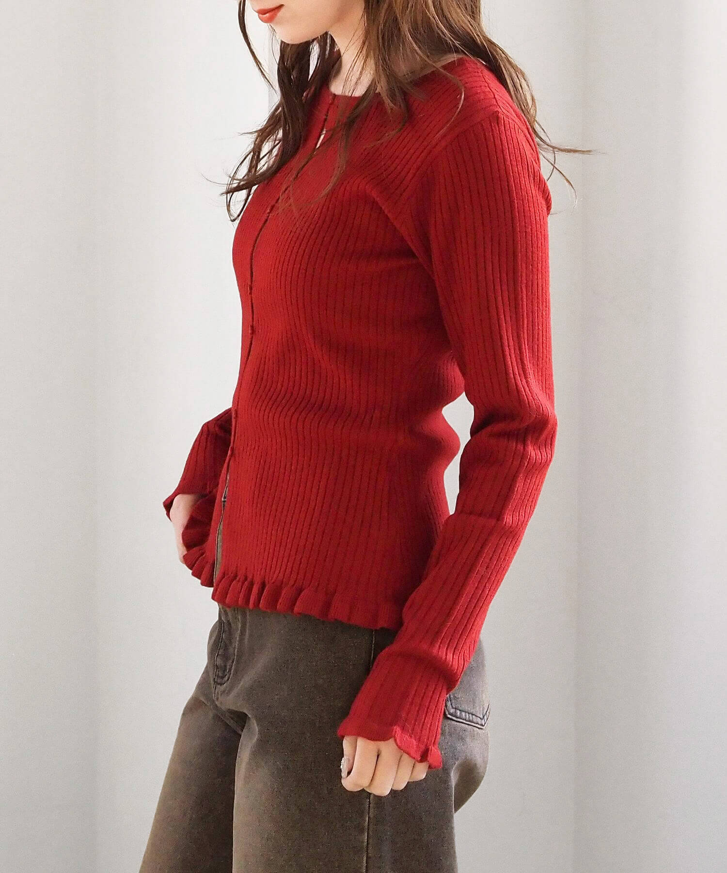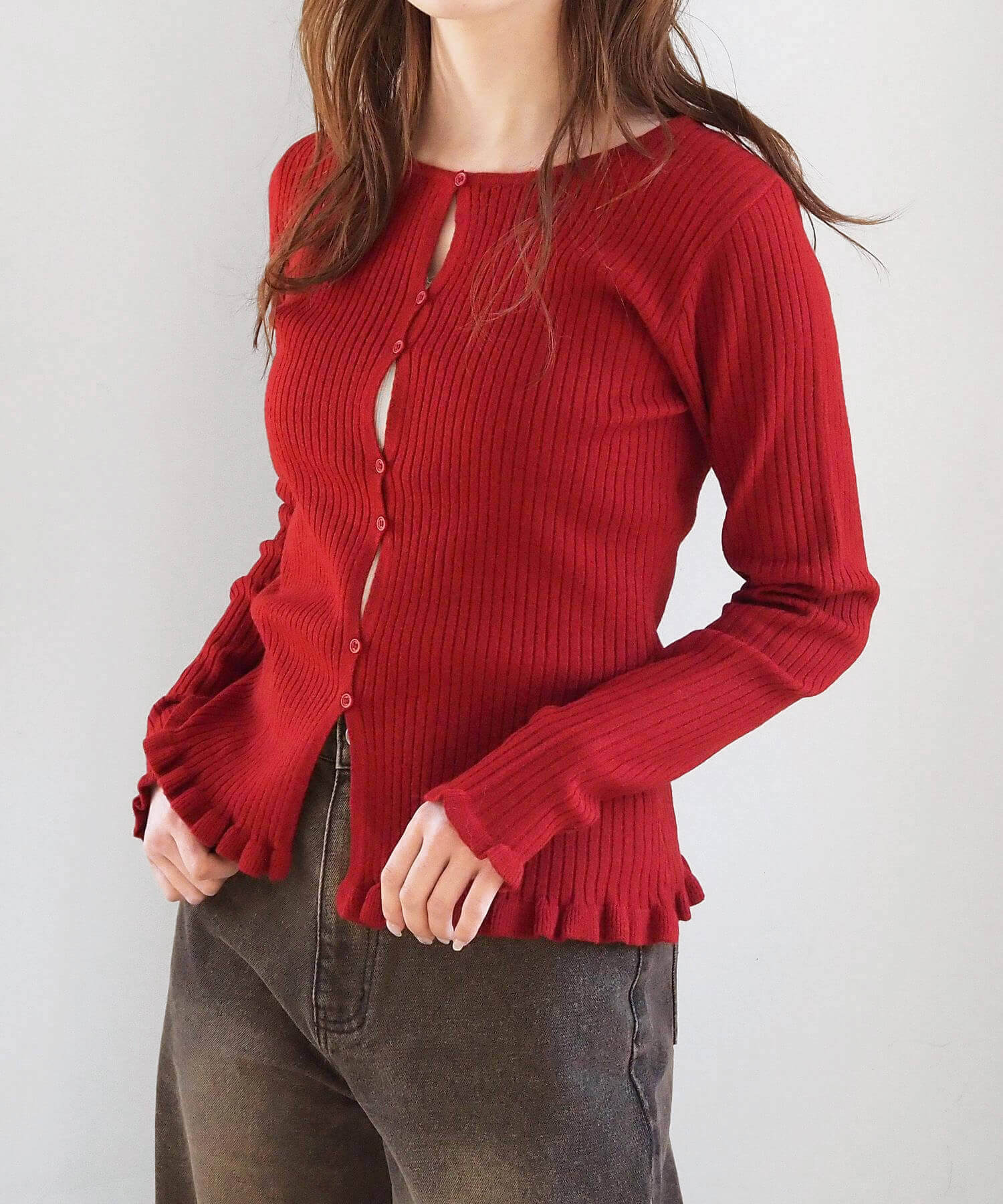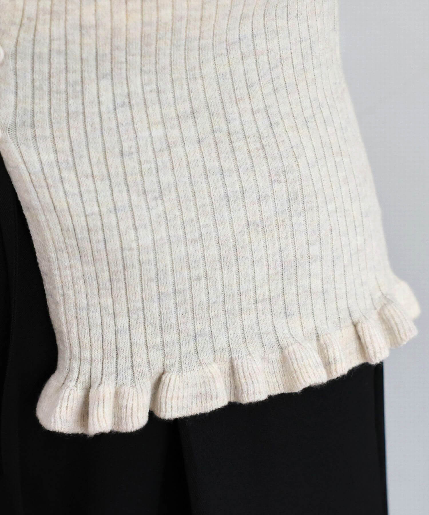 ・ランダムに配置されたボタンが女性らしい抜け感を演出するリブニットカーディガンです。