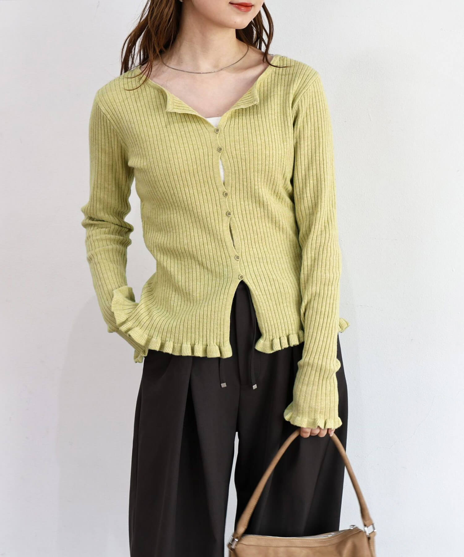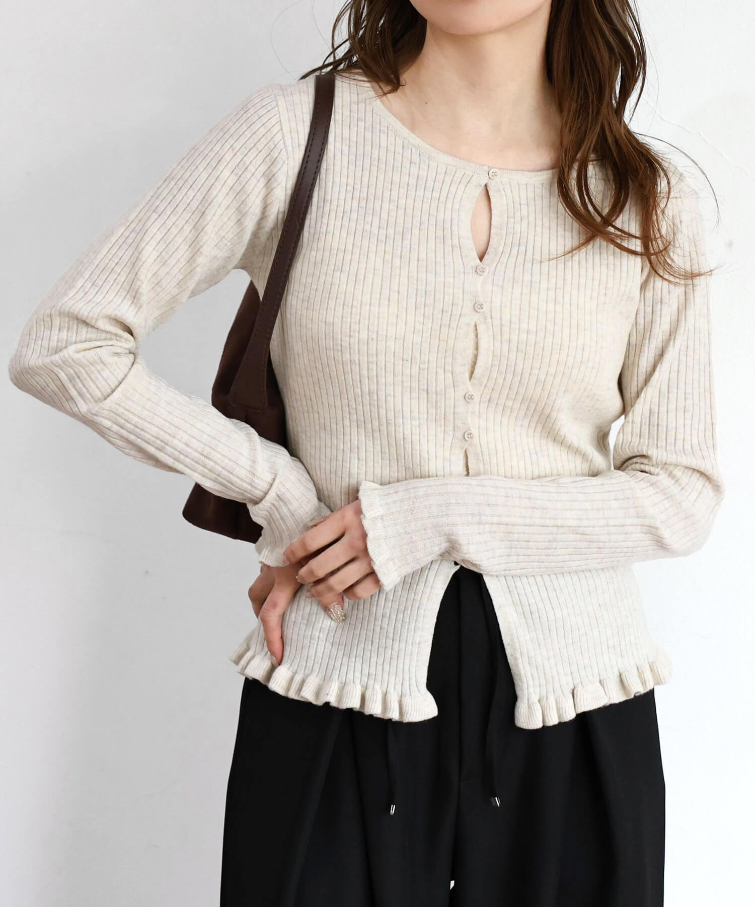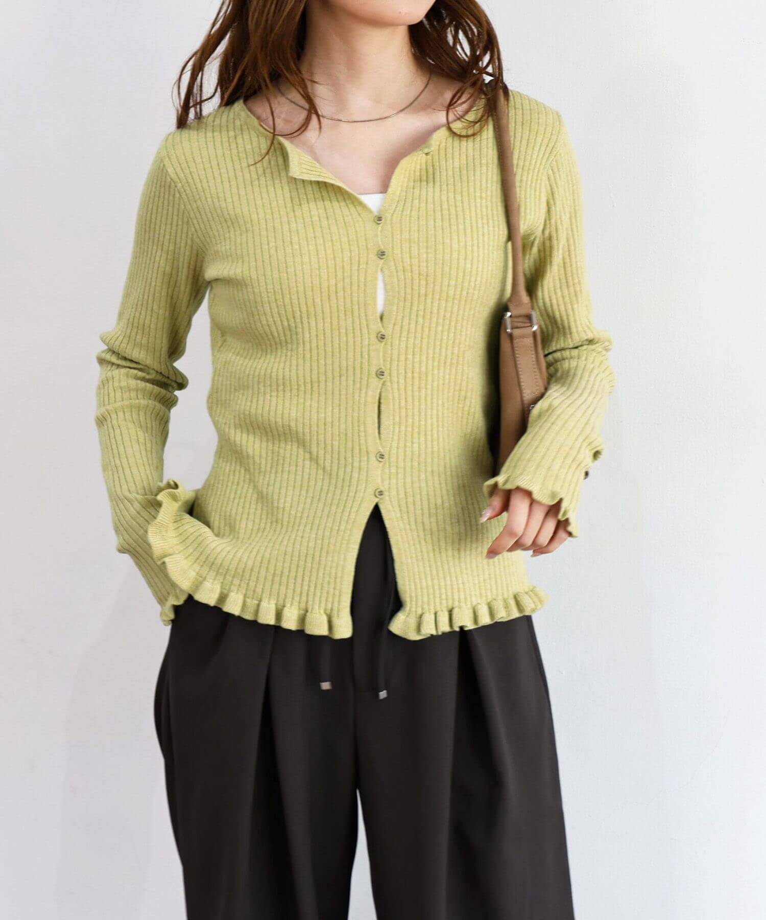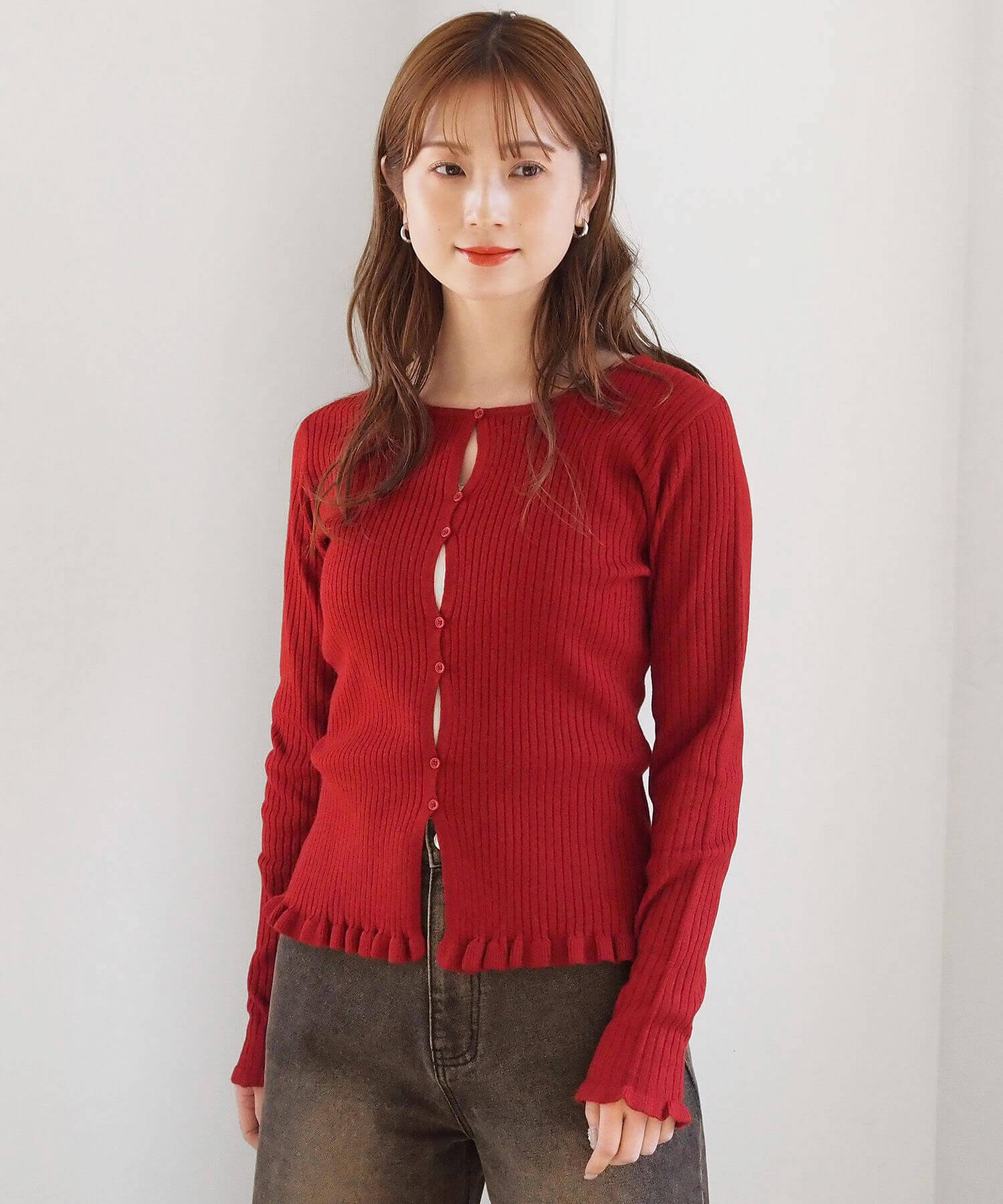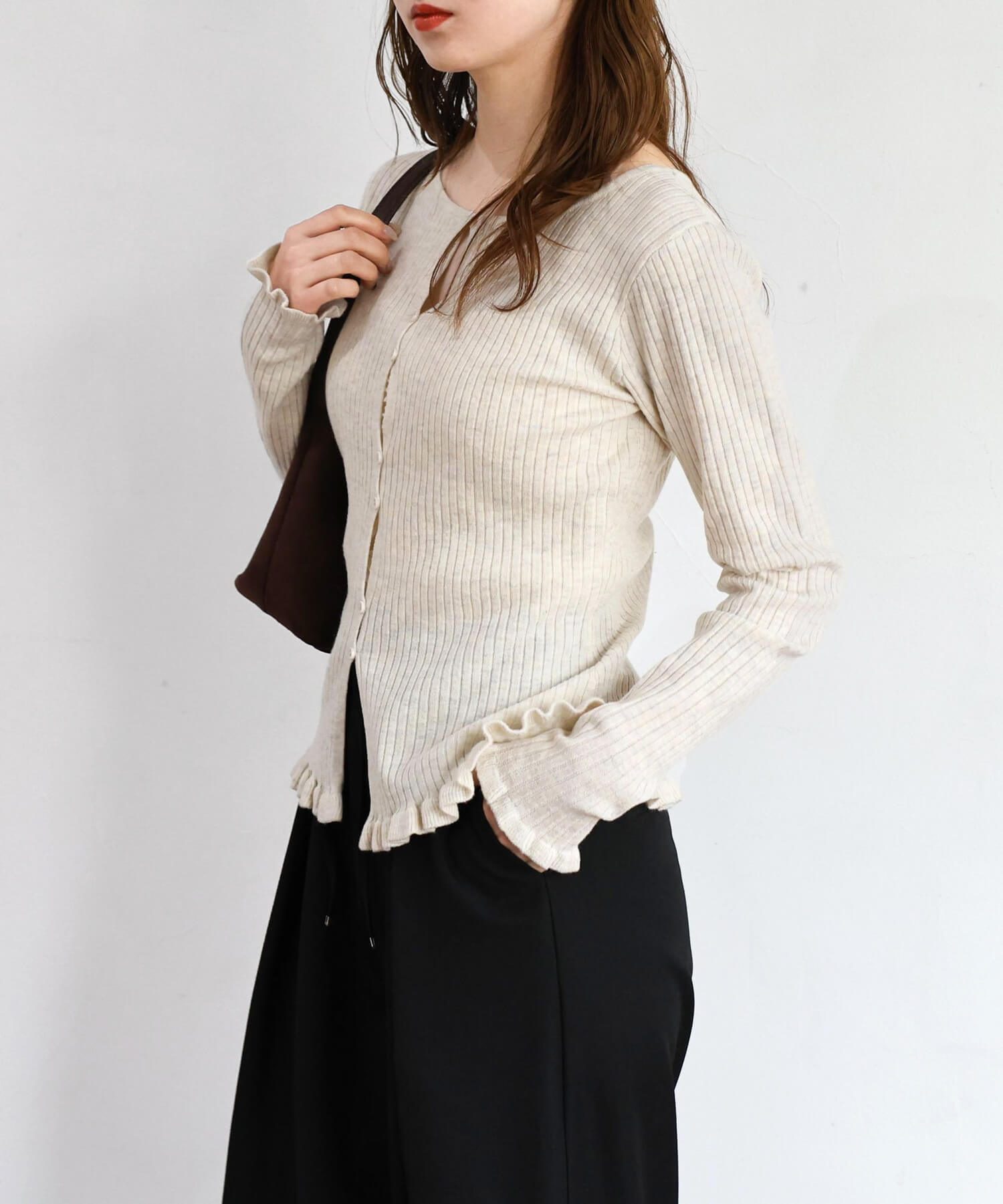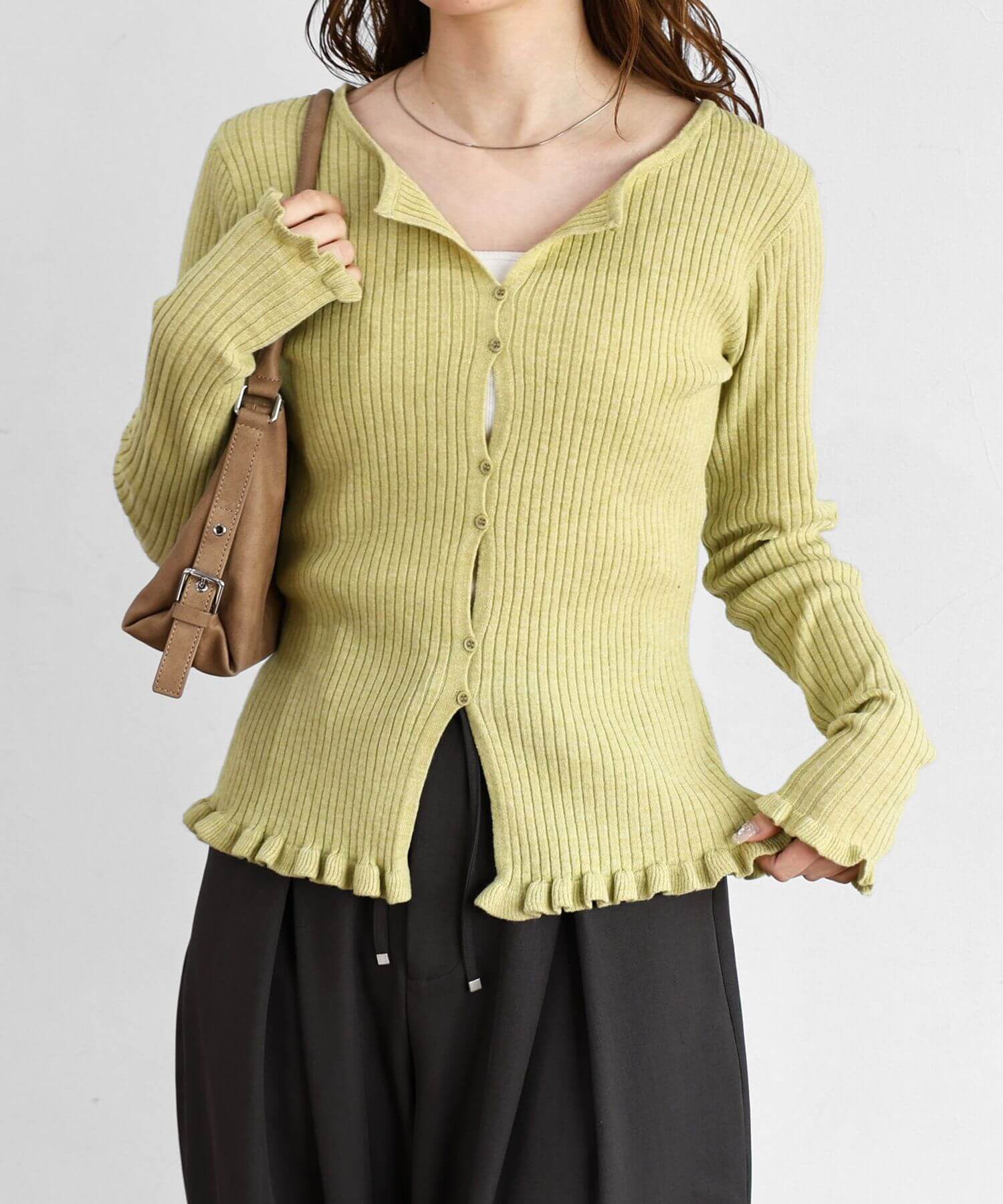・ランダムに配置されたボタンが女性らしい抜け感を演出するリブニットカーディガンです。
