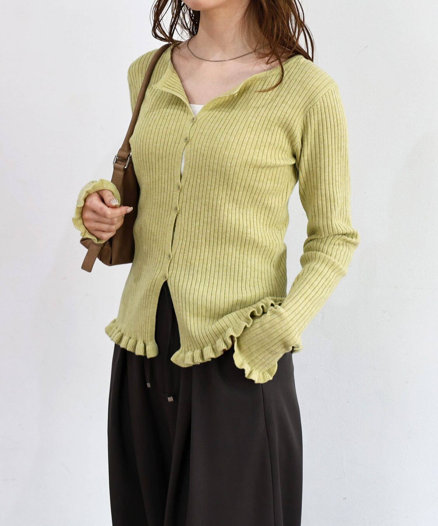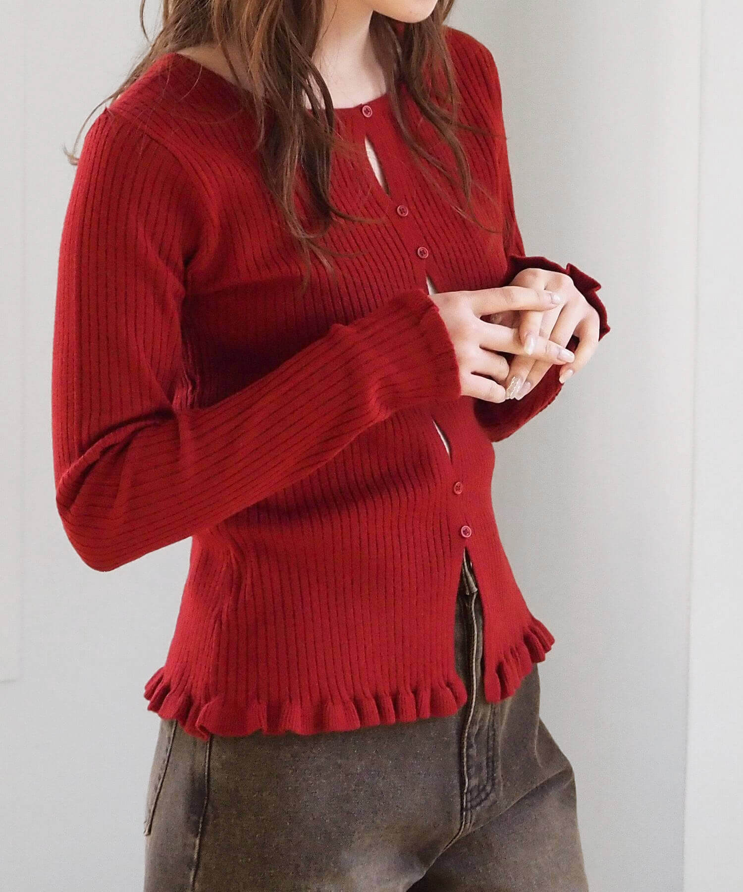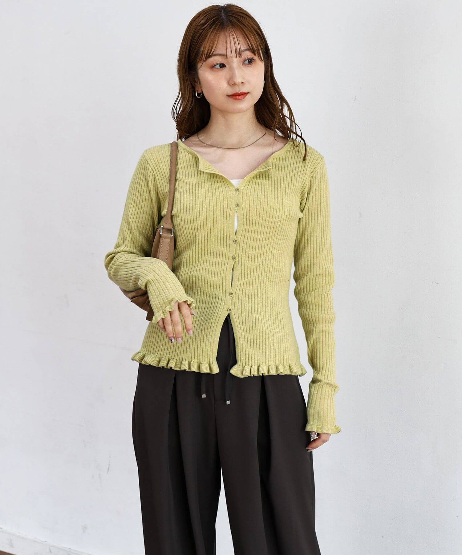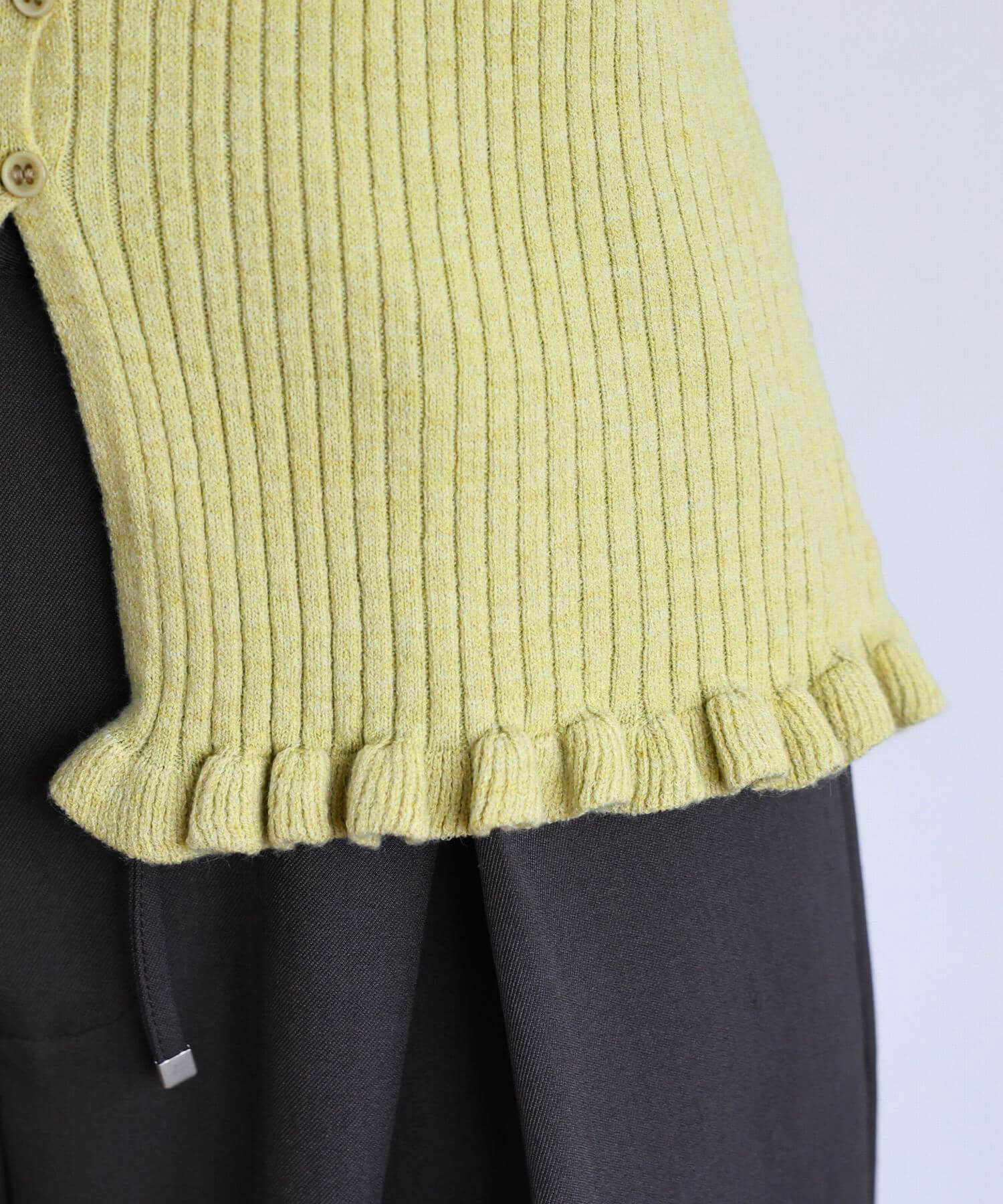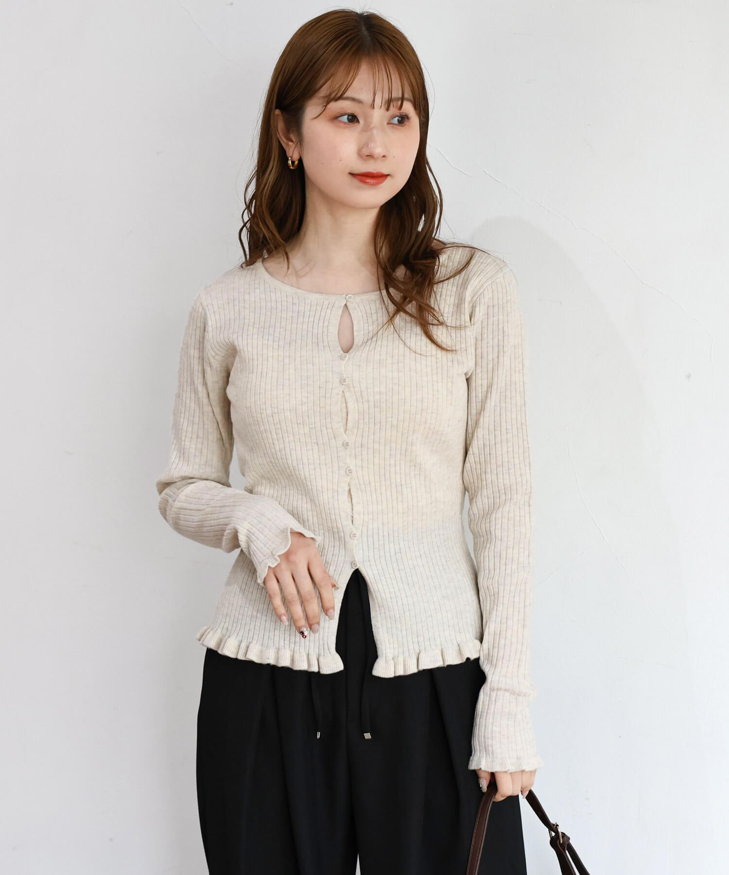・ランダムに配置されたボタンが女性らしい抜け感を演出するリブニットカーディガンです。