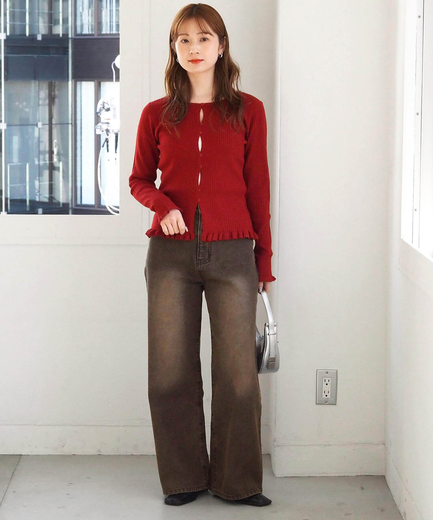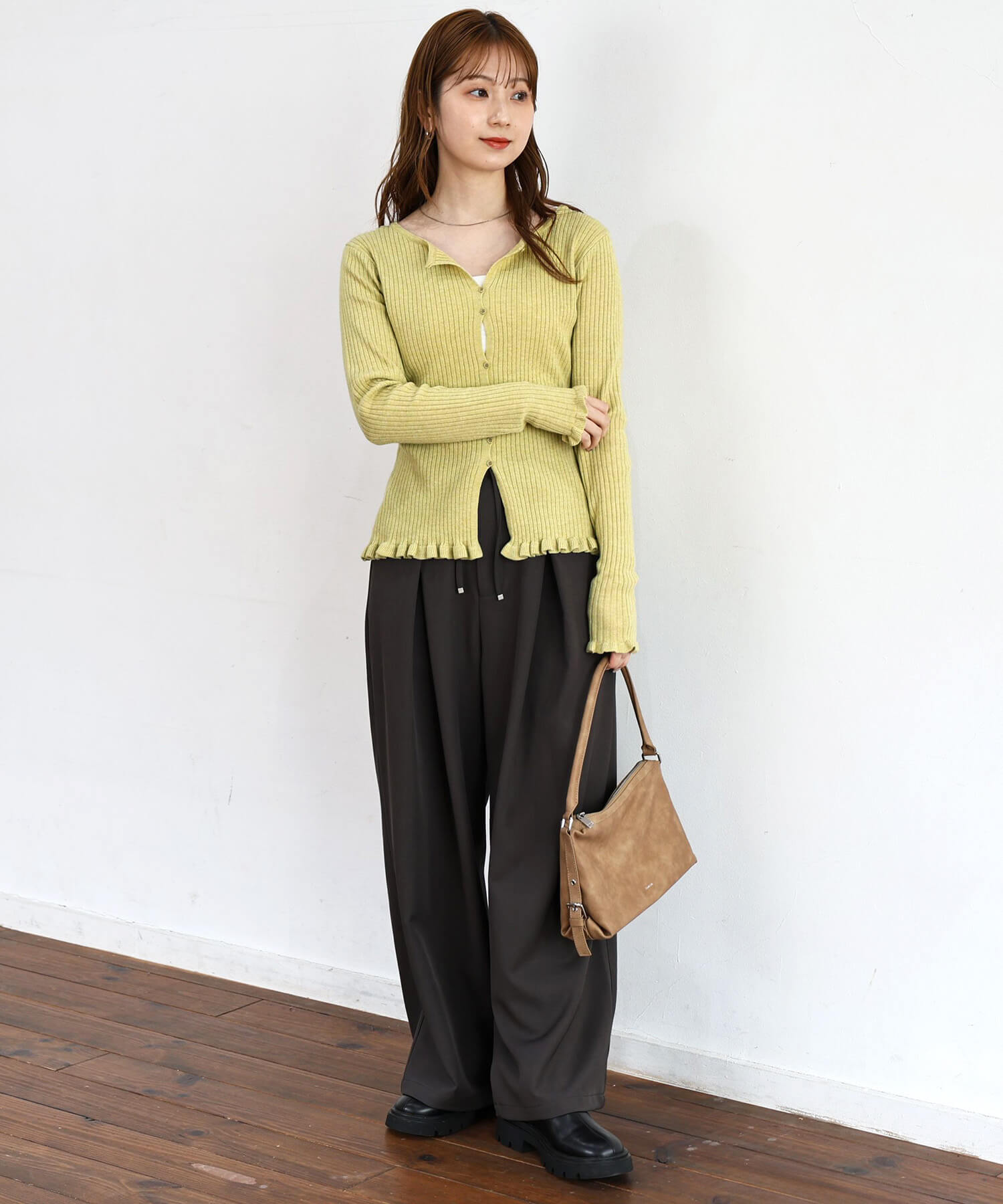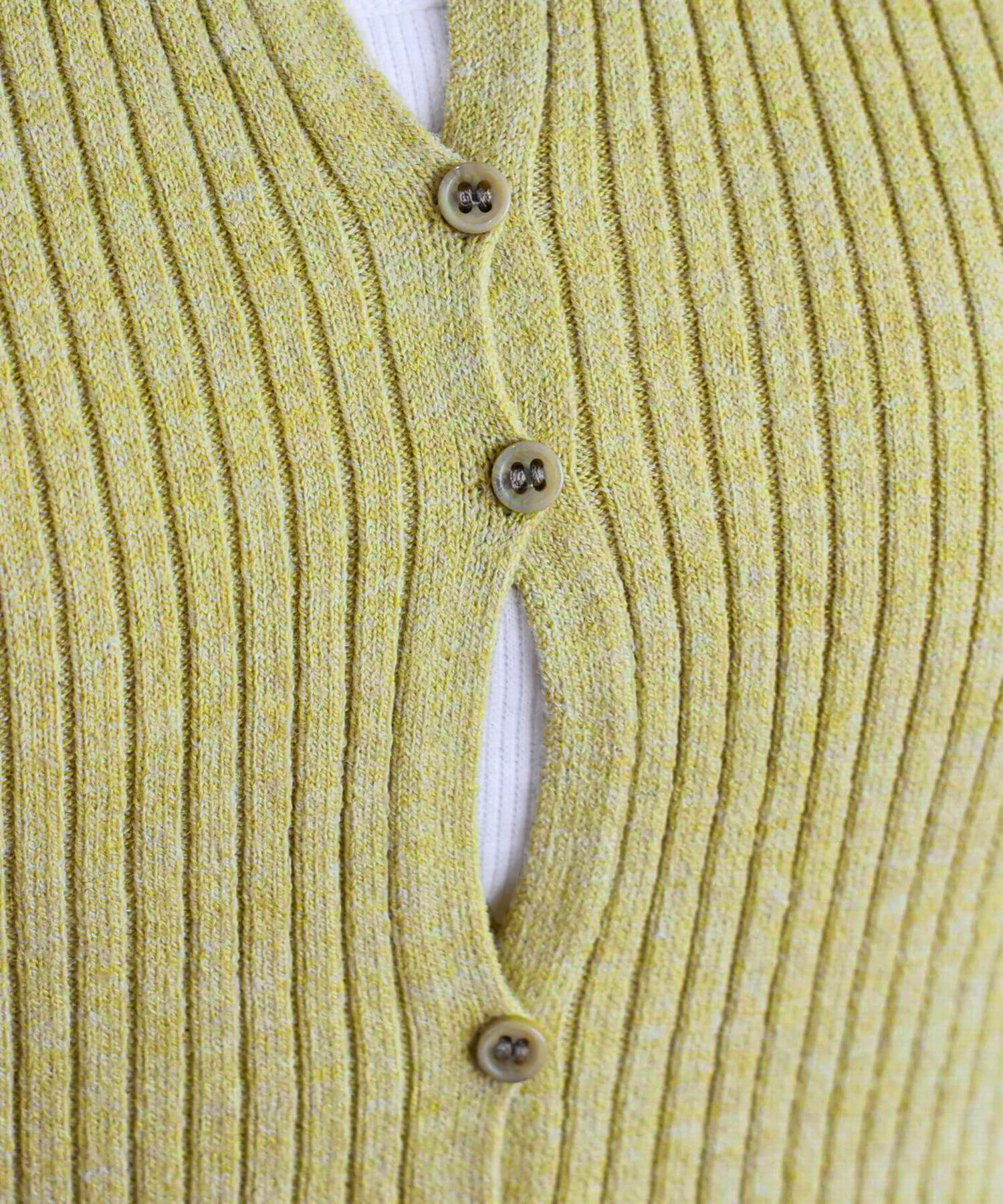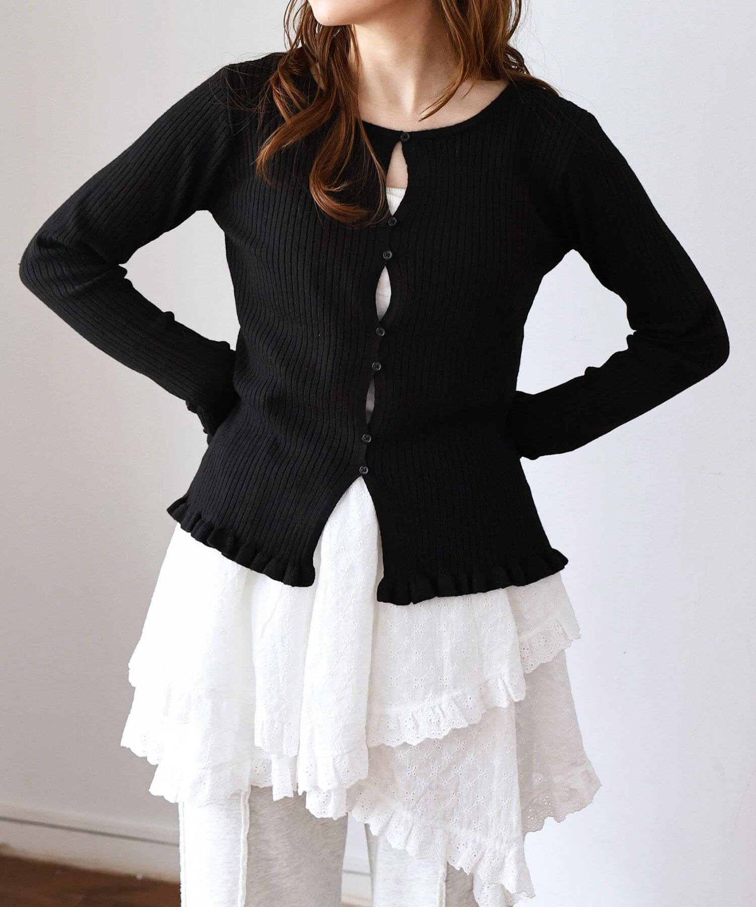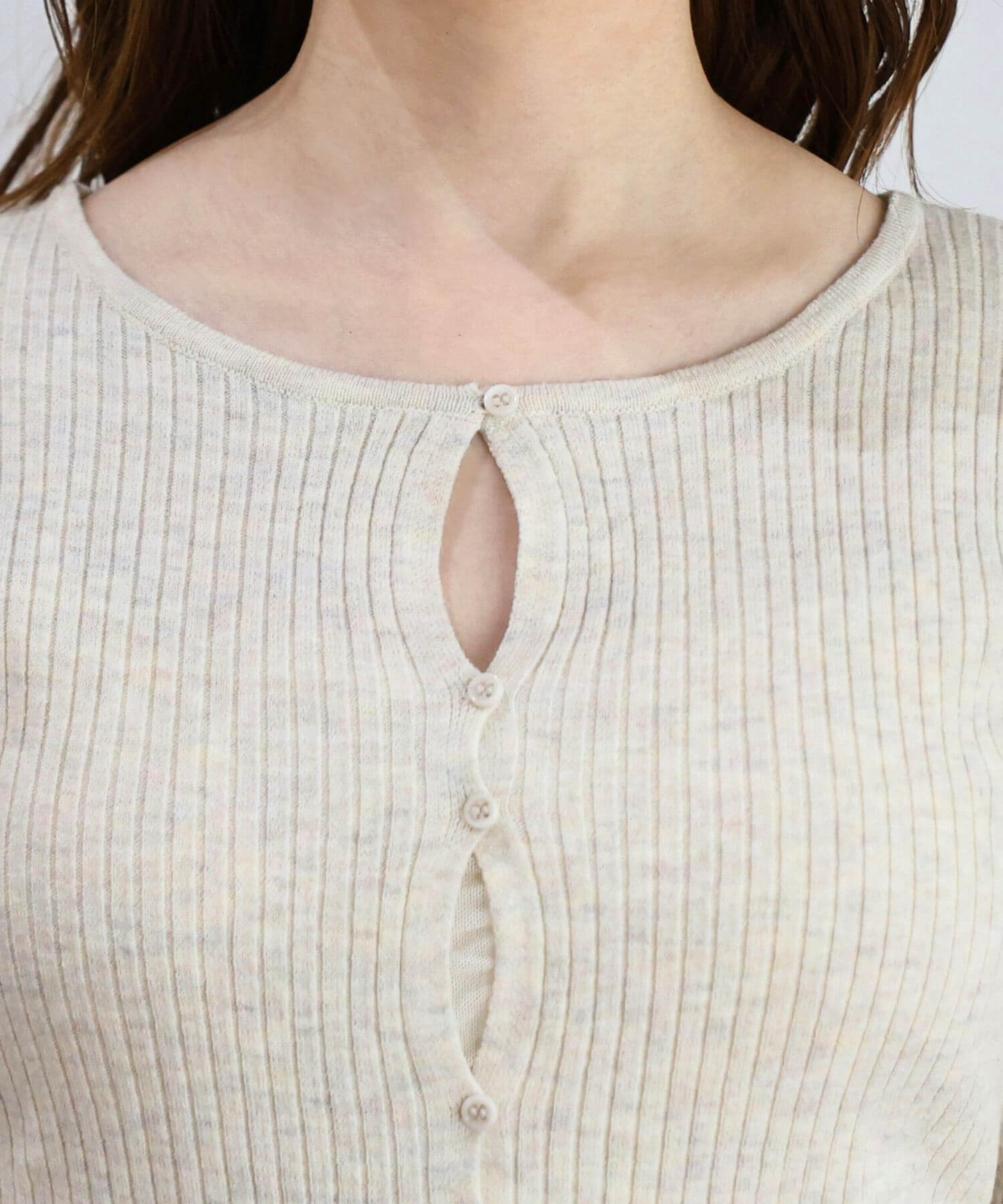 ・ランダムに配置されたボタンが女性らしい抜け感を演出するリブニットカーディガンです。
