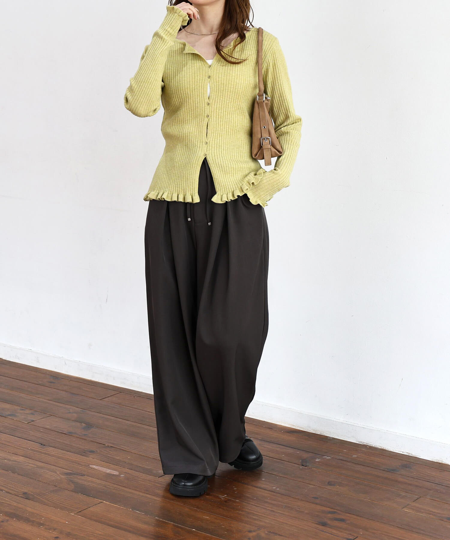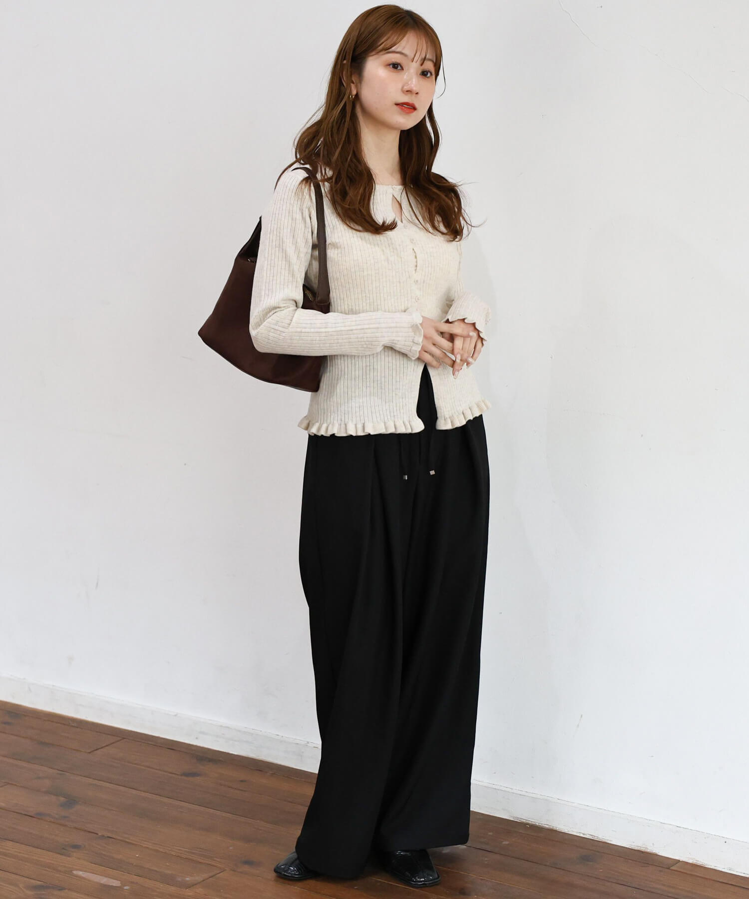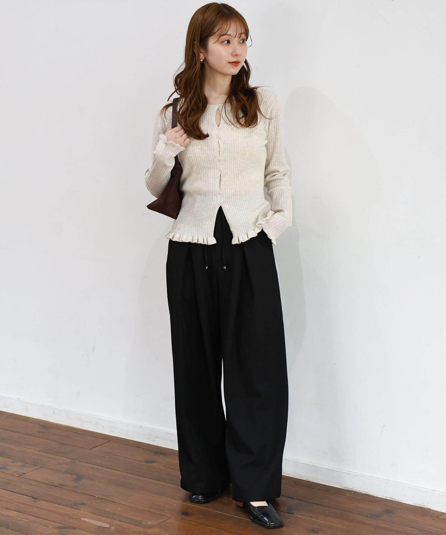 ・ワイドパンツでメリハリのあるスタイリングに。上半身の華奢見えが狙えるコーディネートです。