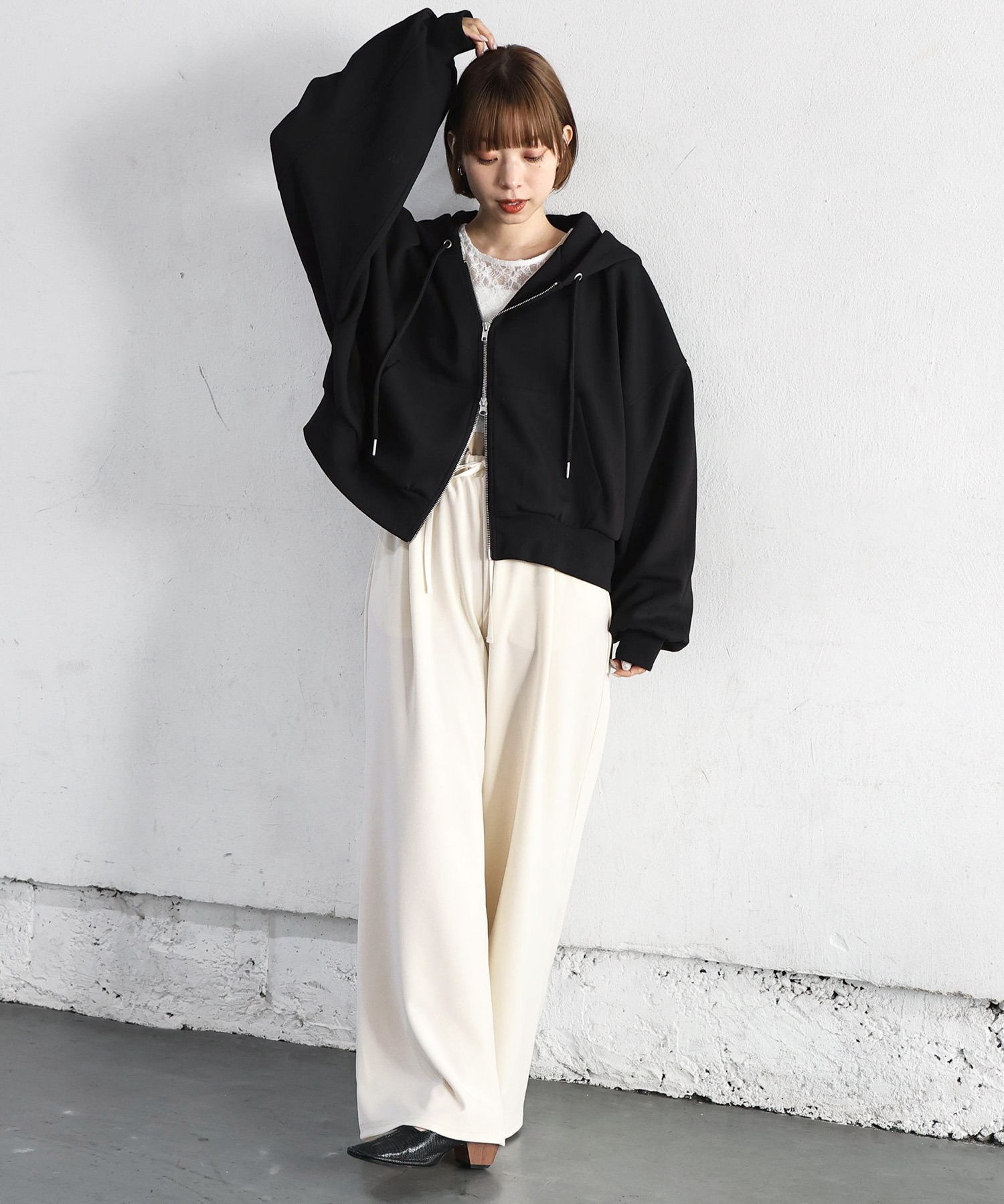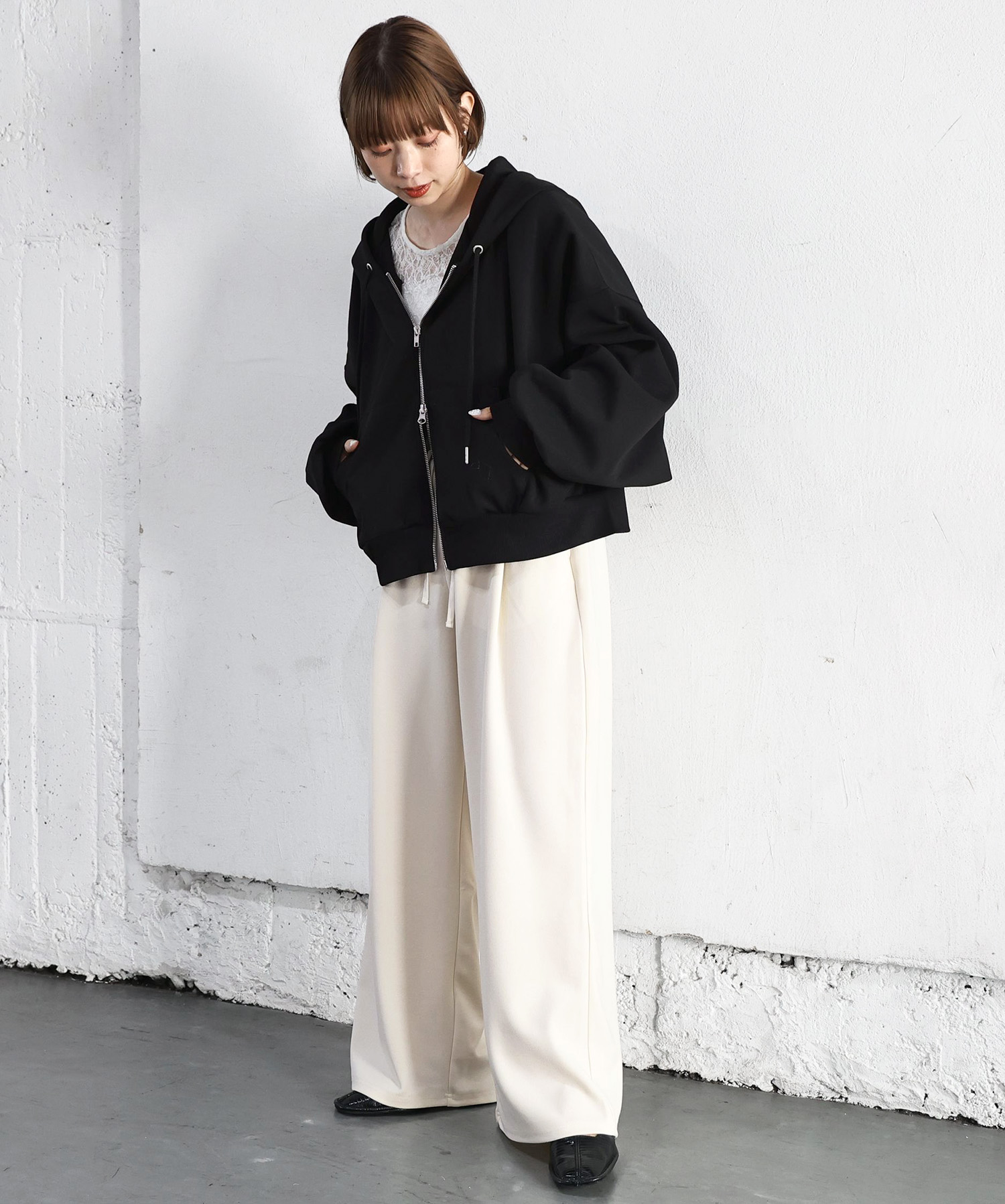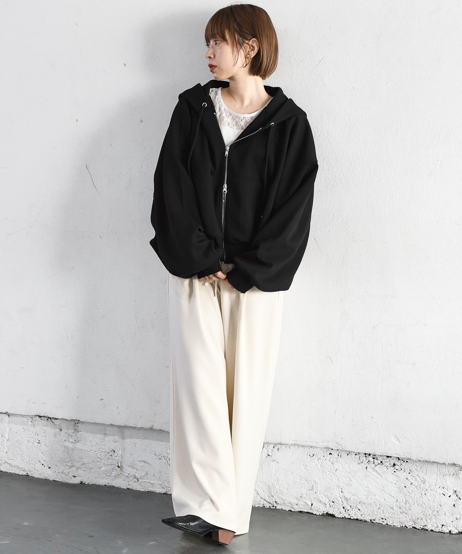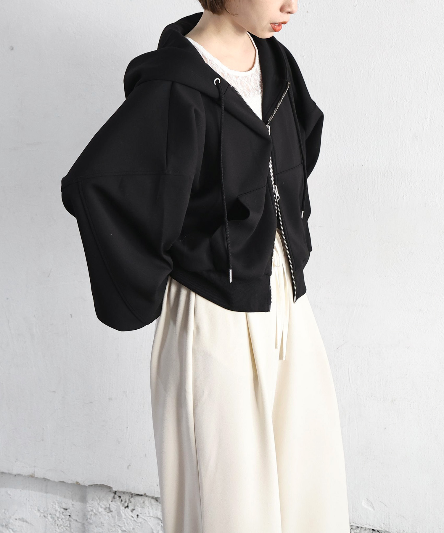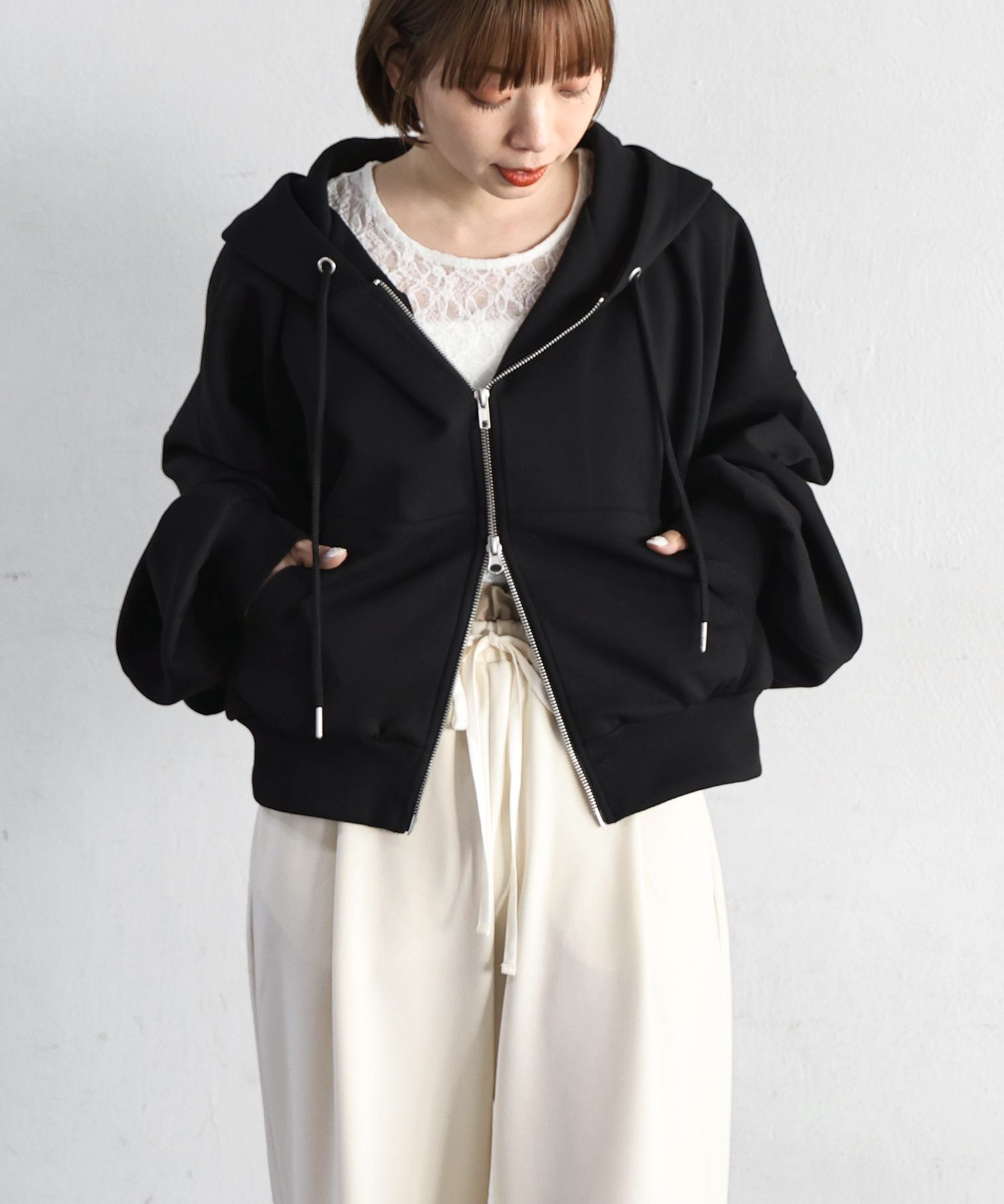 ・フロントのジップを少し開けると、程よい抜け感が出ます。