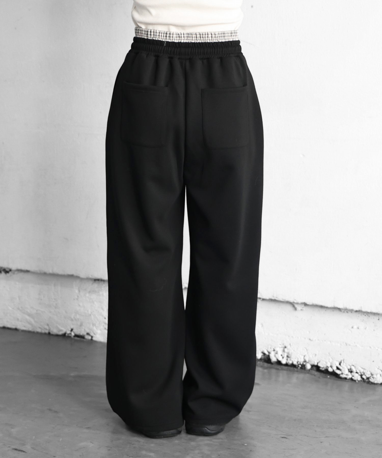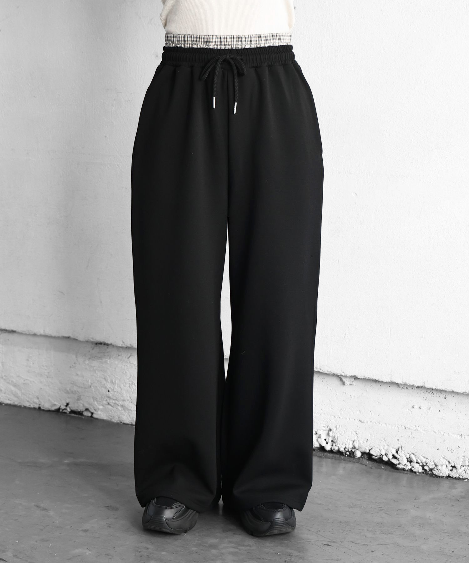 ・チャック柄ボトムをレイヤードしたようなデザインでトレンド感をプラス。