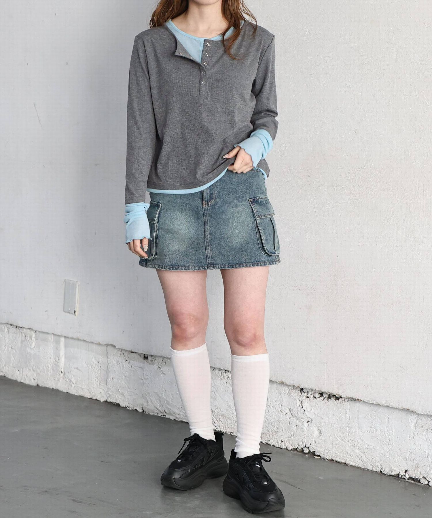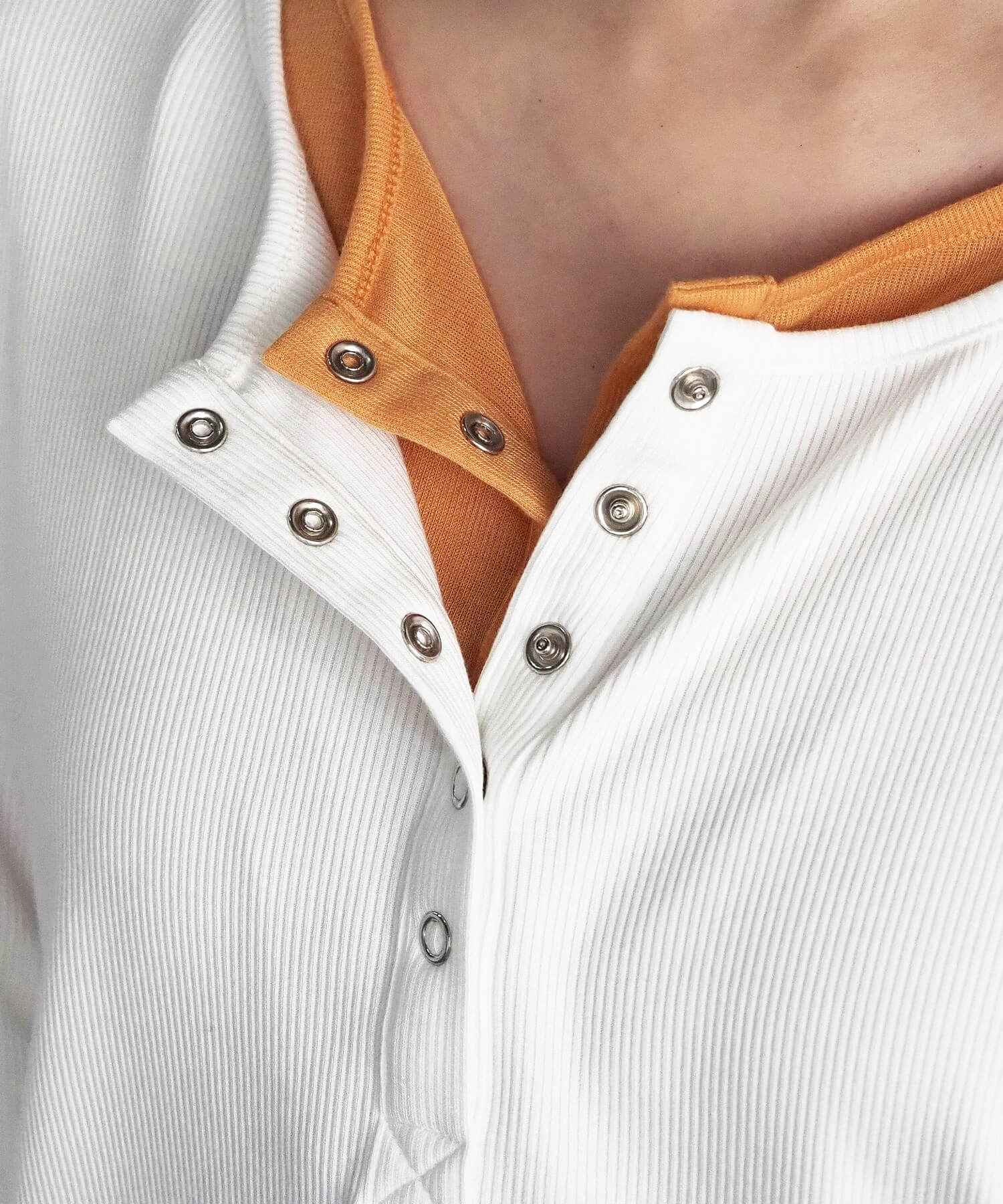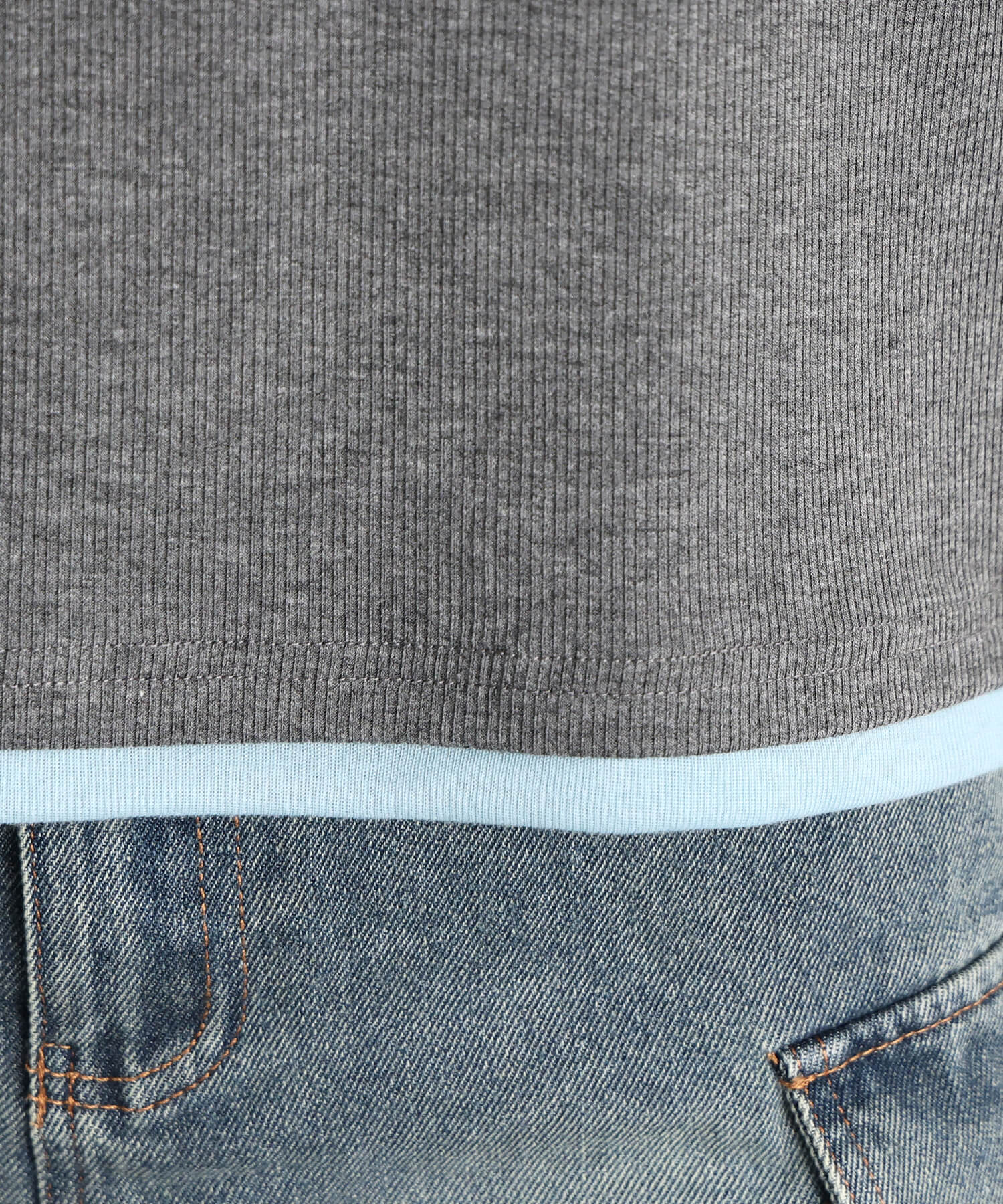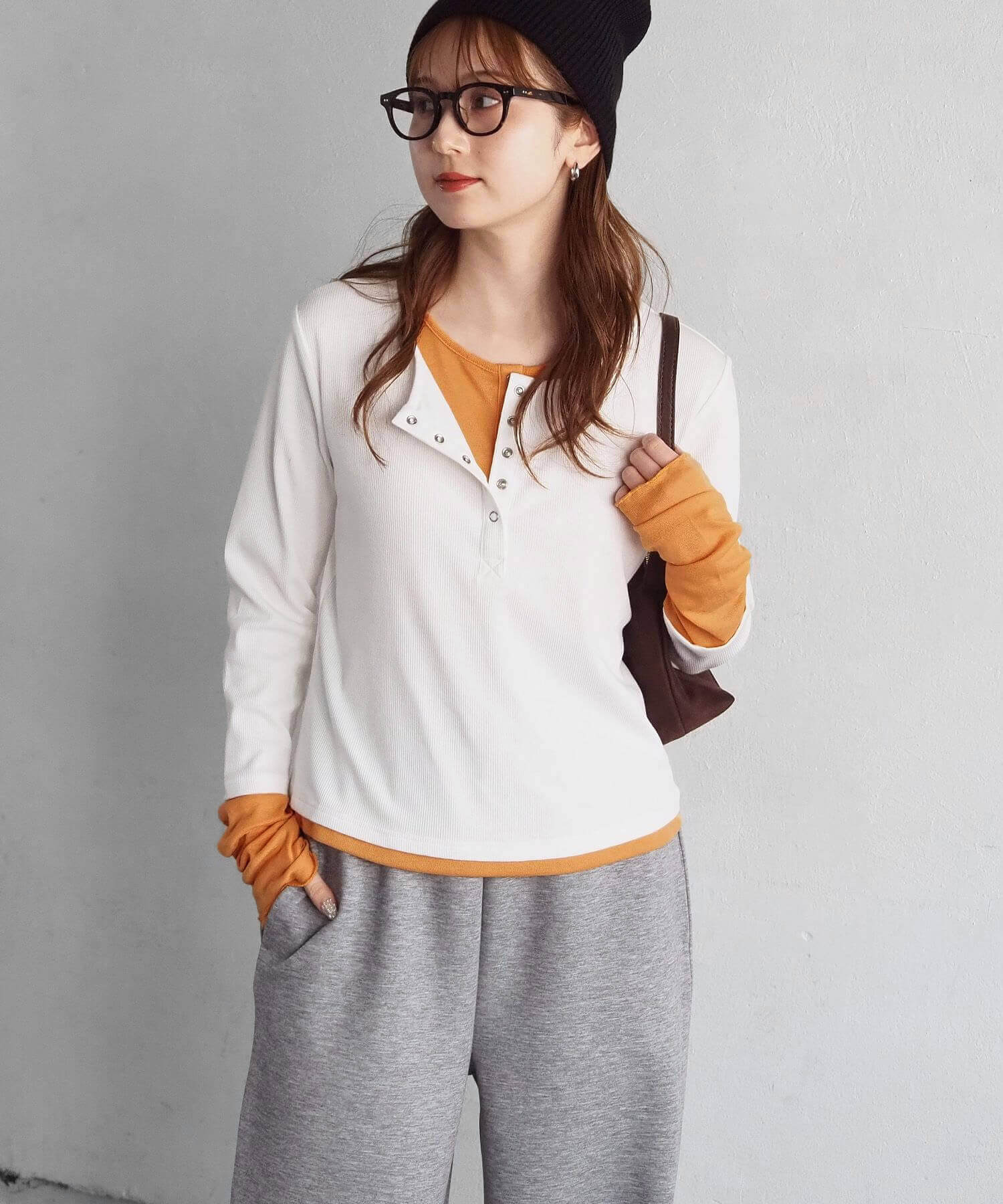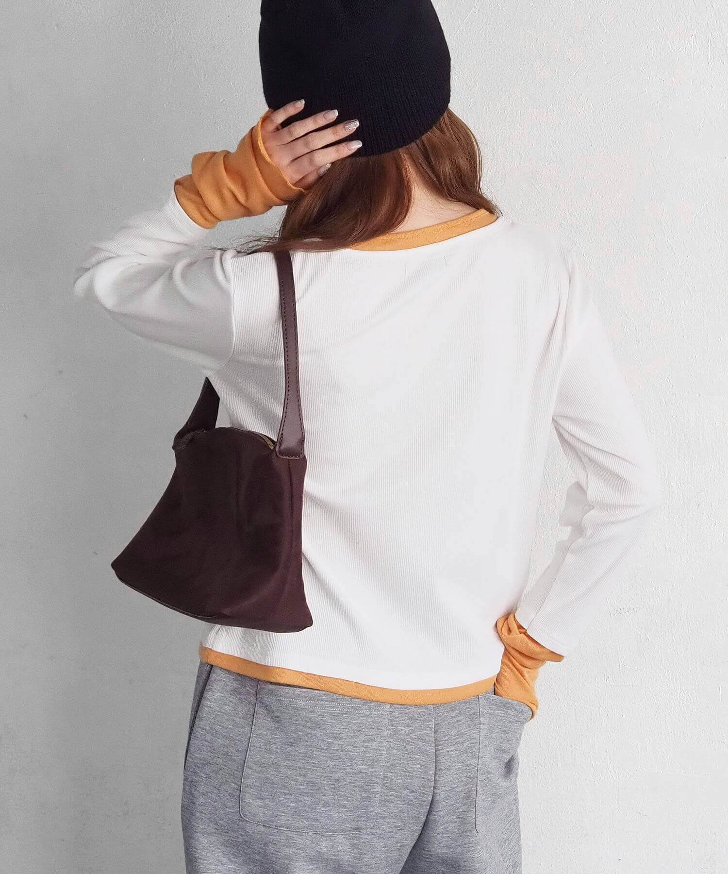 ・シャツやパーカー、春アウターとなど羽織りもののインナーとしても最適。襟ぐりのチラ見えはもちろん、袖の配色を見せる着こなしもおすすめです。