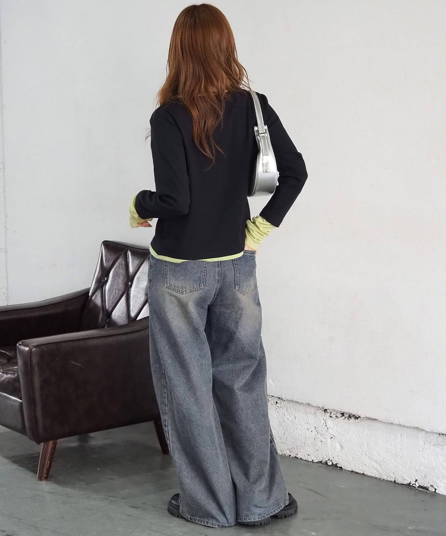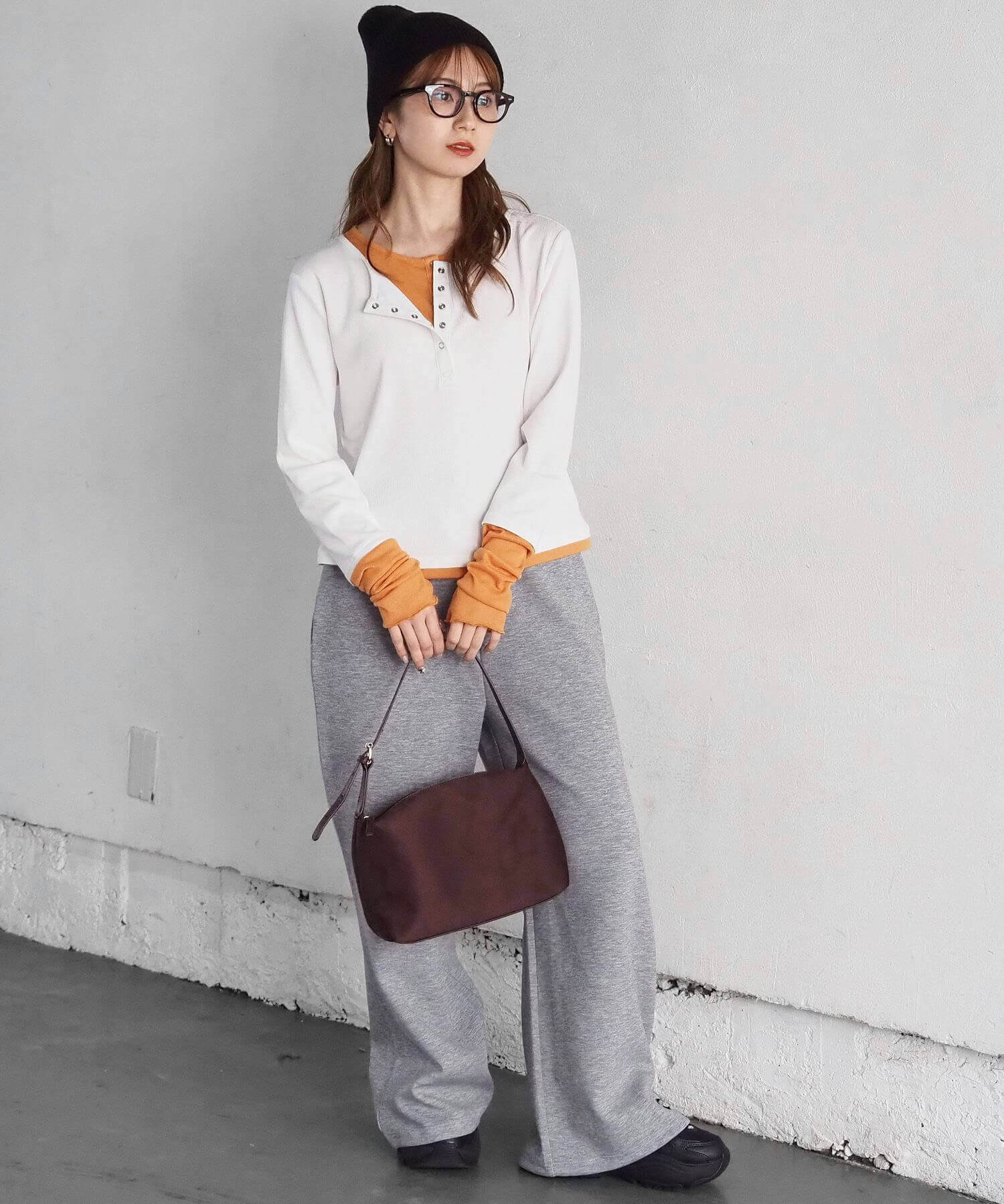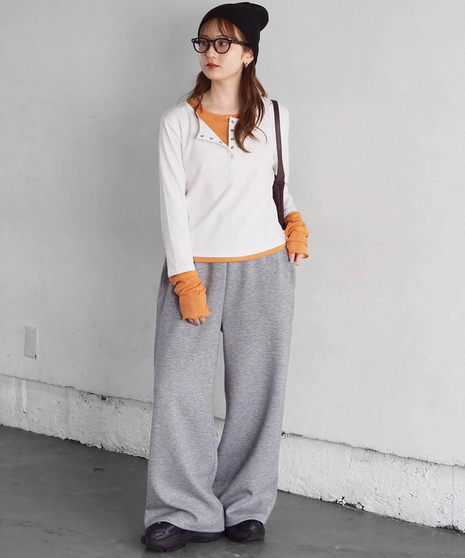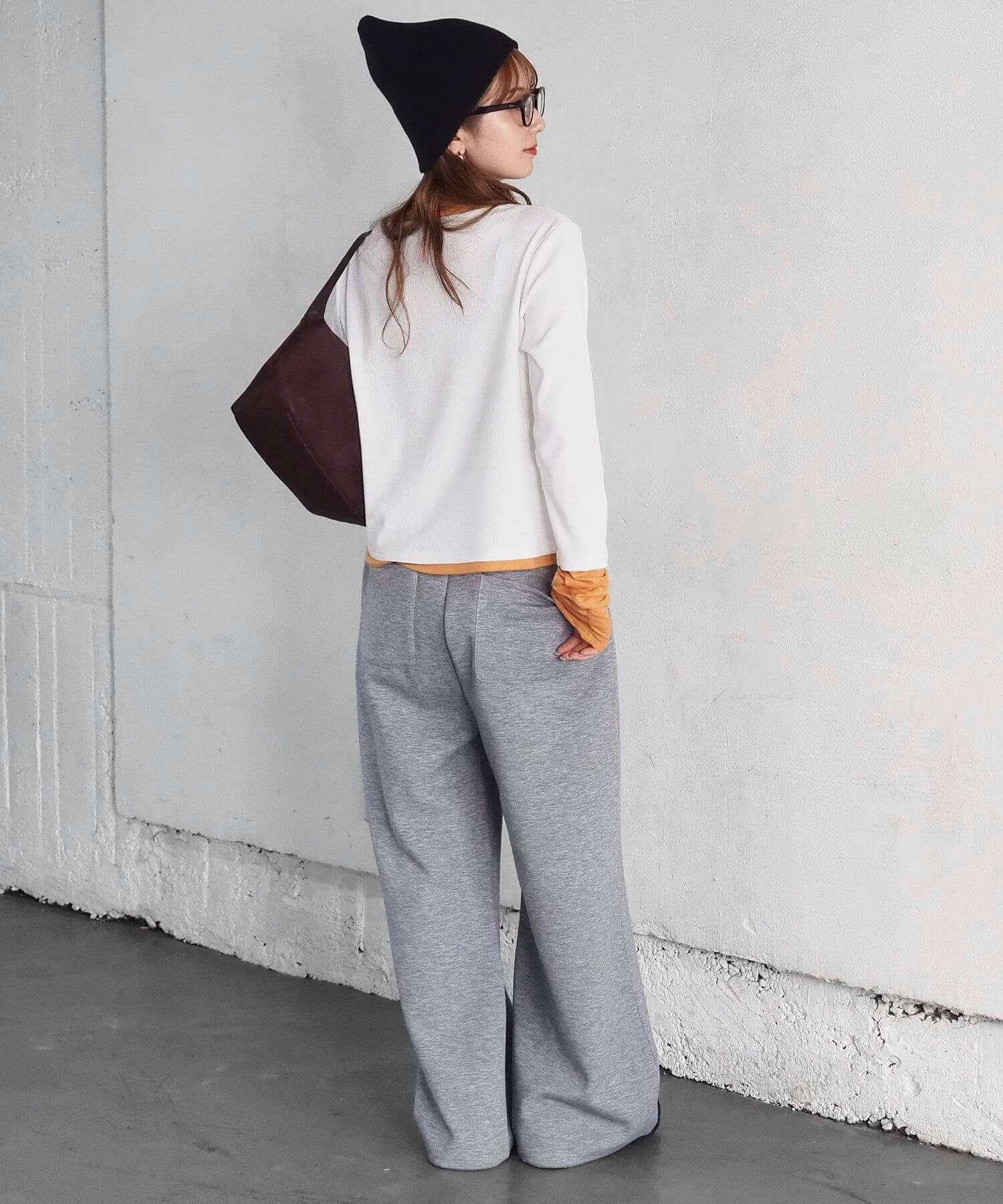 ・すっきり見えるトップスなので、ワイドパンツと好相性。スラックスやスウェットなど、幅広い着こなしが楽しめます。