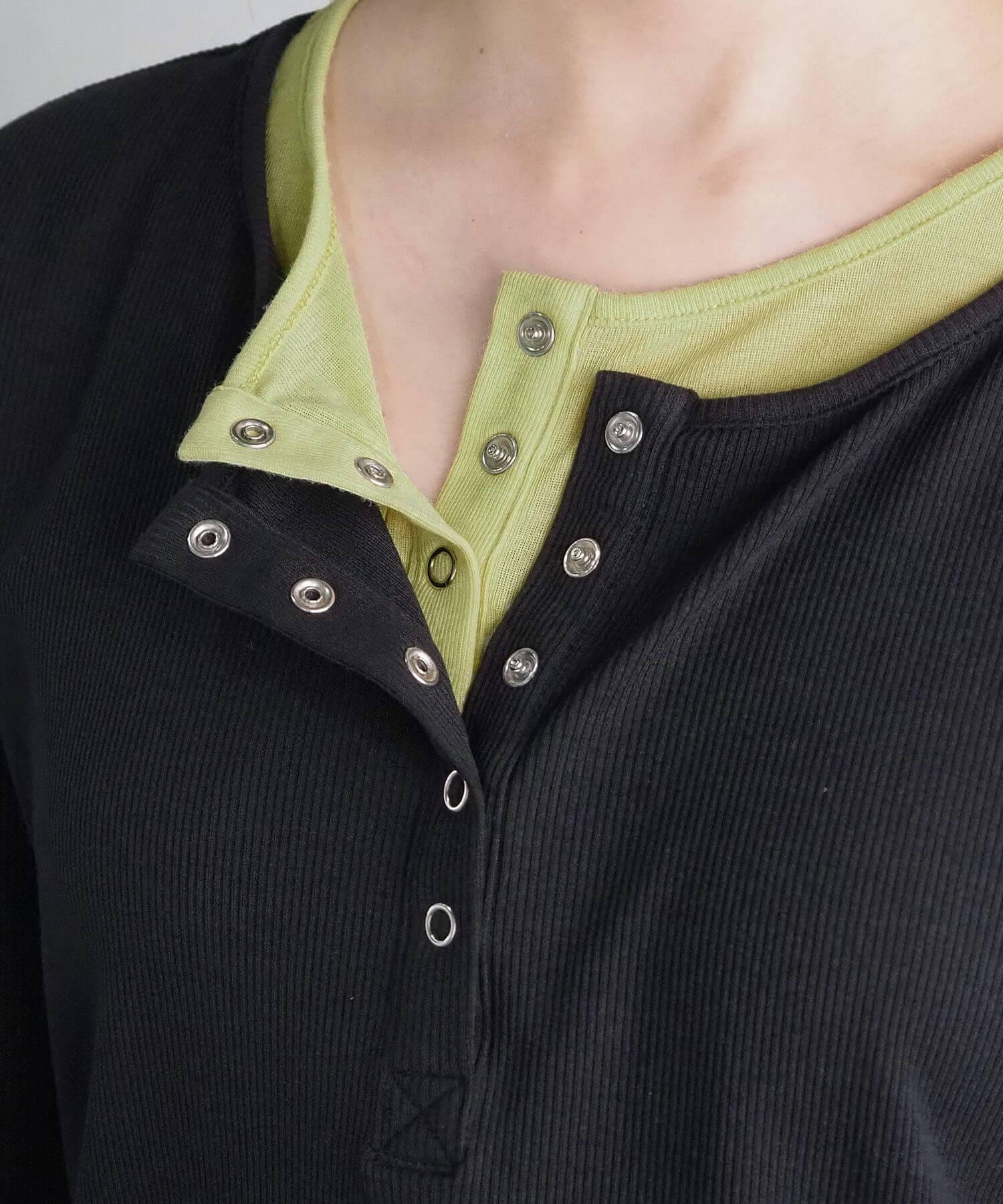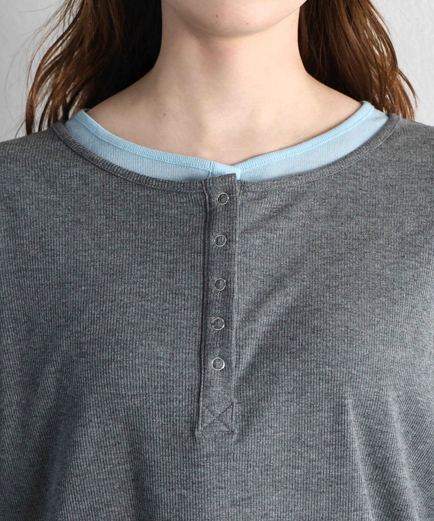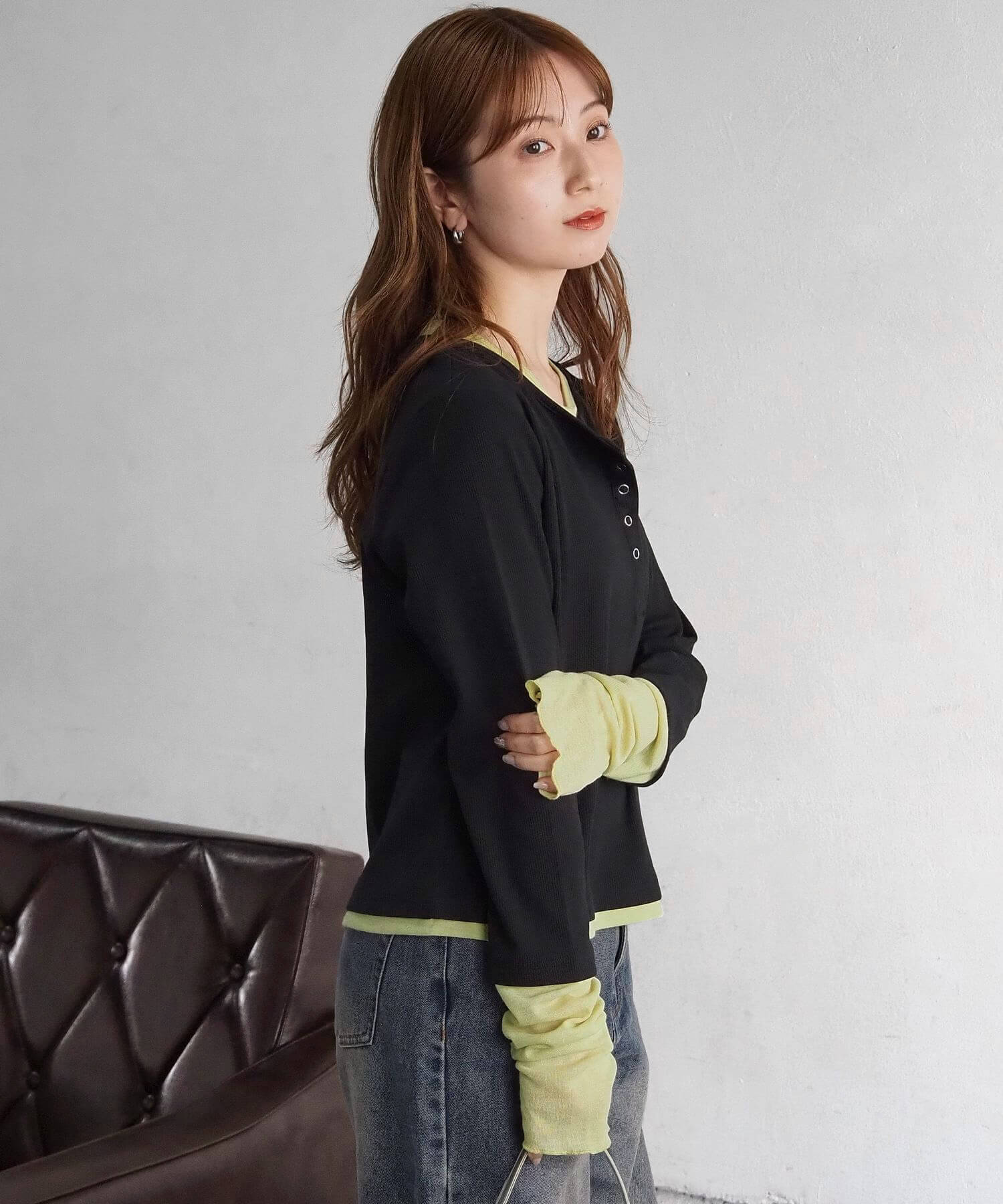 ・春夏定番のテレコ生地のヘンリーネックロンTに、軽やかなシアー素材のヘンリーネックを重ねました。
