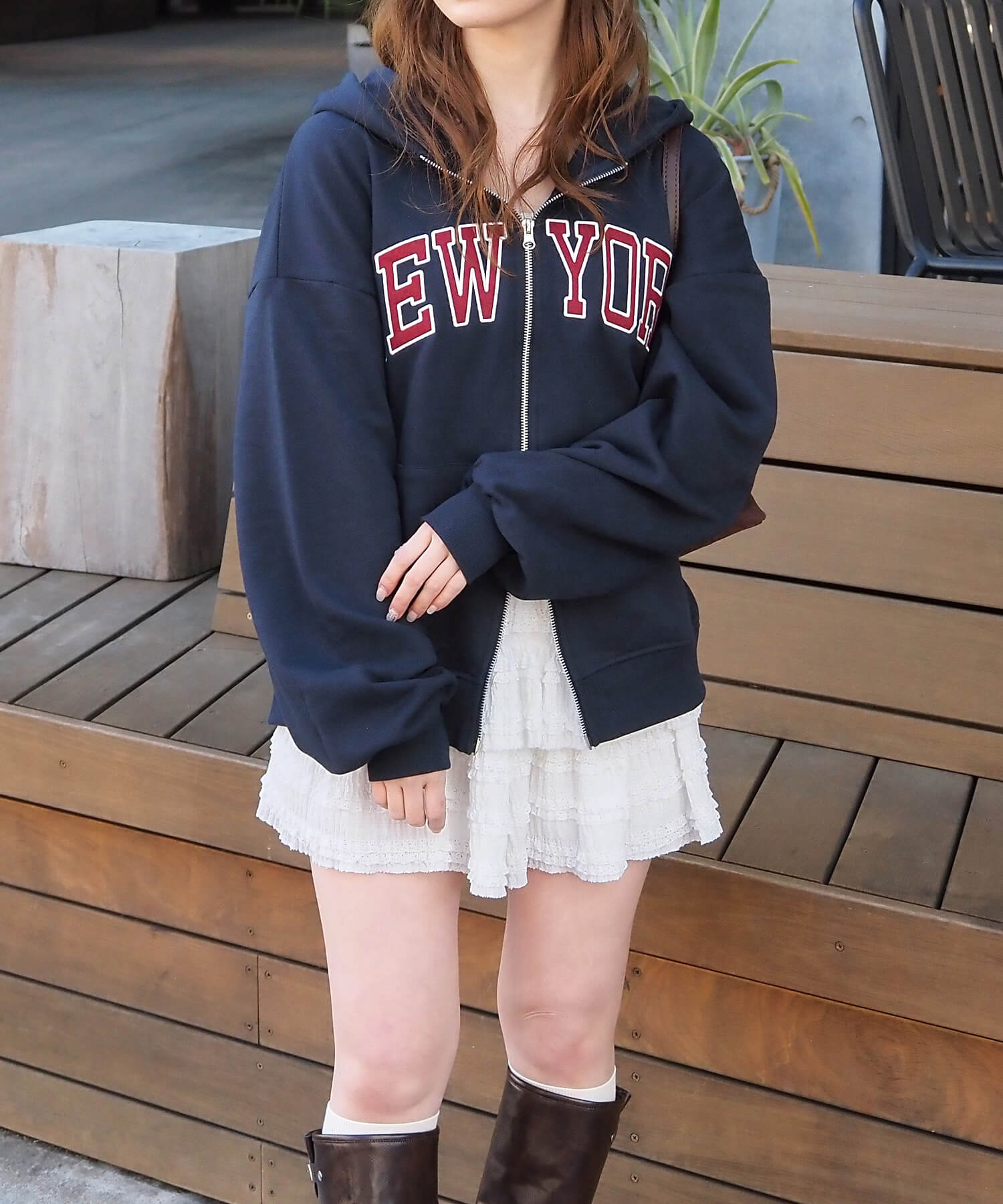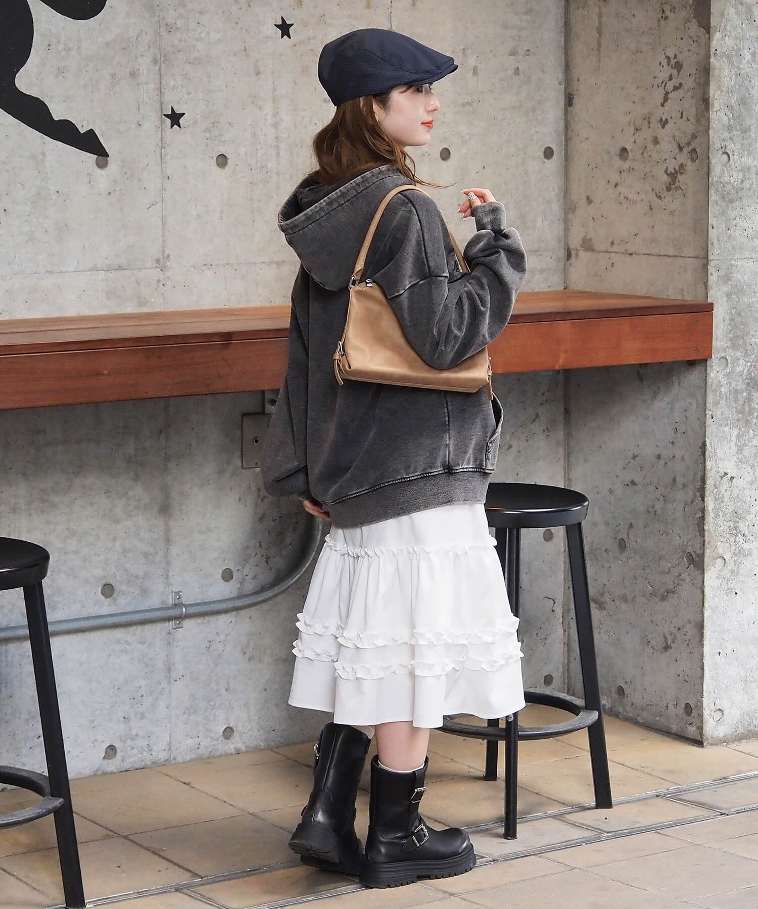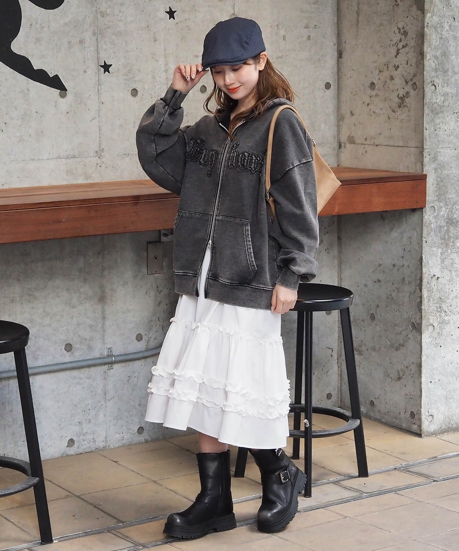 ・ビッグシルエットが映えるミニスカートでガーリーカジュアルに。