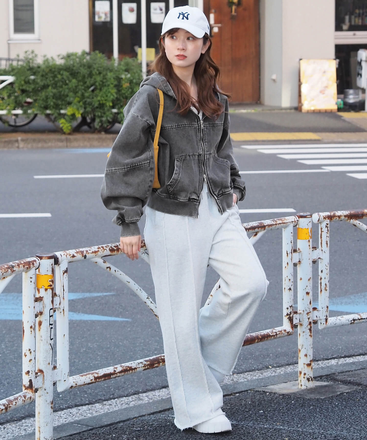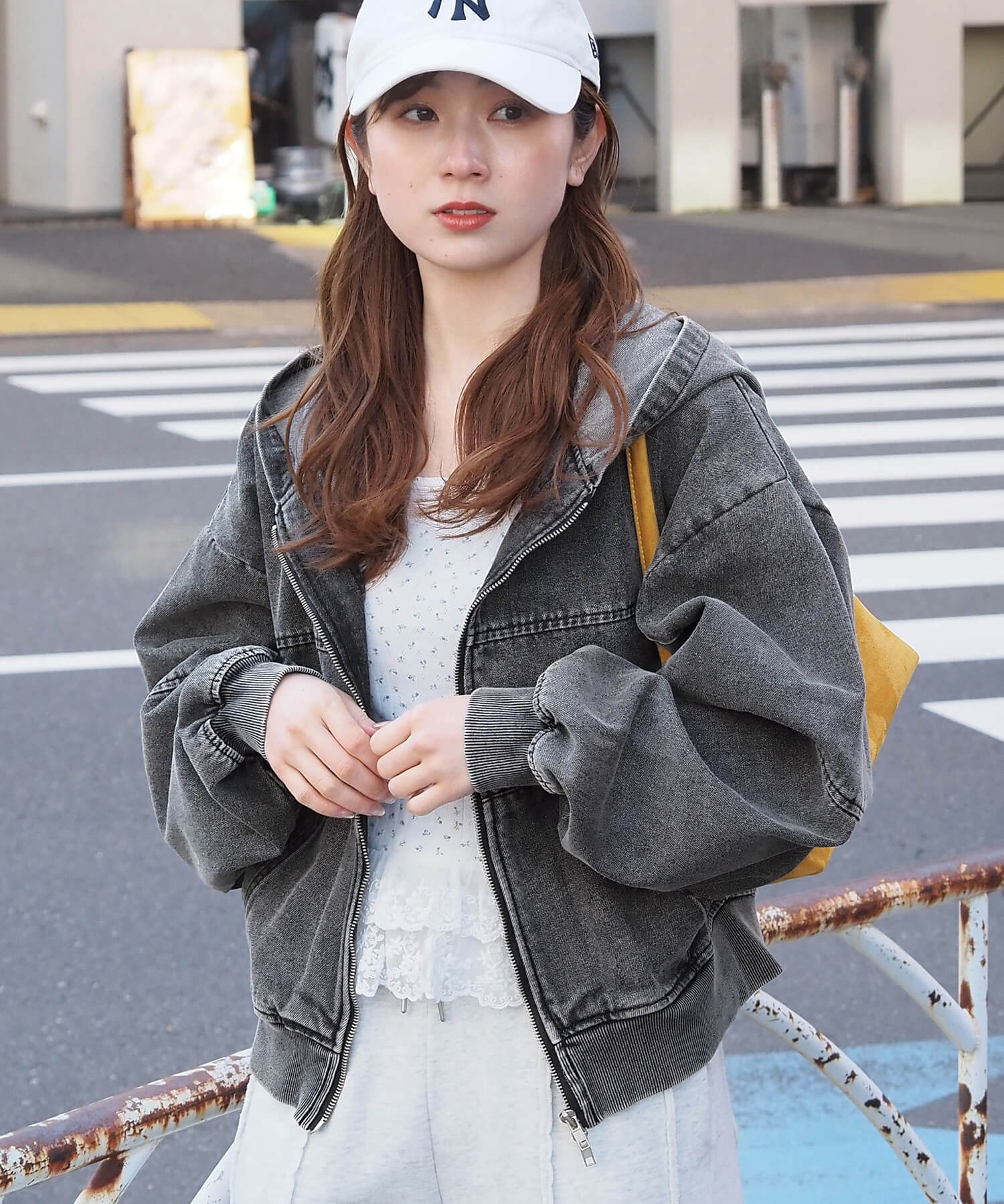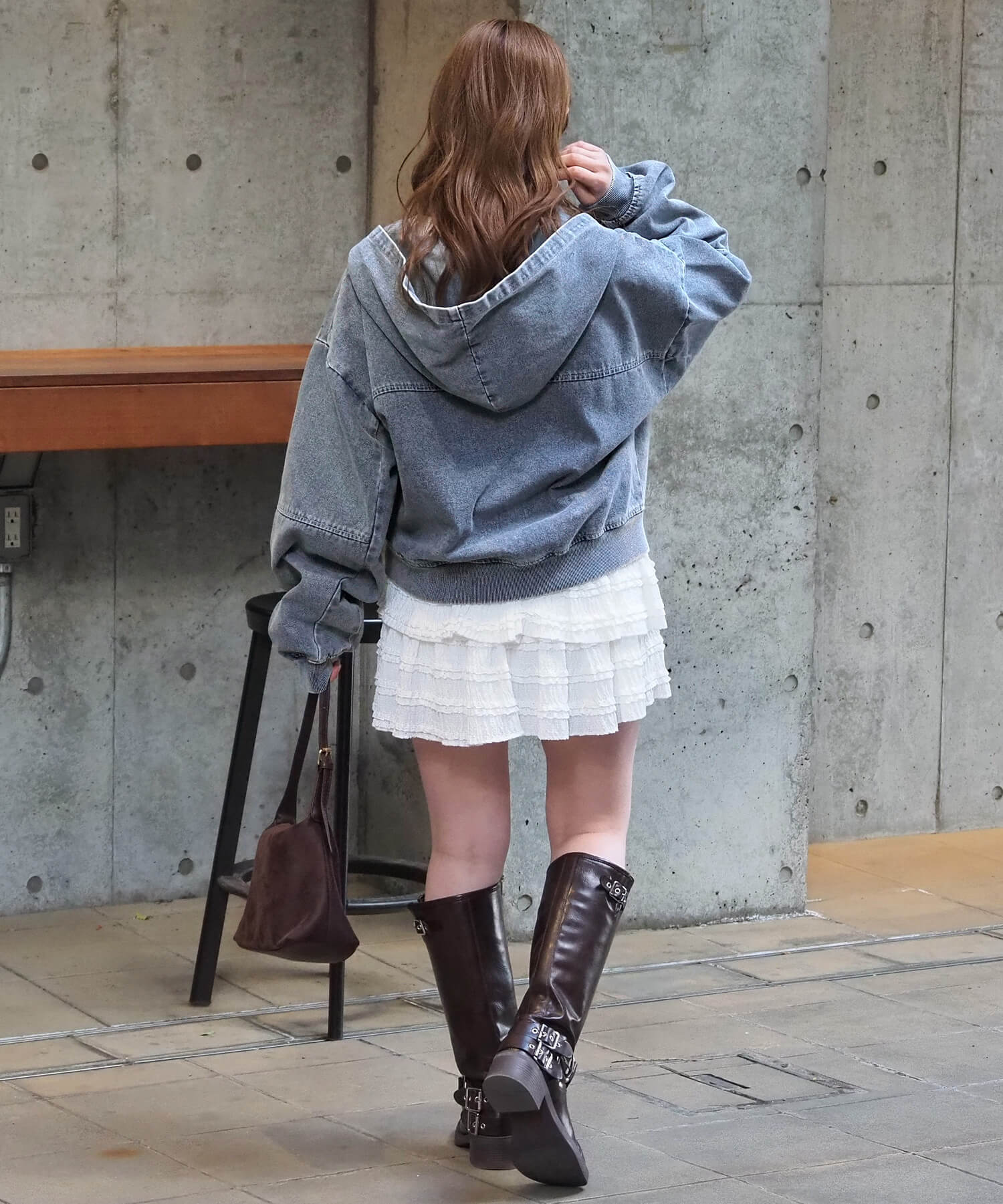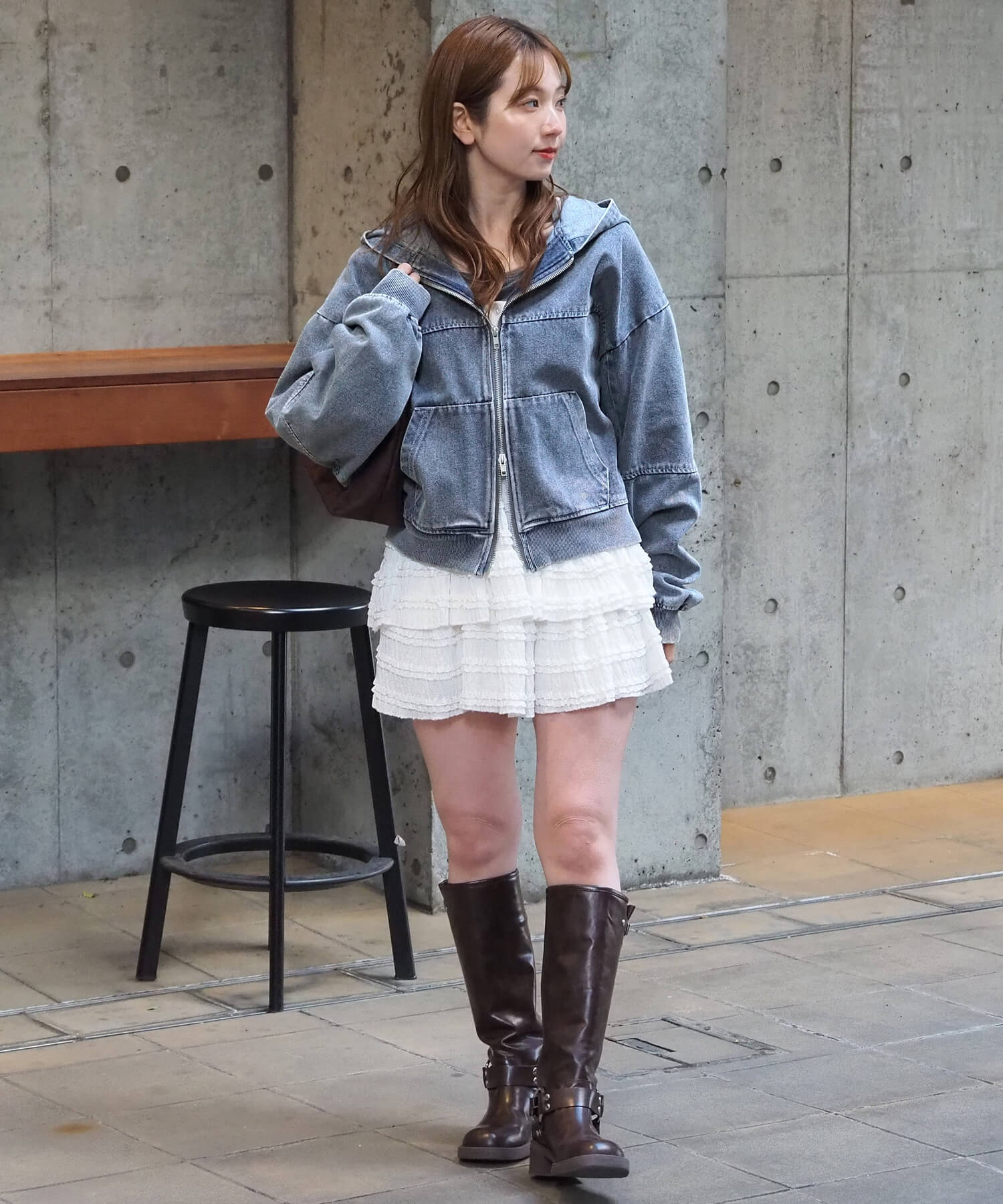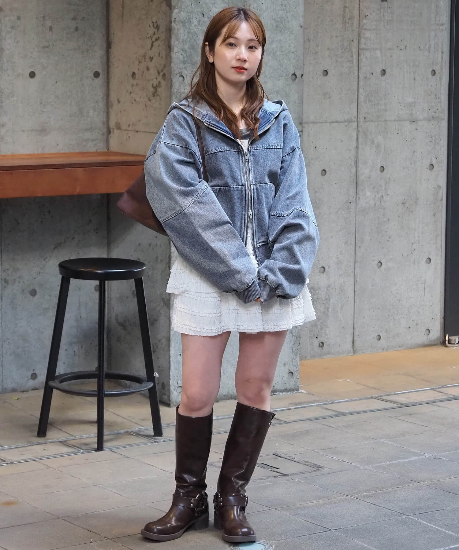 ・ミニボトムでスタイルアップコーデ。ショート丈で目線が上がり、ボリューム袖とビッグフードが華奢見えも叶う優勝コーデです。