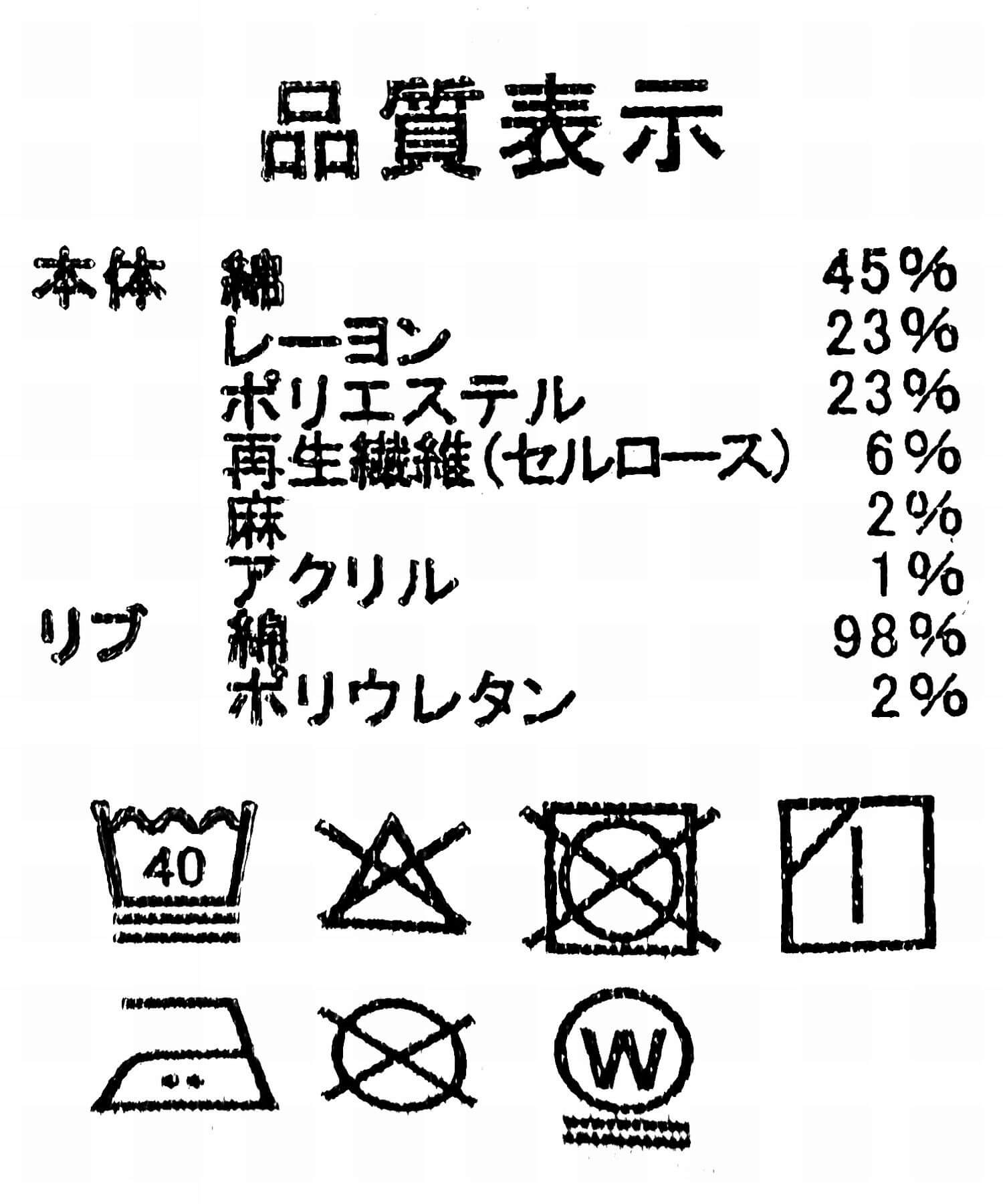 本体: コットン45%, レーヨン23%, ポリエステル23%, セルロース6%, 麻2%, アクリル1%, リブ: コットン98%, ポリウレタン2%