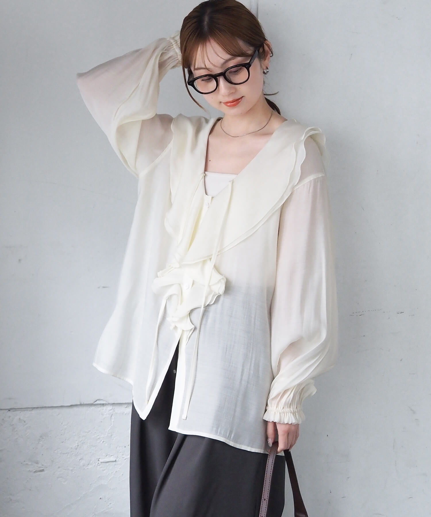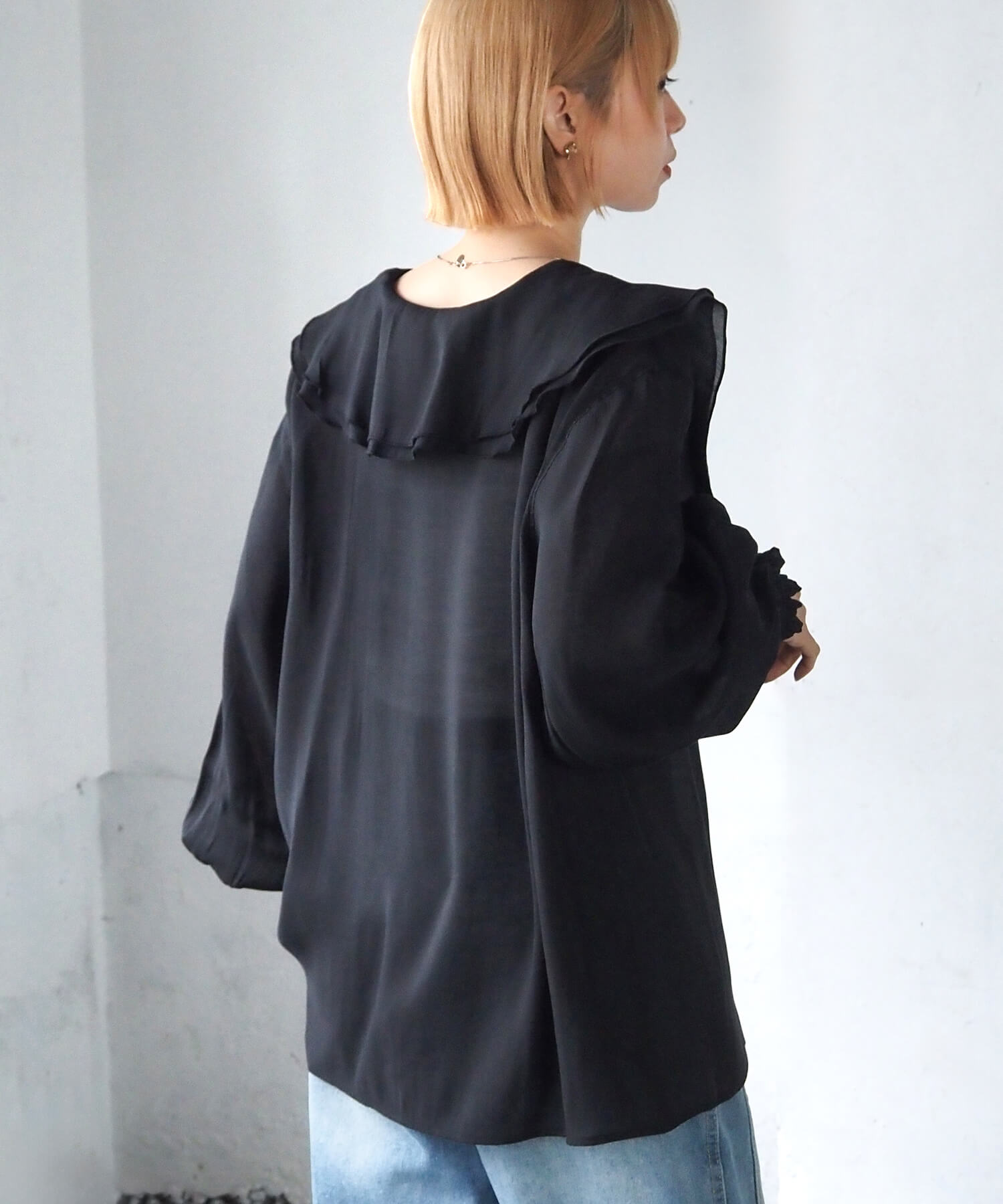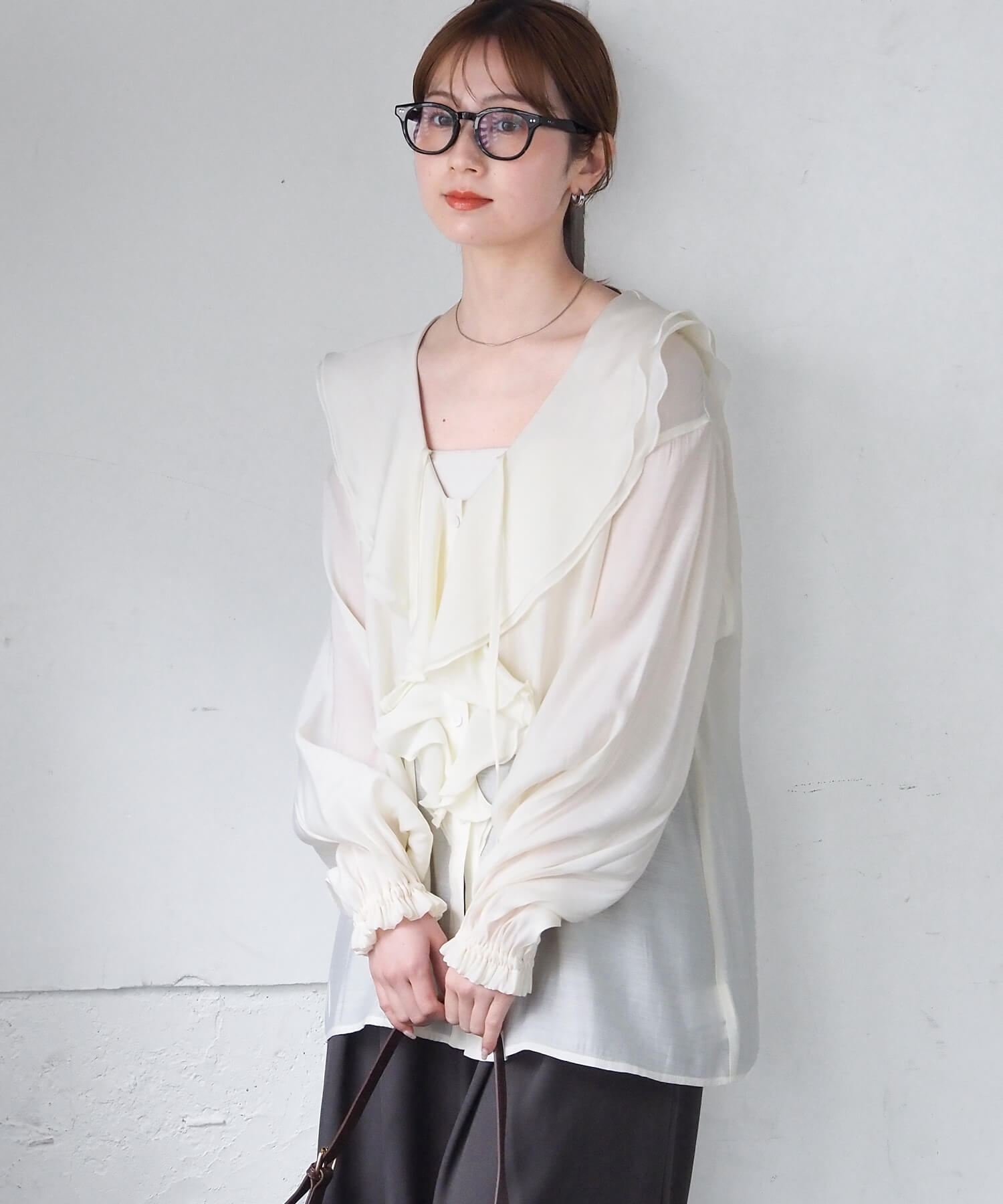 ・大ぶりなフリル襟がキャッチーなシアーブラウスです。