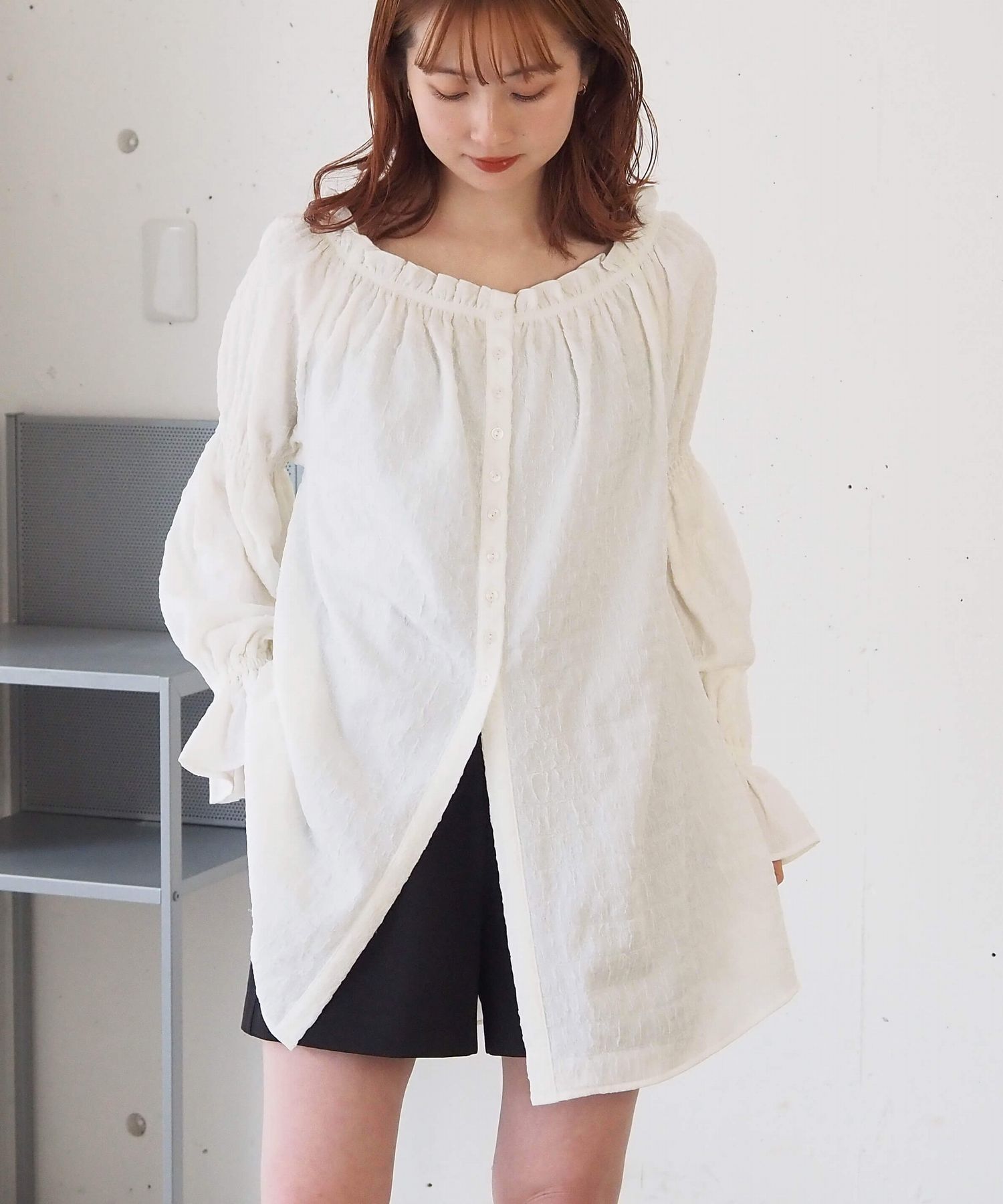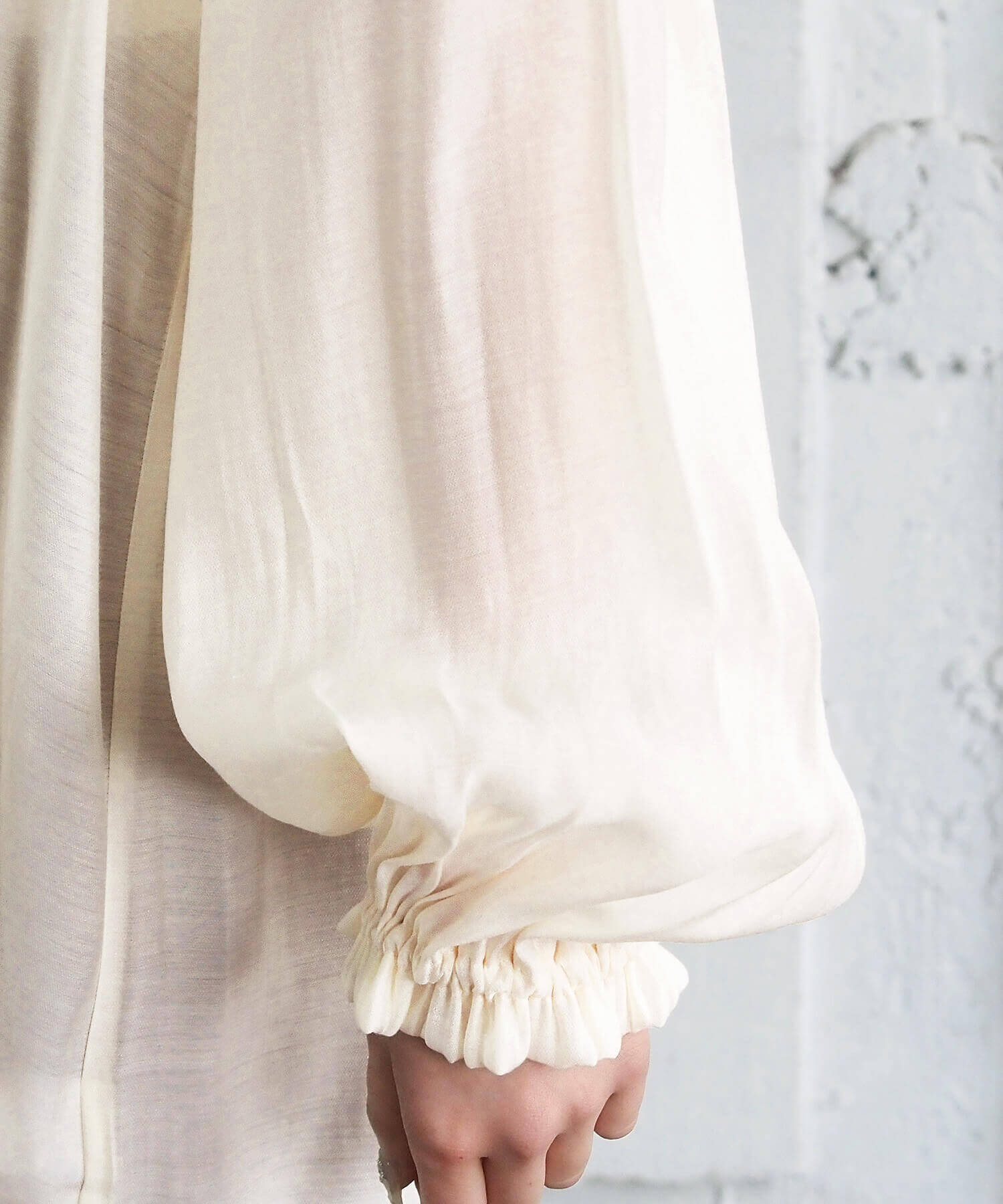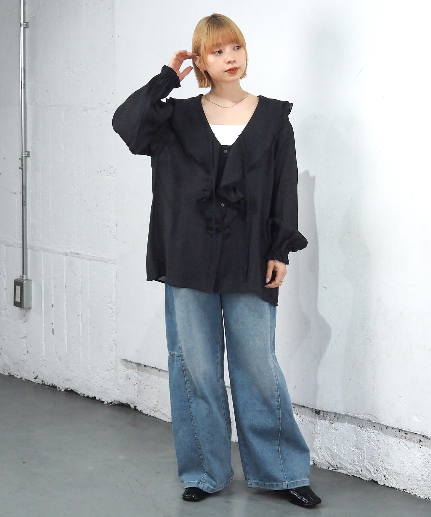 ・大ぶりなフリル襟がキャッチーなシアーブラウスです。
