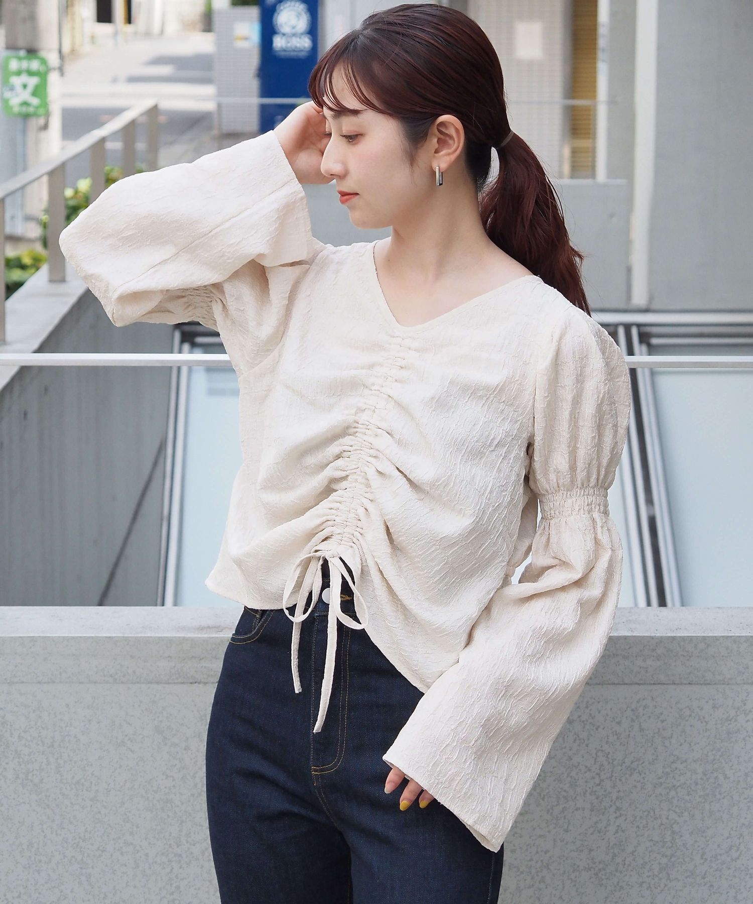 ・ボトムスにインしてコンパクトな着こなしも◎胸のフリルが強調され、メリハリのあるスタイリングに仕上がります。