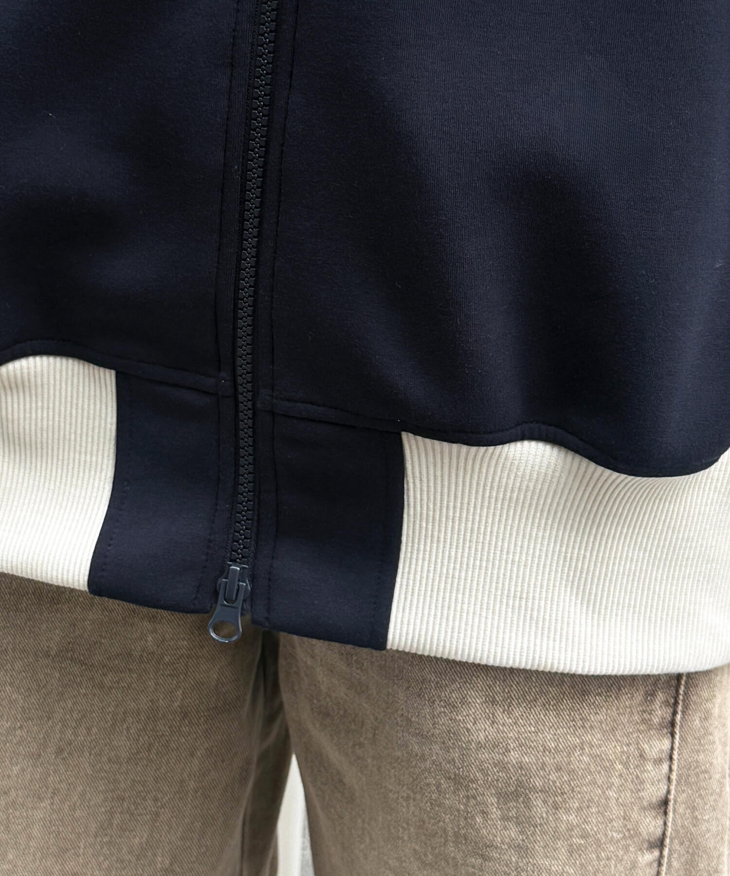・ジップを閉めてジャージトップスとして。裾のジップを開ければ、すっきり重心アップも可能です。