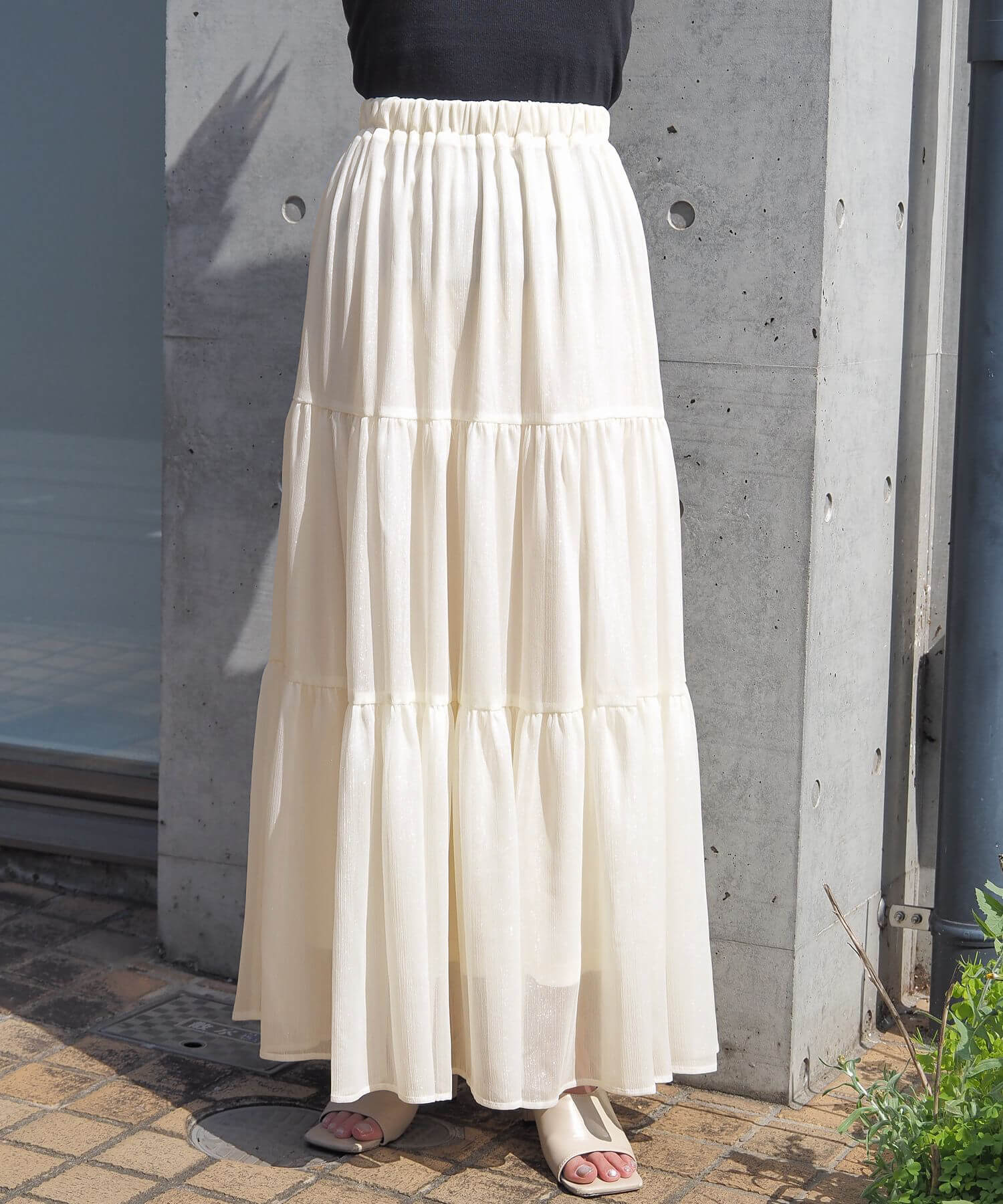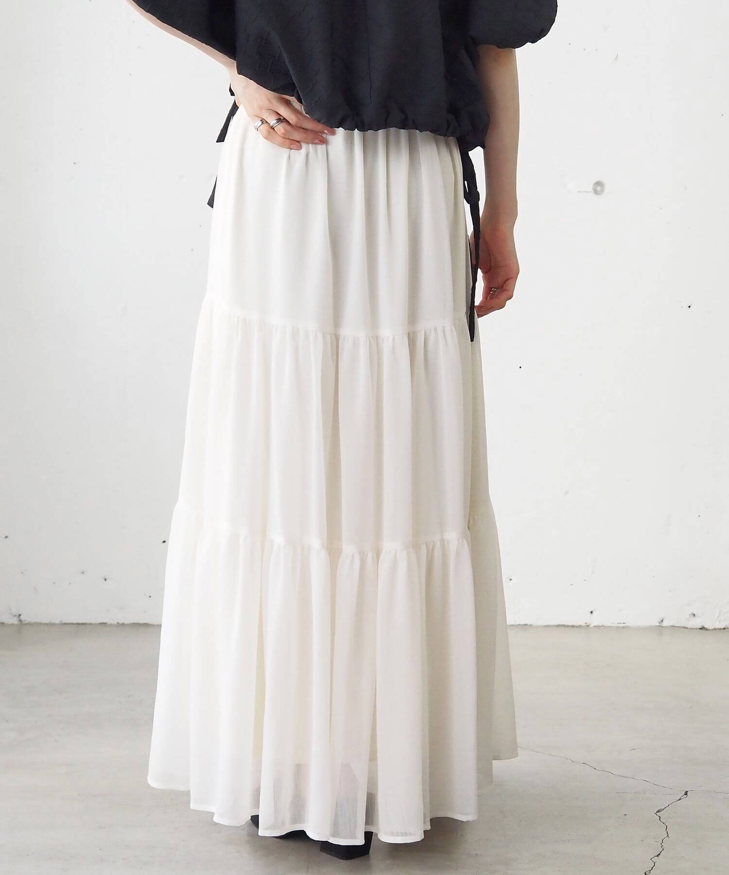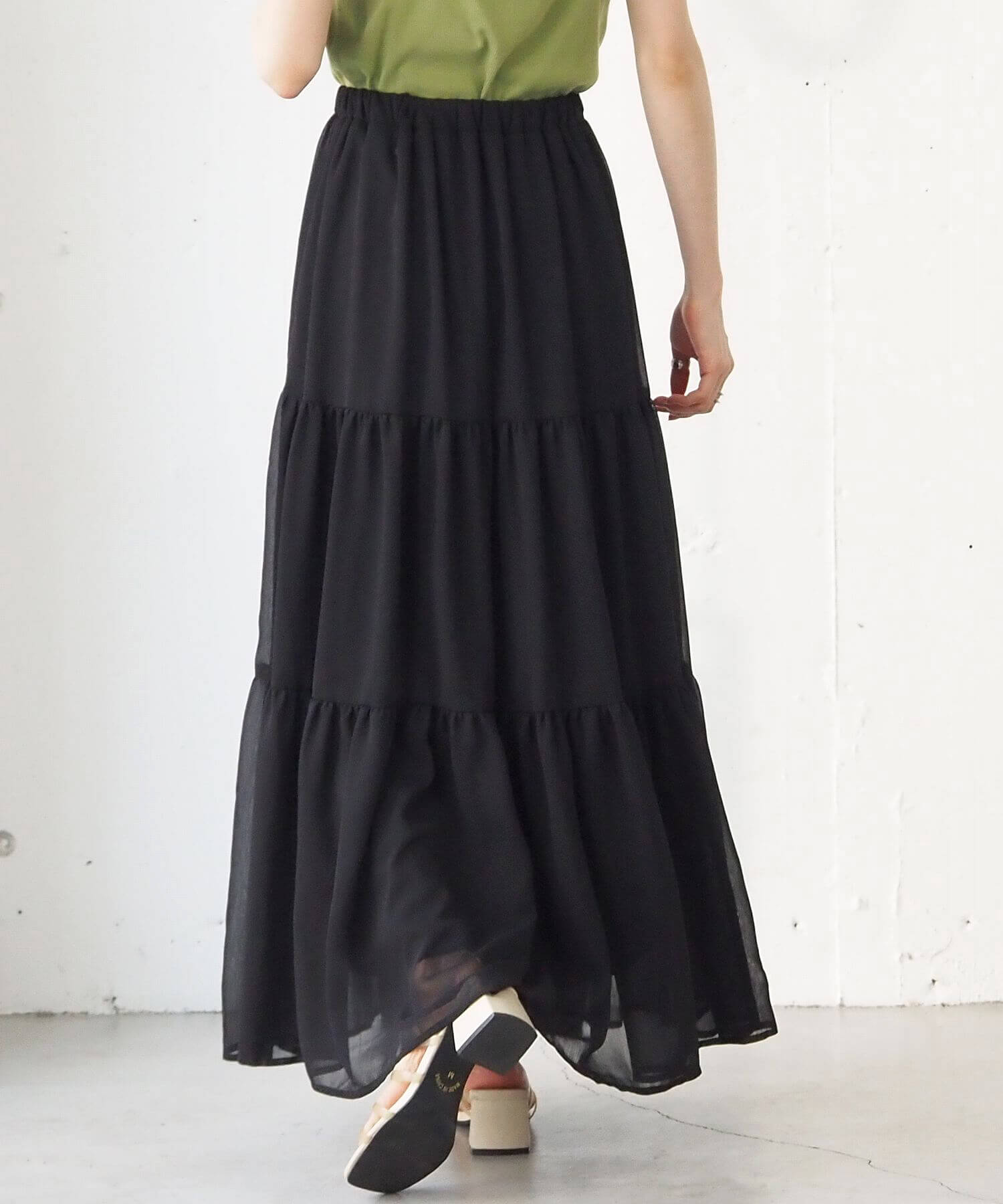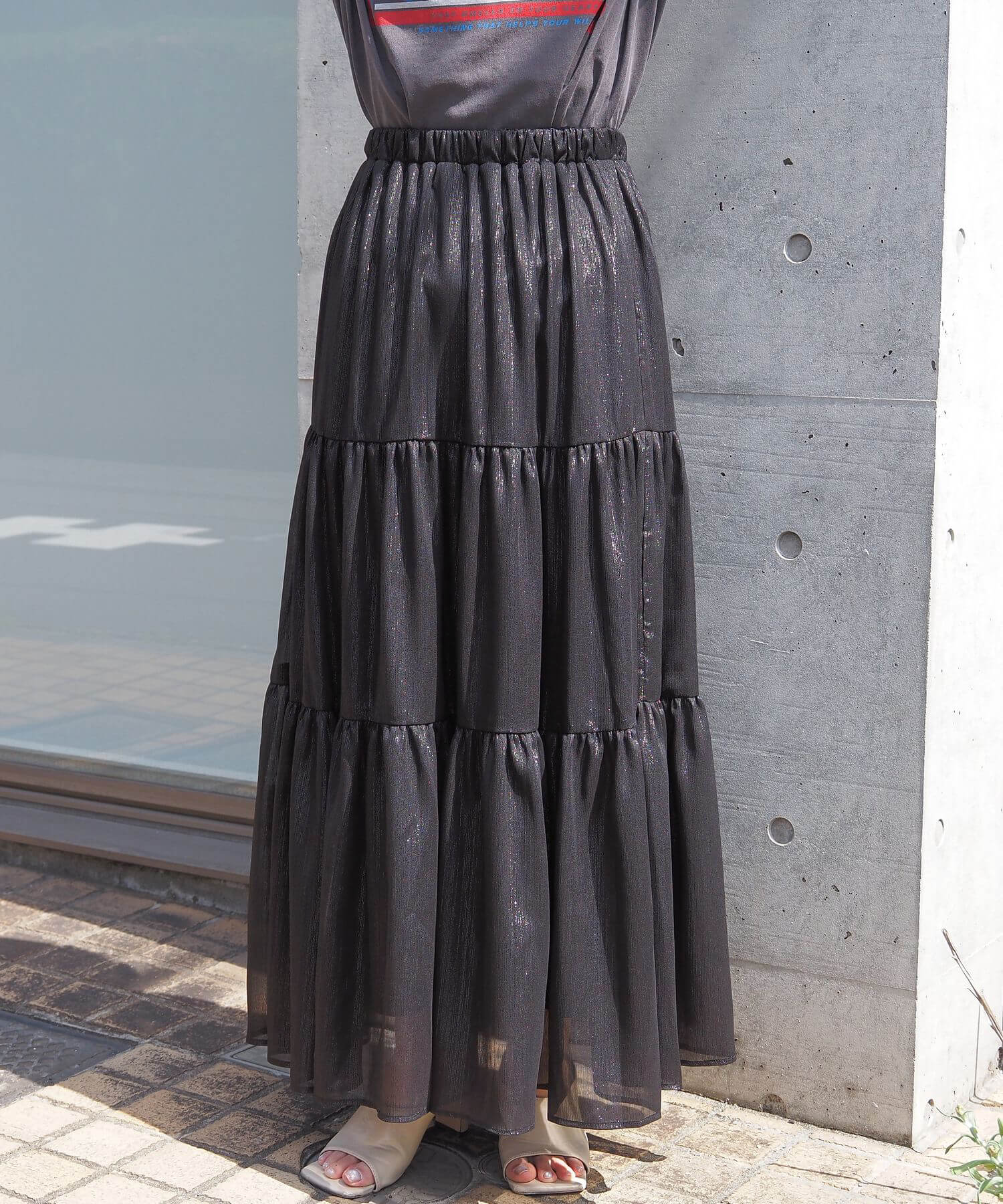 ・ふんわりとした素材感が女性らしいロング丈のティアードスカート。
