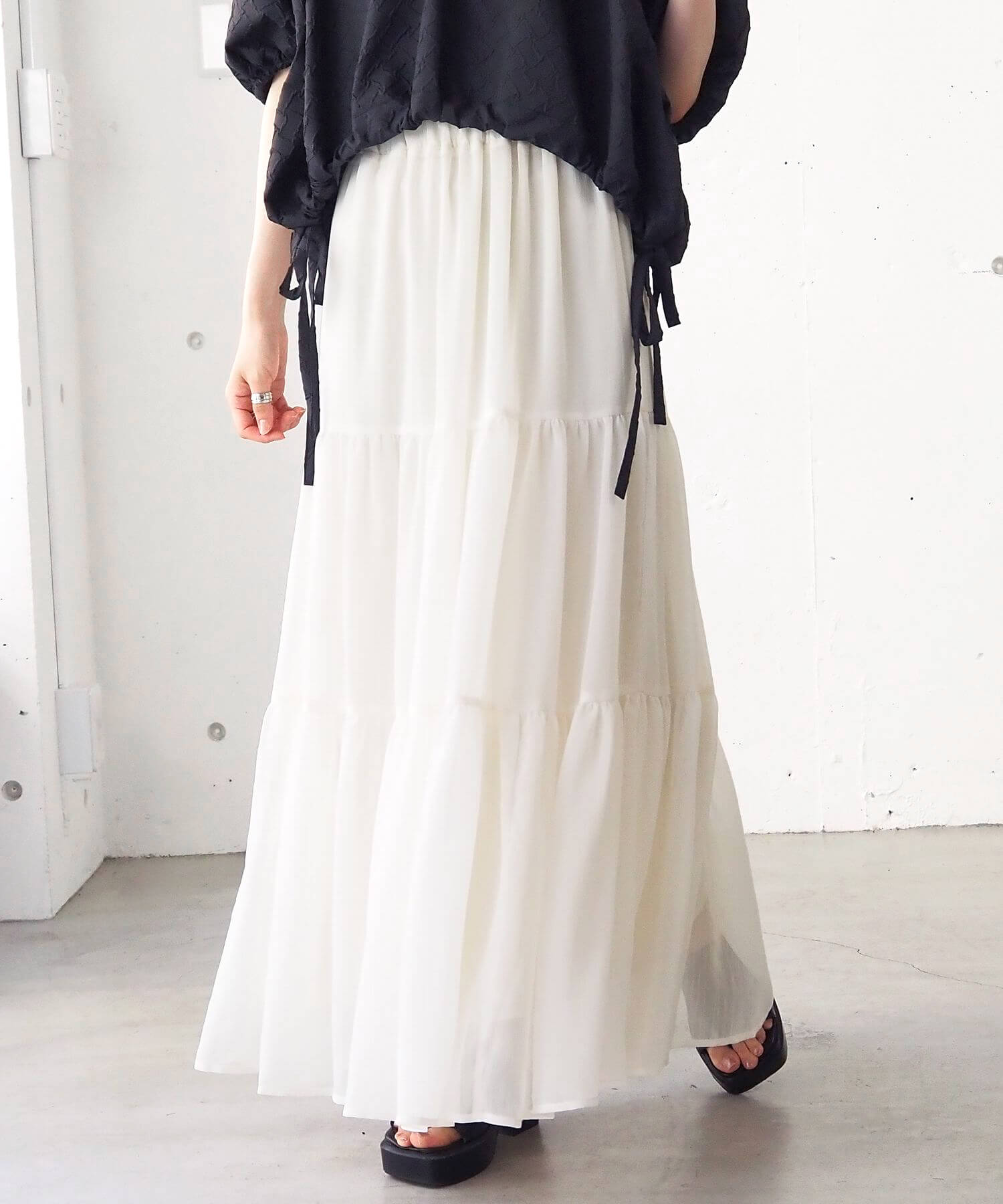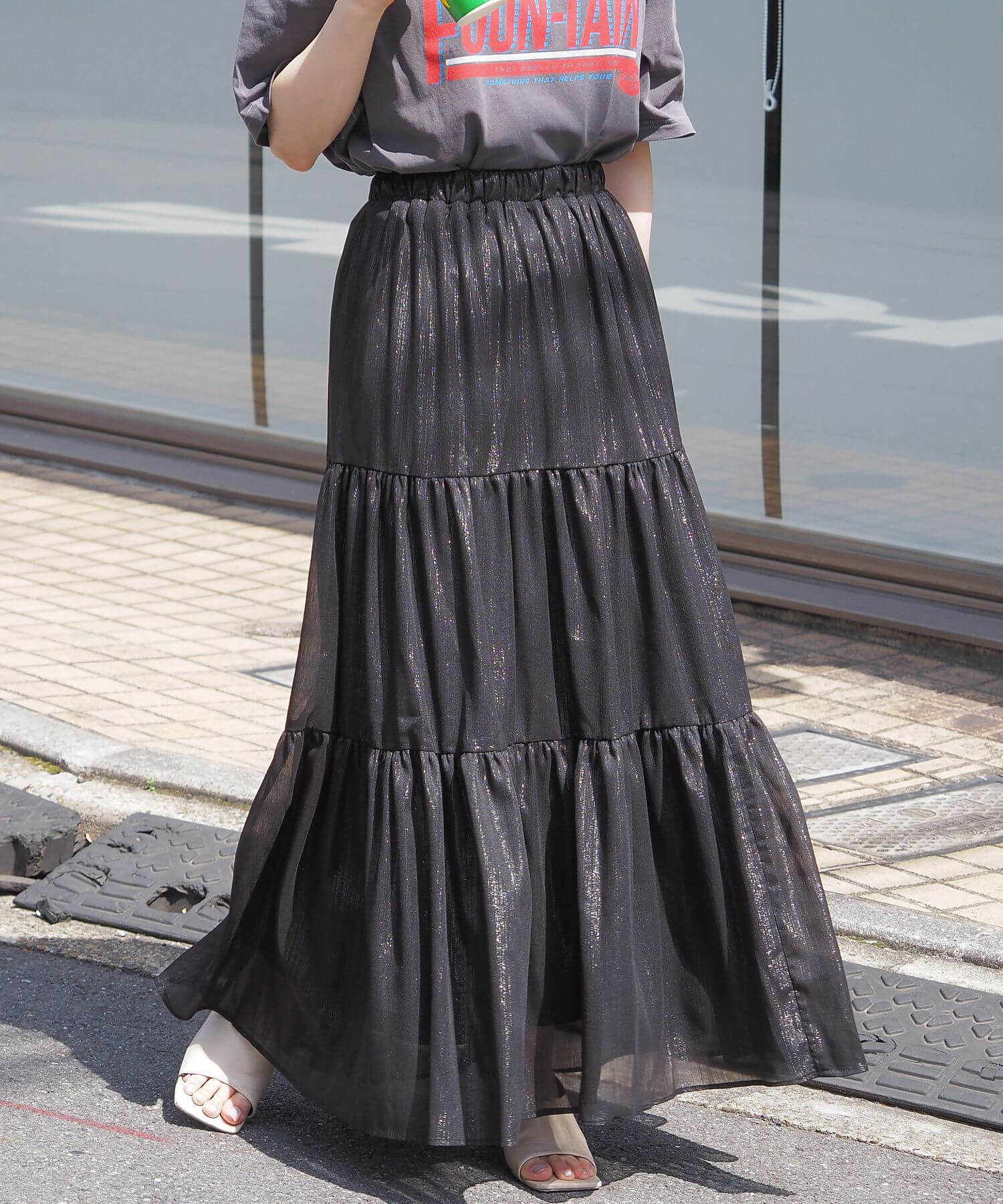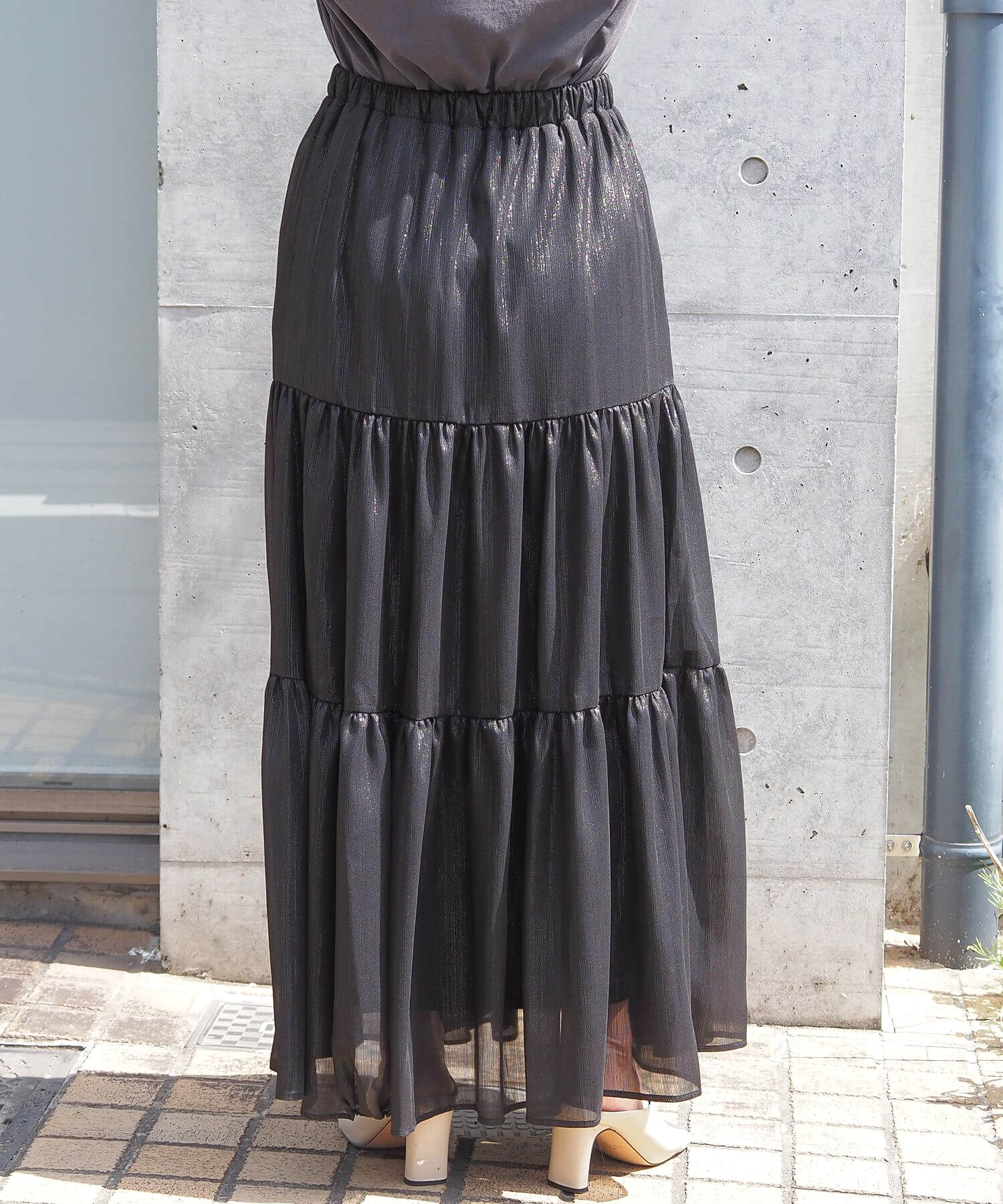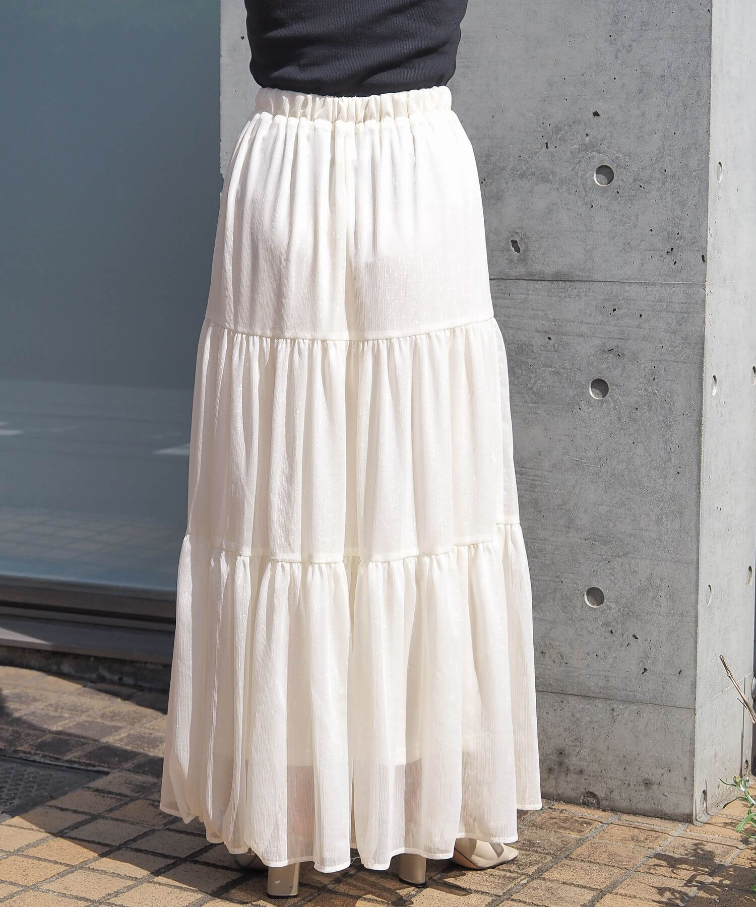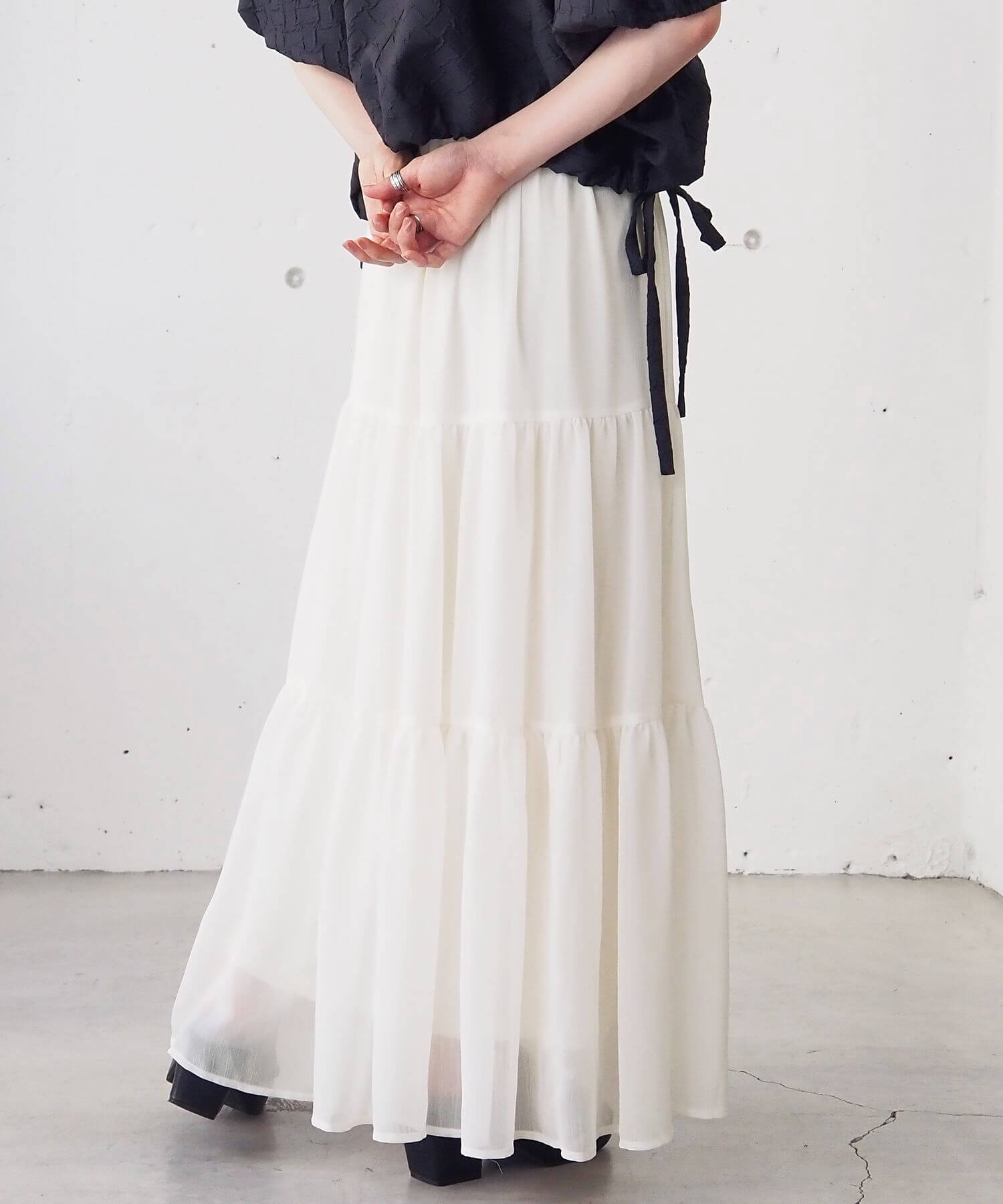 ・ふんわりとした素材感が女性らしいロング丈のティアードスカート。