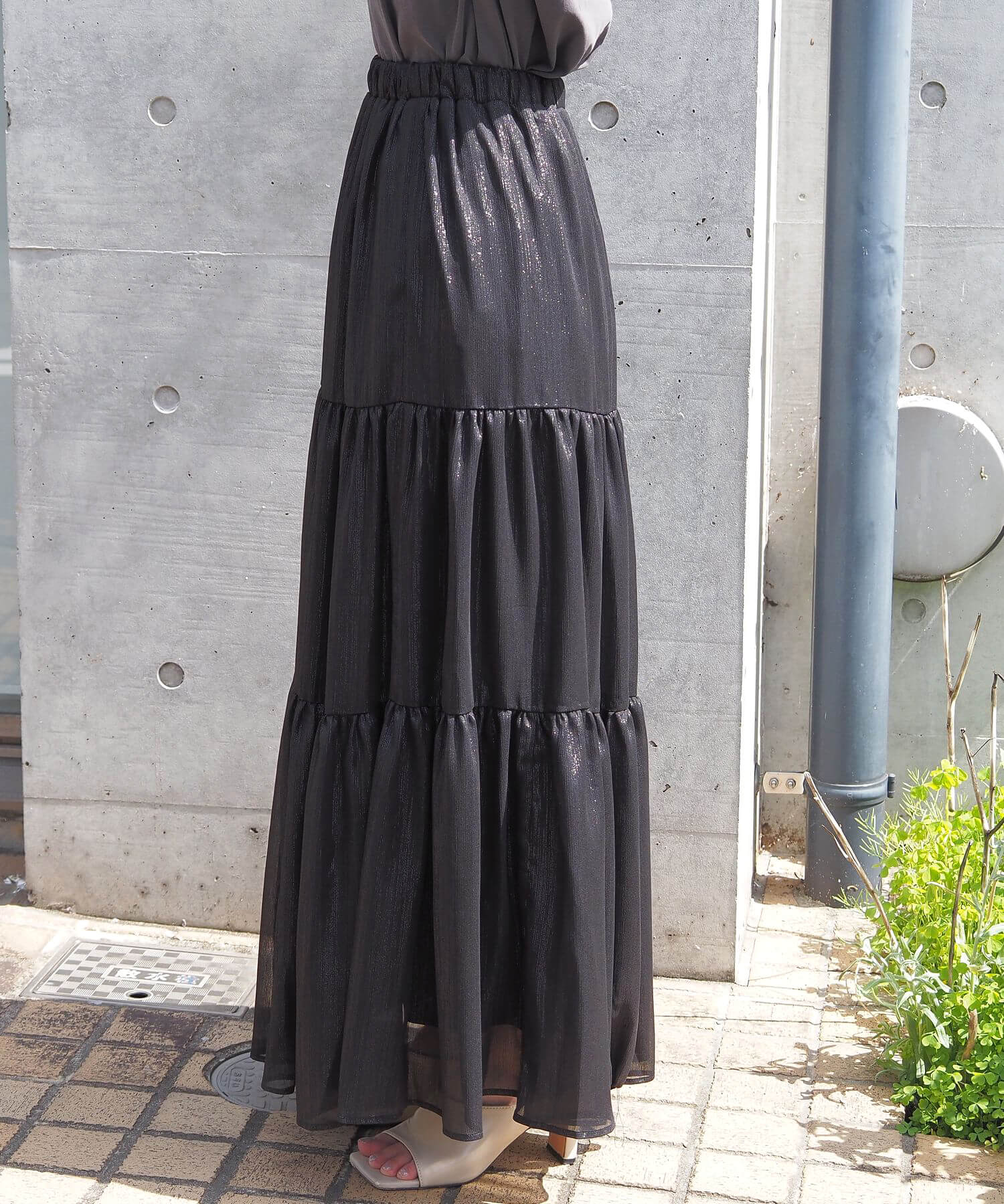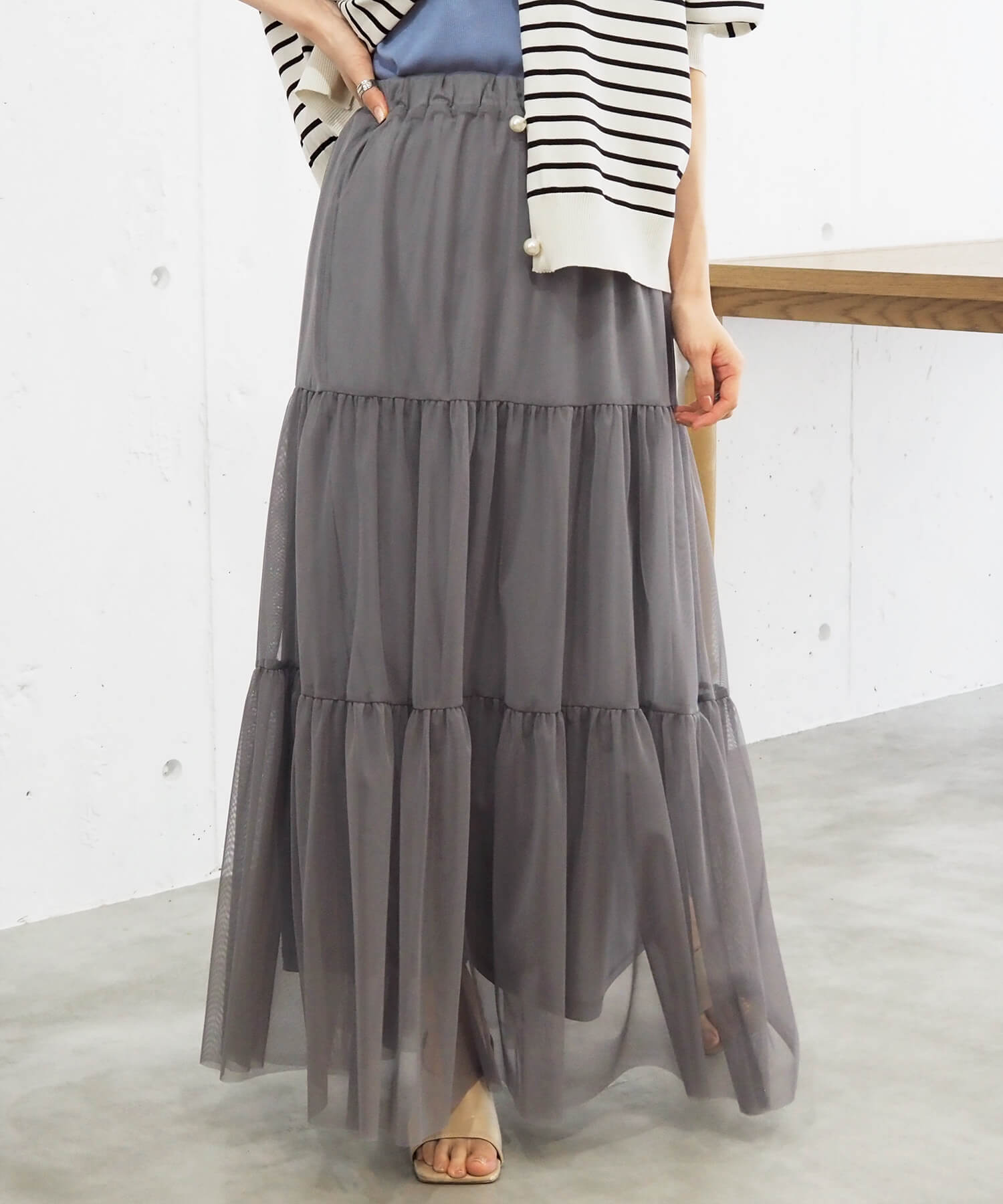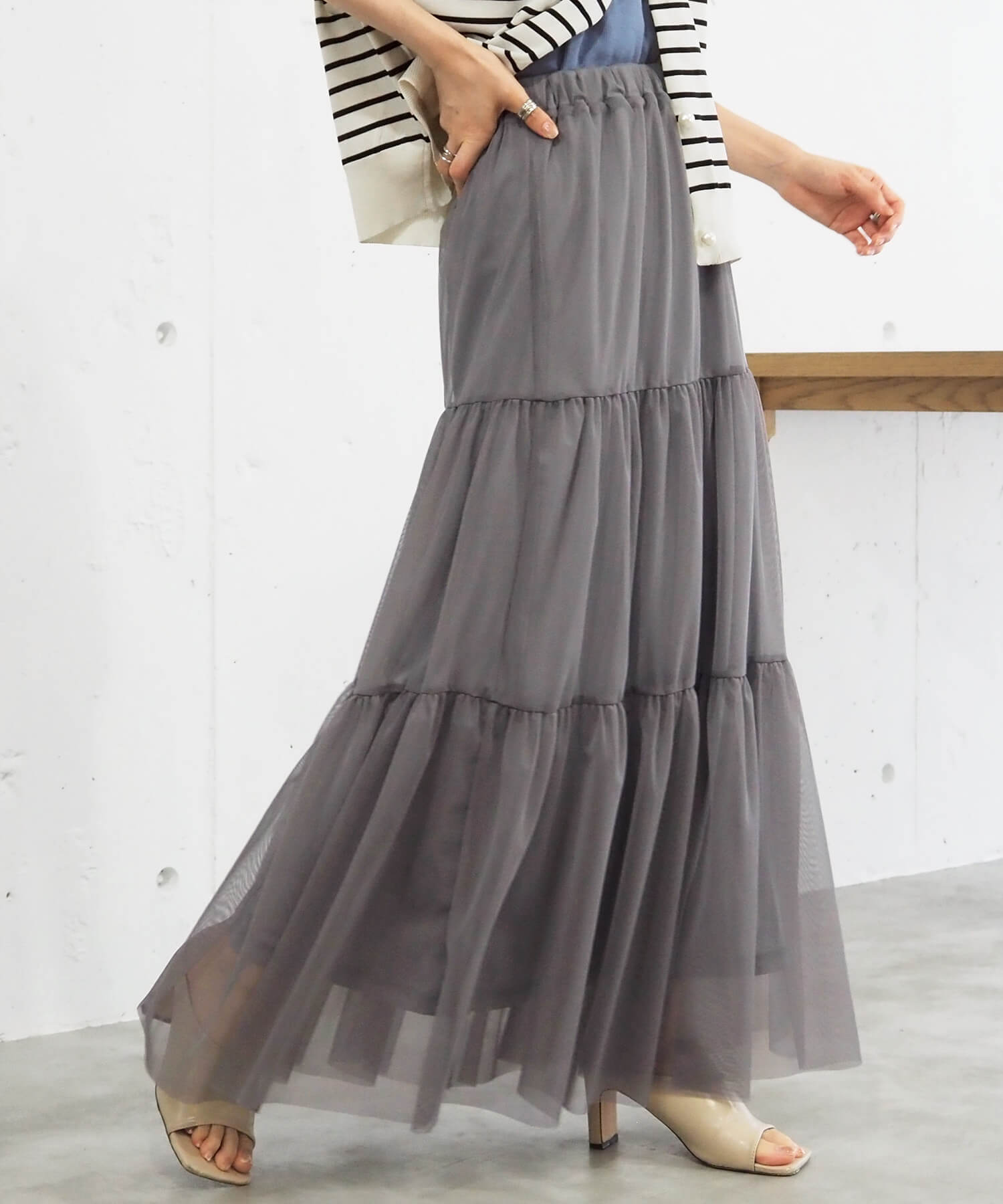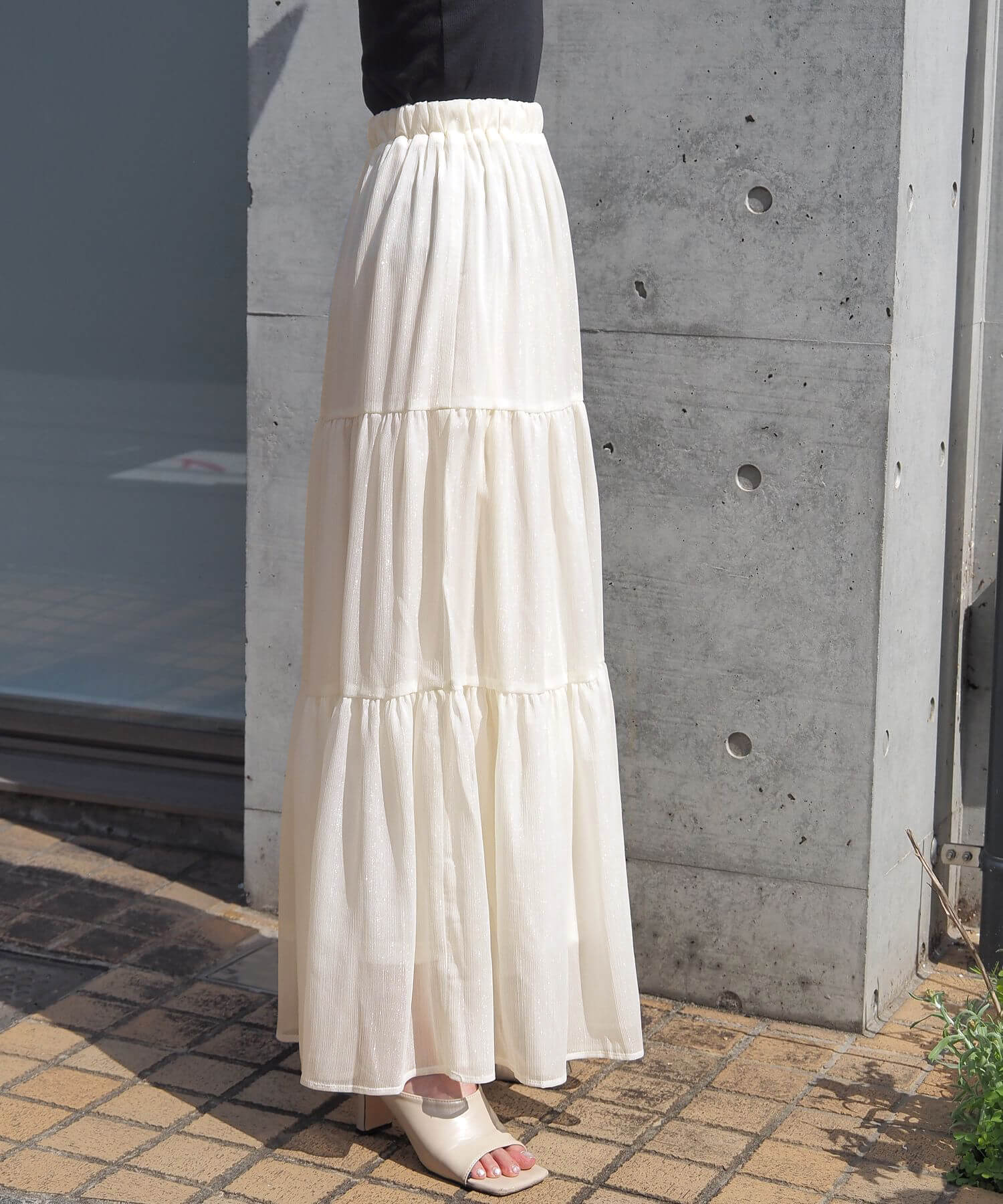 ・ふんわりとした素材感が女性らしいロング丈のティアードスカート。