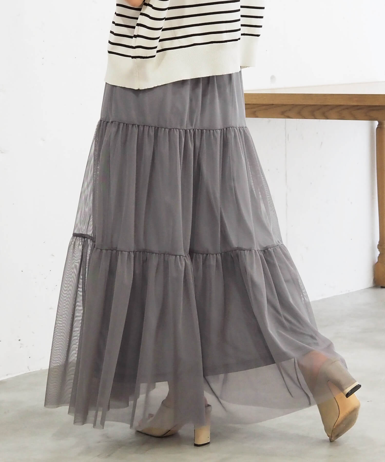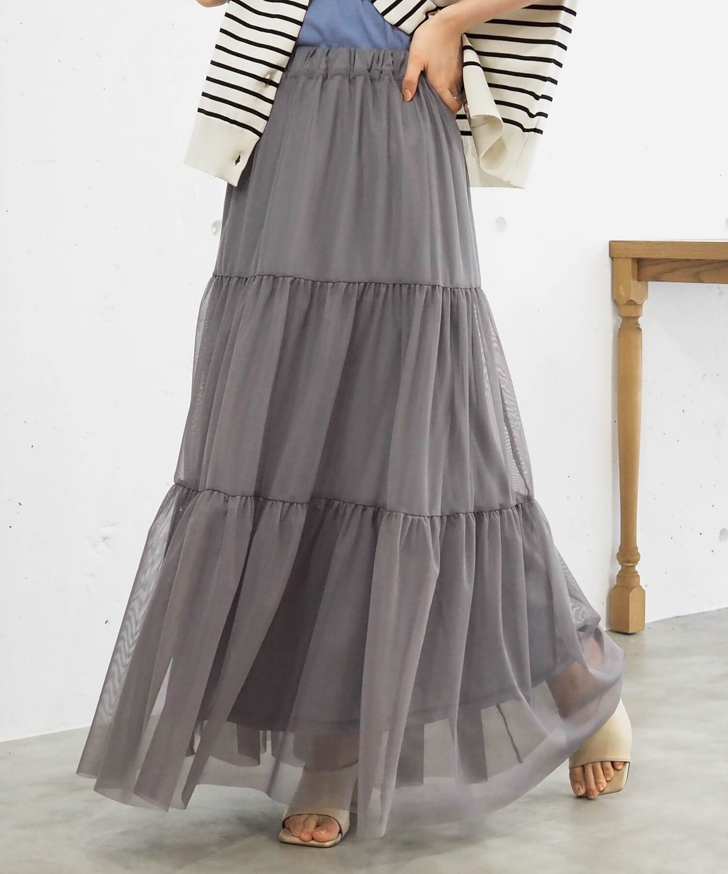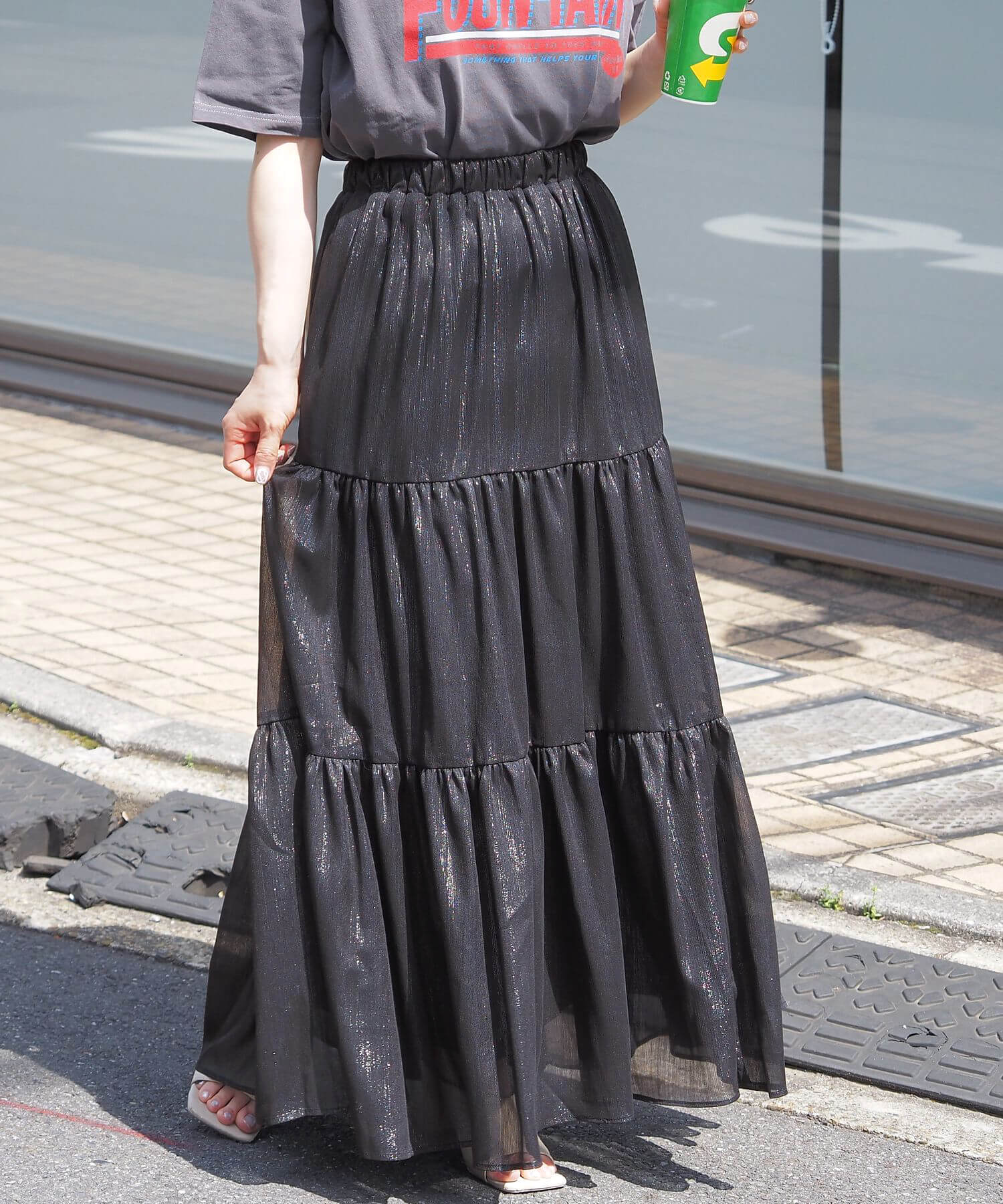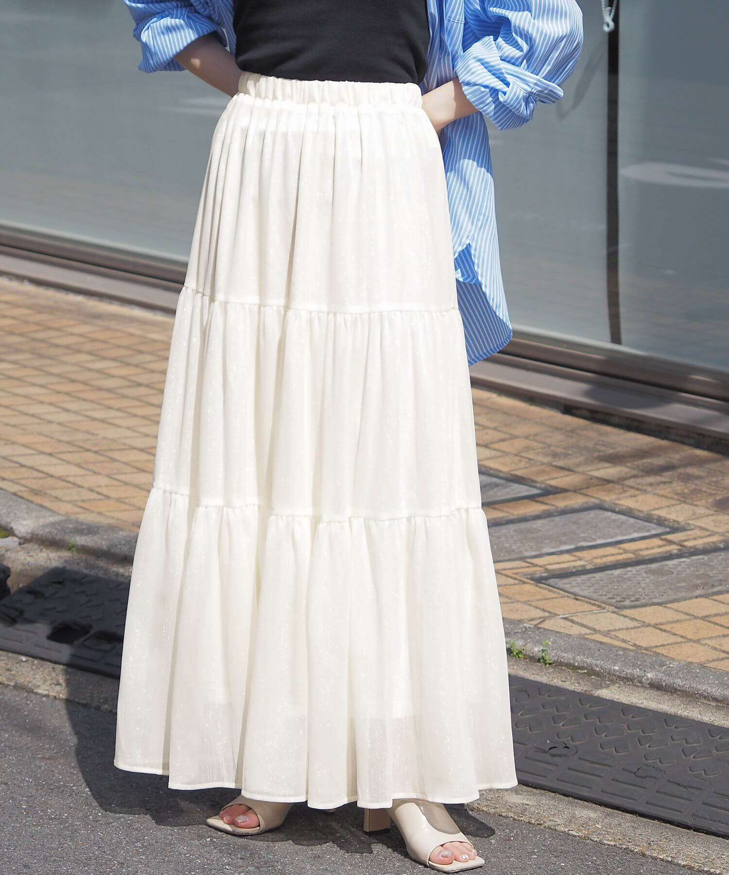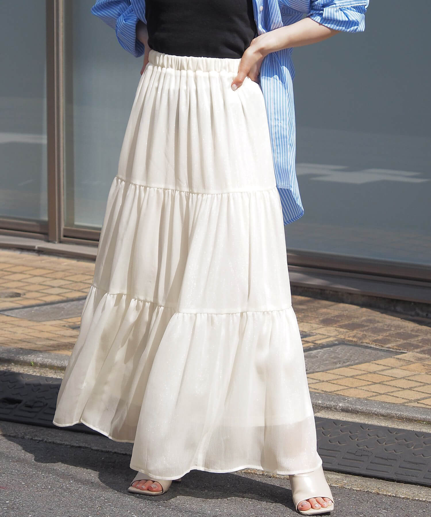 ・ふんわりとした素材感が女性らしいロング丈のティアードスカート。