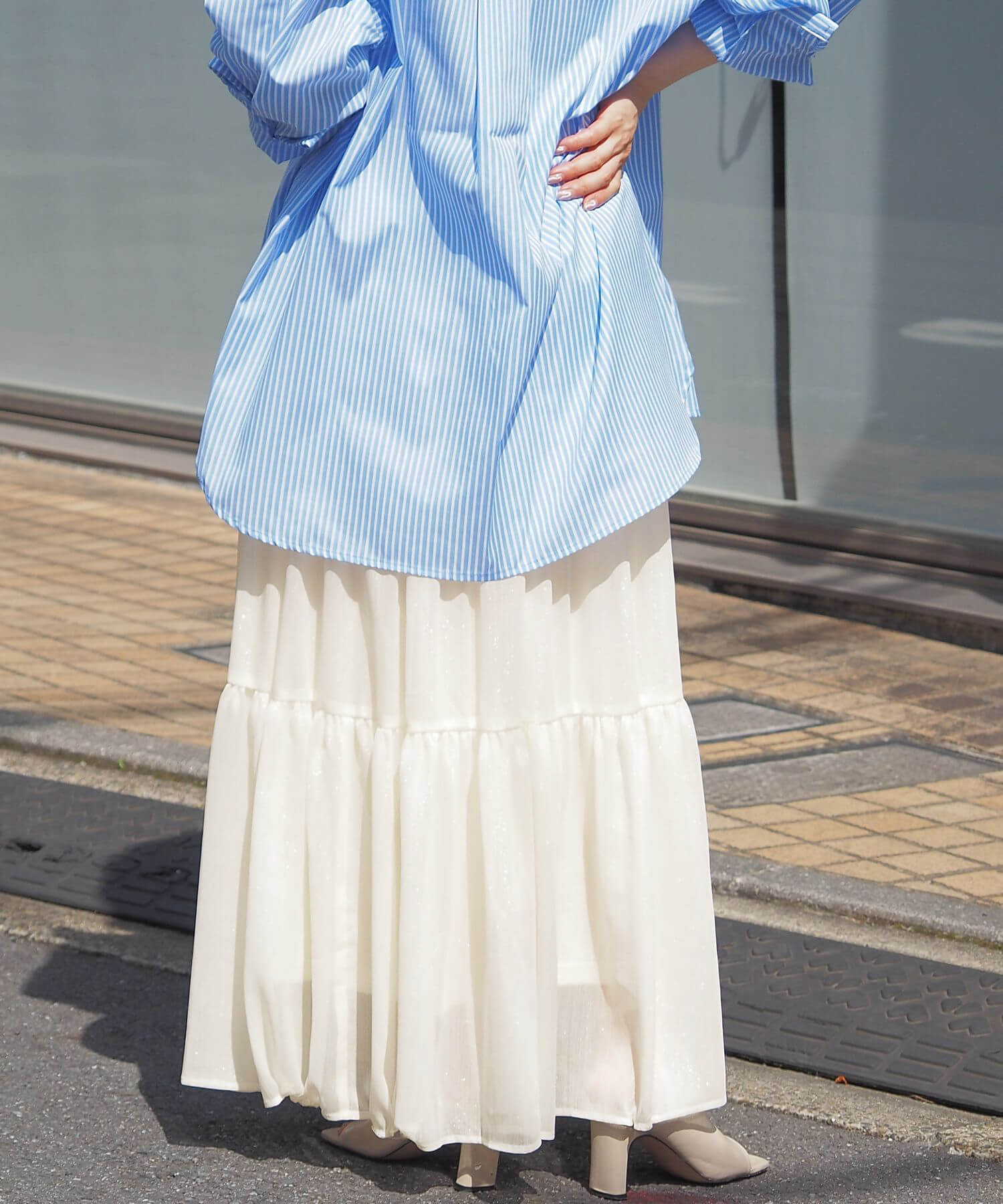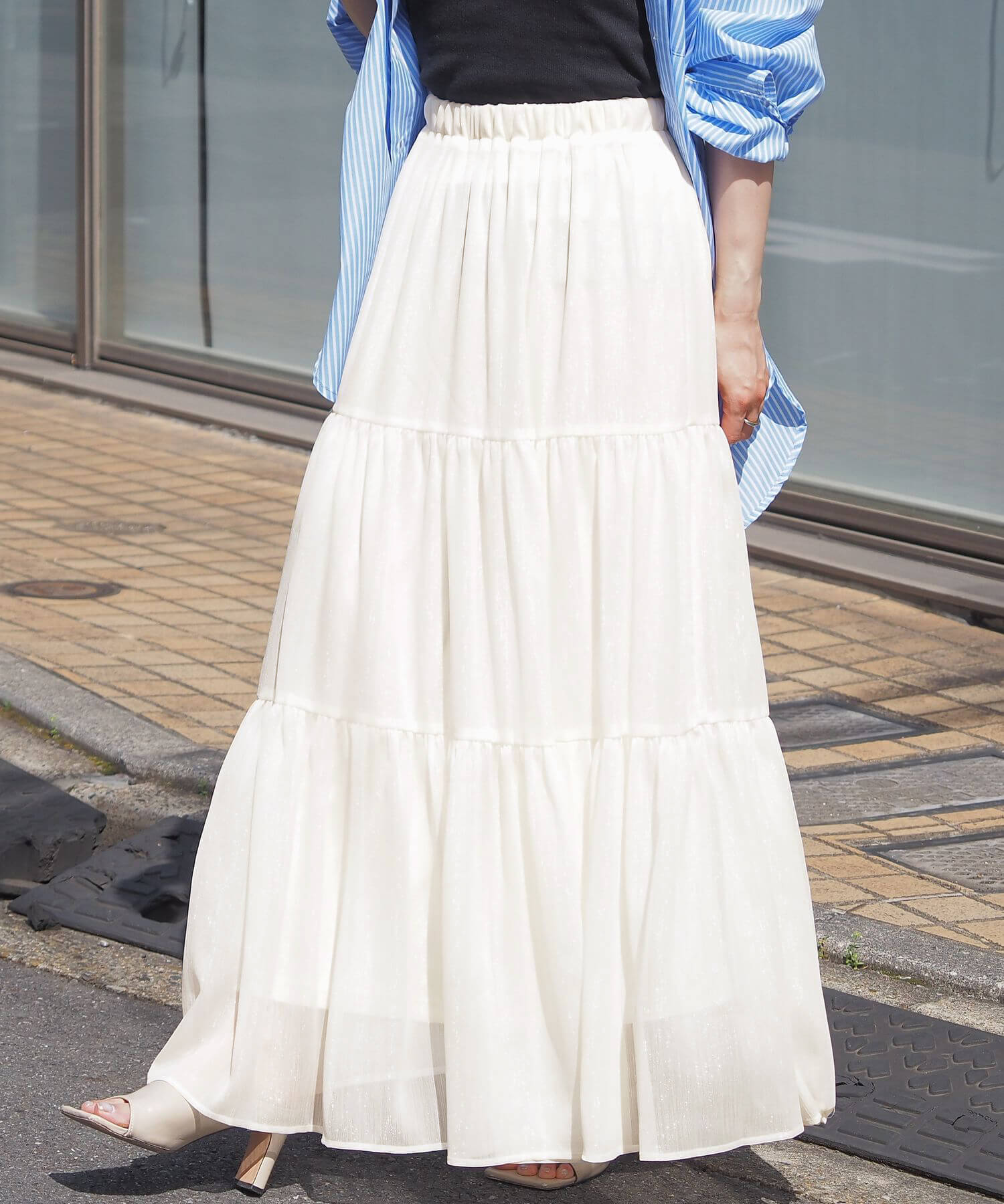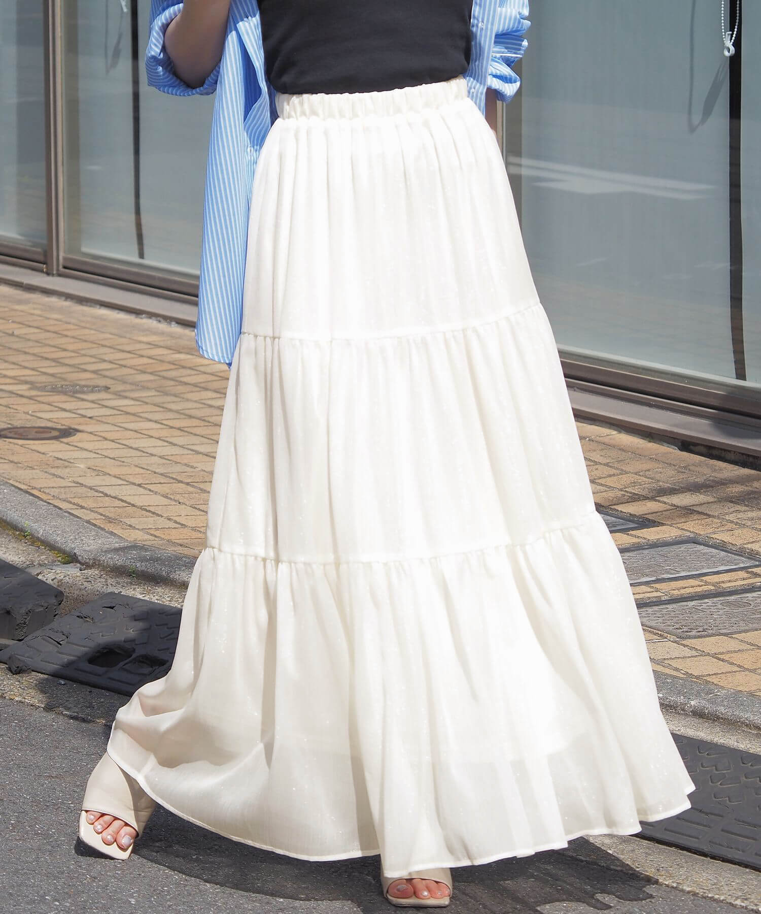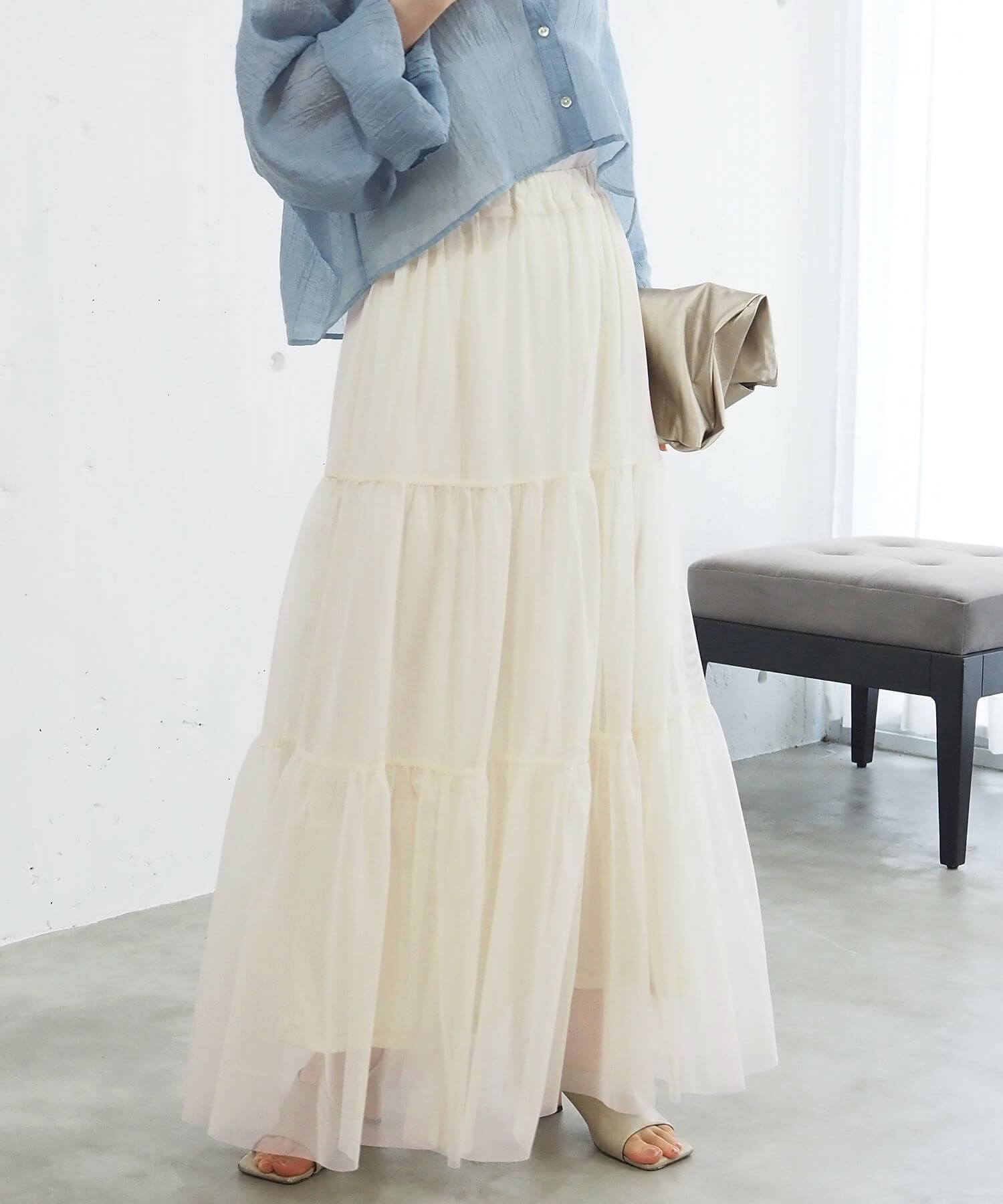 ・ふんわりとした素材感が女性らしいロング丈のティアードスカート。